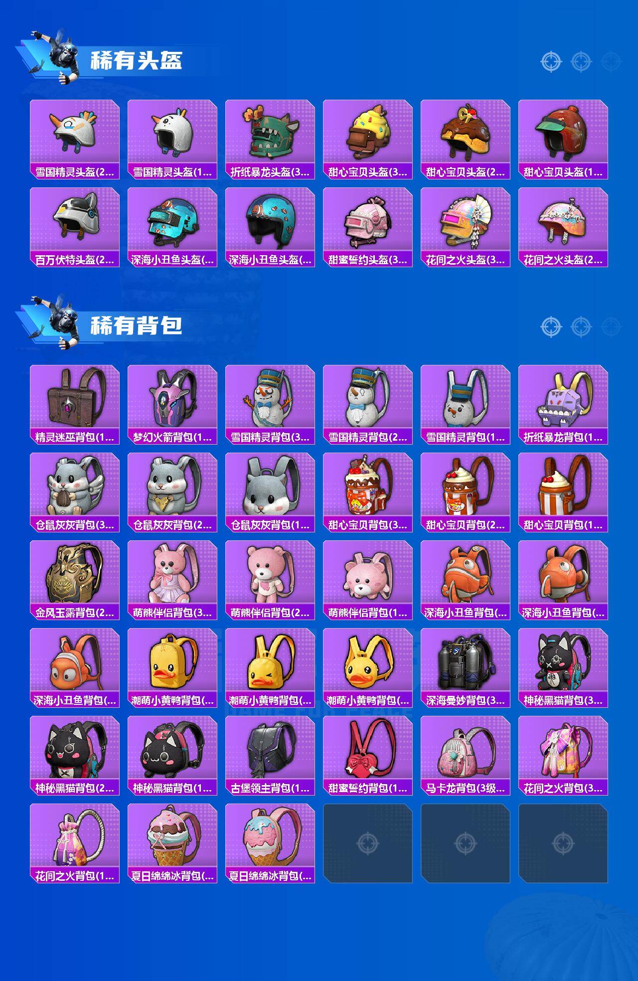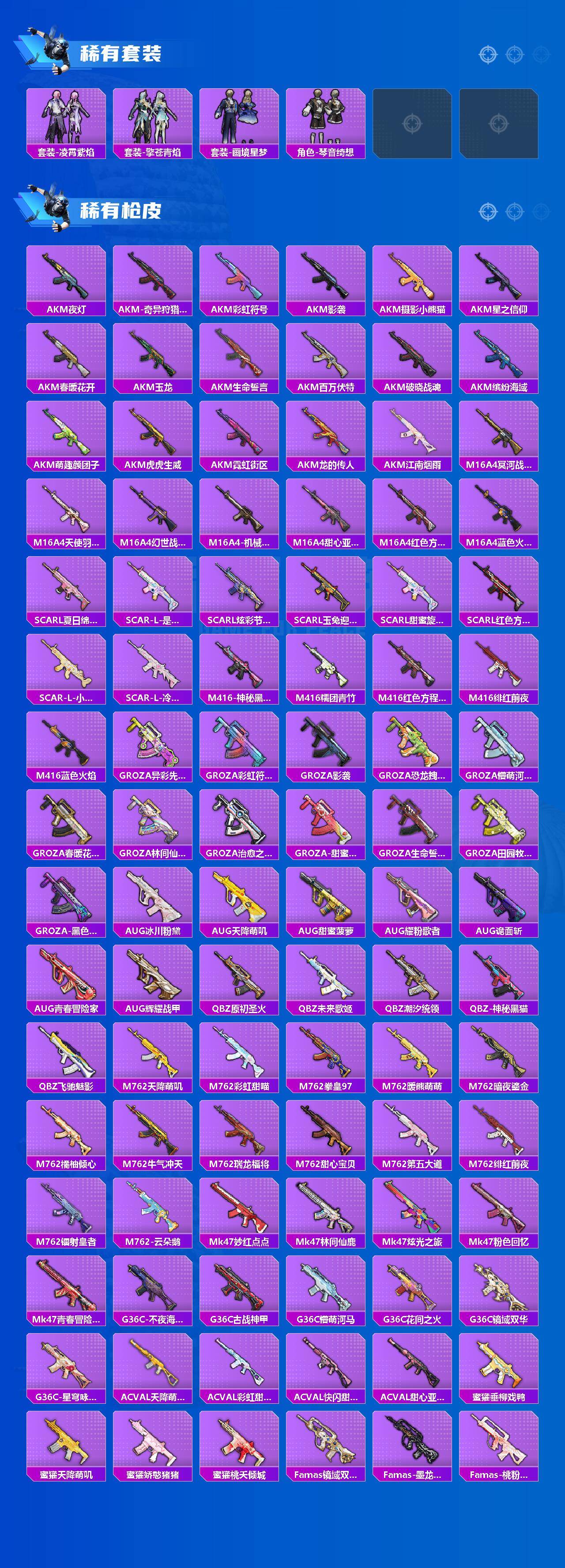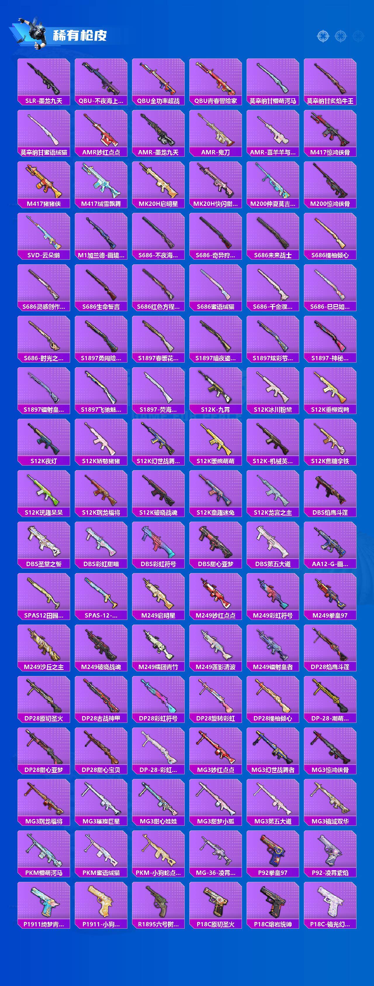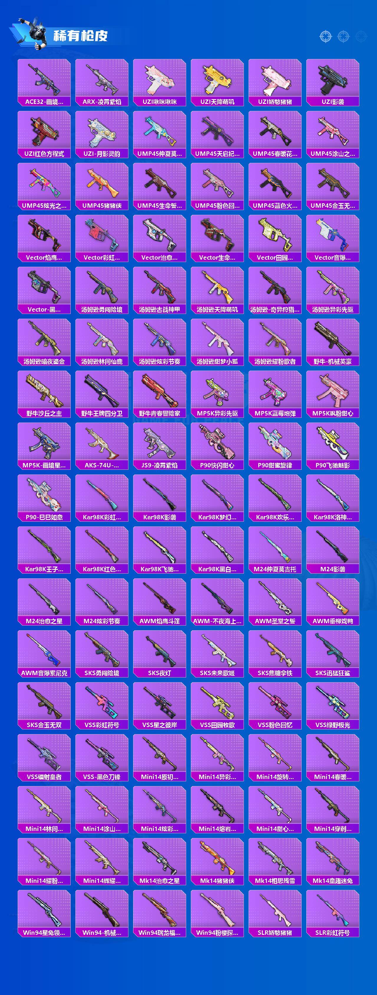 AKM-幽焰骑士,SCAR-L-青春物语,SCAR-L-桃夭倾城,M416-五爪金龙,M416-暖熊萌萌,M416-电玩时刻,M416-墨龙九天,GROZA-焦糖拿铁,GROZA-巴啦啦小魔仙,GROZA-精灵之光,AUG-暖羊咩咩,Vector-灵感创作师,P90-粉樱探戈,P90-沙丘之主,Kar98K-巳巳如意,M24-镜域双华,Mk14-精灵梦叶罗丽,M417-第五大道,M200-梦海之灵,MK12-雪月幻音,SPAS-12-蜜语绒猫,平底锅-仲夏莫吉托