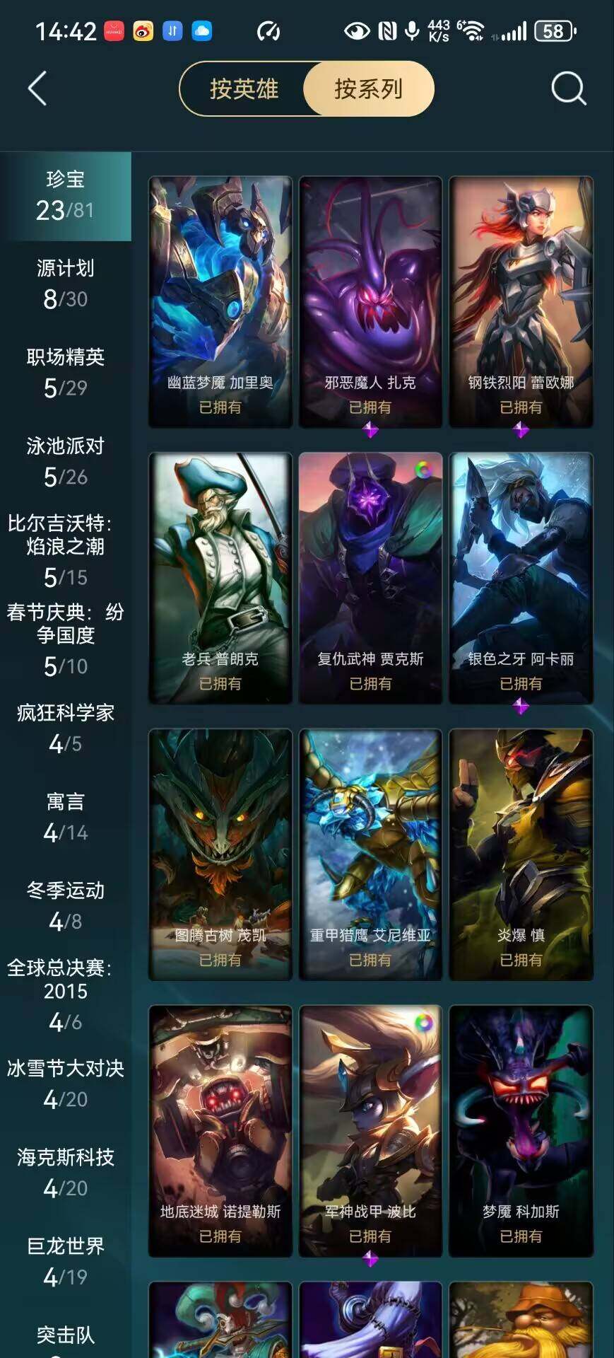 【冰雪限定】:幸福女神乐芙兰,圣诞开心鬼提莫,冬季仙境奥莉安娜,圣诞老人古拉加斯,圣诞驯鹿克格莫,魄罗骑士瑟庄妮,冰雪节玛尔扎哈