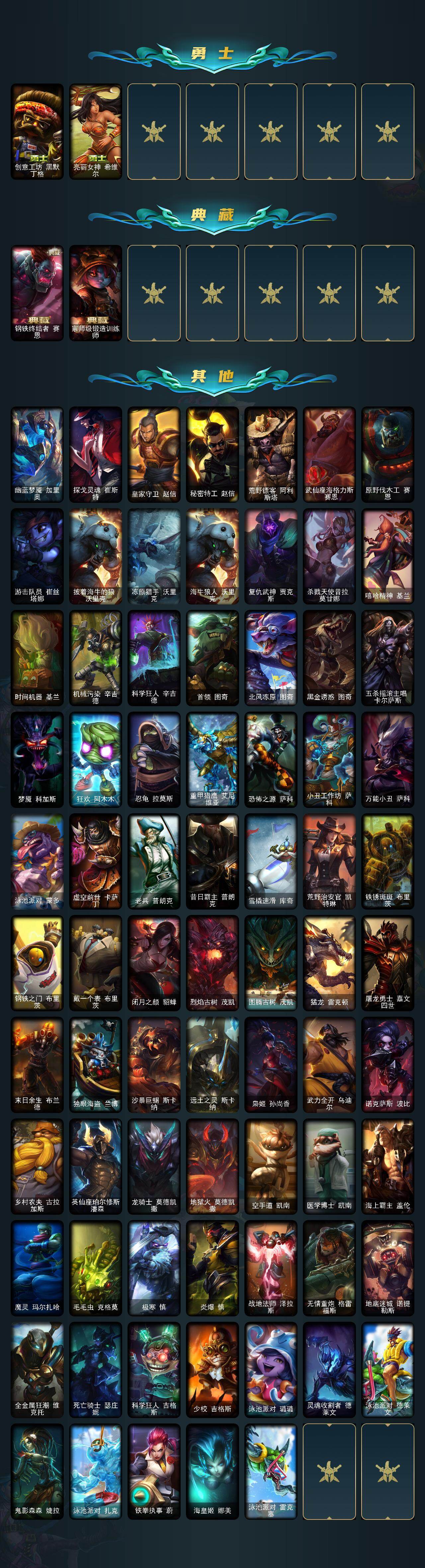 【其他皮肤1】:幽蓝梦魇加里奥,探戈灵魂崔斯特,皇家守卫赵信,秘密特工赵信,荒野镖客阿利斯塔,武仙座海格力斯赛恩,原野伐木工赛恩,游击队员崔丝塔娜,披着海牛的狼沃里克,冻原猎手沃里克,海牛狼人沃里克,复仇武神贾克斯,杀戮天使昔拉莫甘娜,嘻哈精神基兰,时间机器基兰,机械污染辛吉德,科学狂人辛吉德,首领图奇,北风冻原图奇