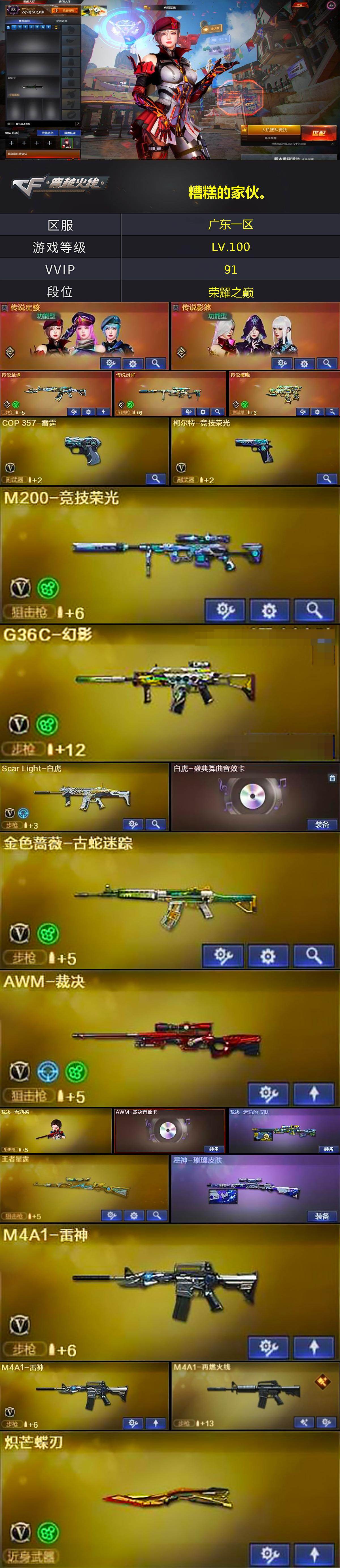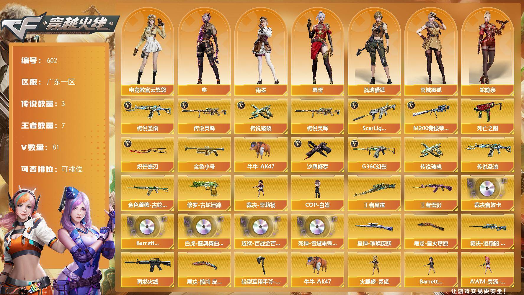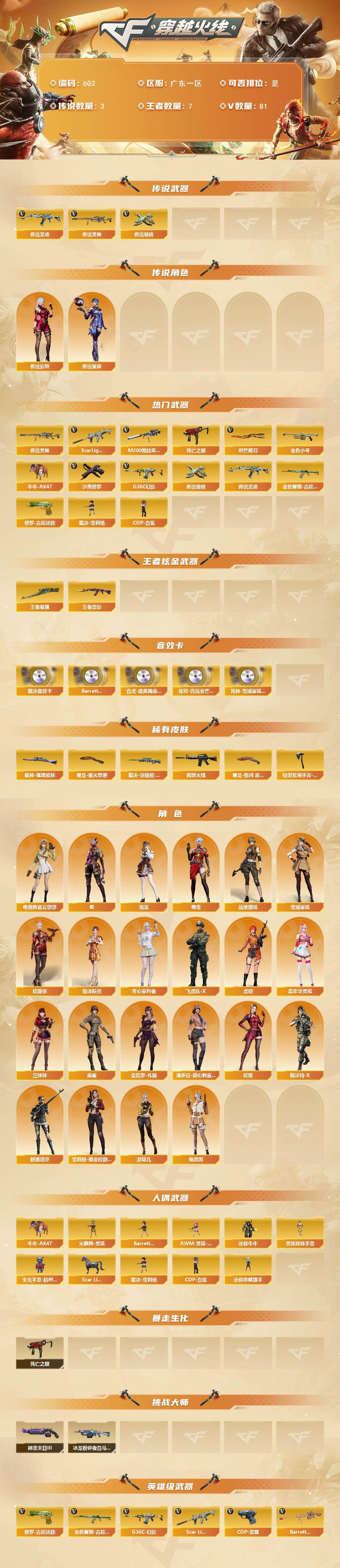 [15529102]广东一区-81V-7王者-0炫金 【传说武器】:传说圣谕,传说灵眸,传说破晓 【传说角色】:传说星骇,传说影煞 【热门武器】:传说灵眸,传说圣谕,传说破晓,G36C-幻影,Scar Light-白虎,金色蔷薇-古蛇迷踪,修罗-古蛇迷踪,M200-竞技荣光,死亡之眼,金色小号,牛牛-AK47,裁决-雪莉杨,COP-白鲨,沙鹰-修罗,炽芒蝶刃 【王者炫金武器】:王者雷影,王者星霆 【音效卡】:AWM-裁决音效卡,Barrett-碧霄极光音效卡,白虎-盛典舞曲音效卡,炼狱-百战金芒-庆典舞曲音效卡,死神-雪域霜狐-怀旧音效卡 【皮肤】:裁决-运输船 皮肤,星神-璀璨皮肤,M4A1-再燃火线,屠龙-星火燎原,屠龙-惊鸿 皮肤,轻型军用手斧-再燃火线 【角色】:电竞教官-云悠悠,隼,雨墨,战地猎狐,雪域霜狐,蛇隐宗,奇洋探员,芳心审判者,飞虎队-X,虎妞,嘉年华灵狐,兰妹妹,麻雀,曼陀罗-礼服,潘多拉-甜心教官,蛇姬,斯沃特-X,蜀雪,兔囡囡,新娜塔莎,雪莉杨-摸金校尉,游珑儿 【人偶武器】:COP-白鲨,裁决-雪莉杨,火麒麟-灵狐,迷你救赎猎手,Scar Light-马枪,AWM-灵狐-15周年嘉年华*2,牛牛-AK47,迷你牛牛,生化手雷-机甲核心*3,Barrett-夜玫瑰,灵狐娃娃手雷 【暴走生化】:死亡之眼 【挑战大师】:冰龙粉碎者-白马银枪,神圣爆裂者-末日III 【英雄级武器】:AK47-火麒麟,M4A1-黑龙,M4A1-雷神*2,AK12-天启,AN94-超新星,M4A1-龙血,Scar Light-白虎,QBZ03-天罚,无影-神兵利器,G36C-幻影,黑武士-锦绣游龙,金色蔷薇-古蛇迷踪,死神-雪域霜狐,黑骑士-海王,王者之烈-觉醒版,Barrett-毁灭,AWM-裁决,M200-竞技荣光,VSK-94-金蚀,Barrett-金色蔷薇,炼狱-百战金芒,AA-12-雷霆,沙鹰-修罗,沙鹰-天神*4,COP-雷霆,柯尔特-竞技荣光,修罗-古蛇迷踪,屠龙*2,麒麟刺*2,擎天-竞技荣光,炽芒蝶刃,麒麟刺-百战金芒,高爆手雷-竞技荣光*7,高爆手雷-云龙*2,手雷-云海游龙,手雷-热带奇洋,高爆手雷-古蛇迷踪,闪光弹-竞技荣光*10,闪光弹-云龙,闪光弹-雷霆王者-觉醒版,烟雾弹-竞技荣光*11,烟雾弹-云龙*2,烟雾弹-古蛇迷踪,烟雾弹-雷霆王者-觉醒版,M4