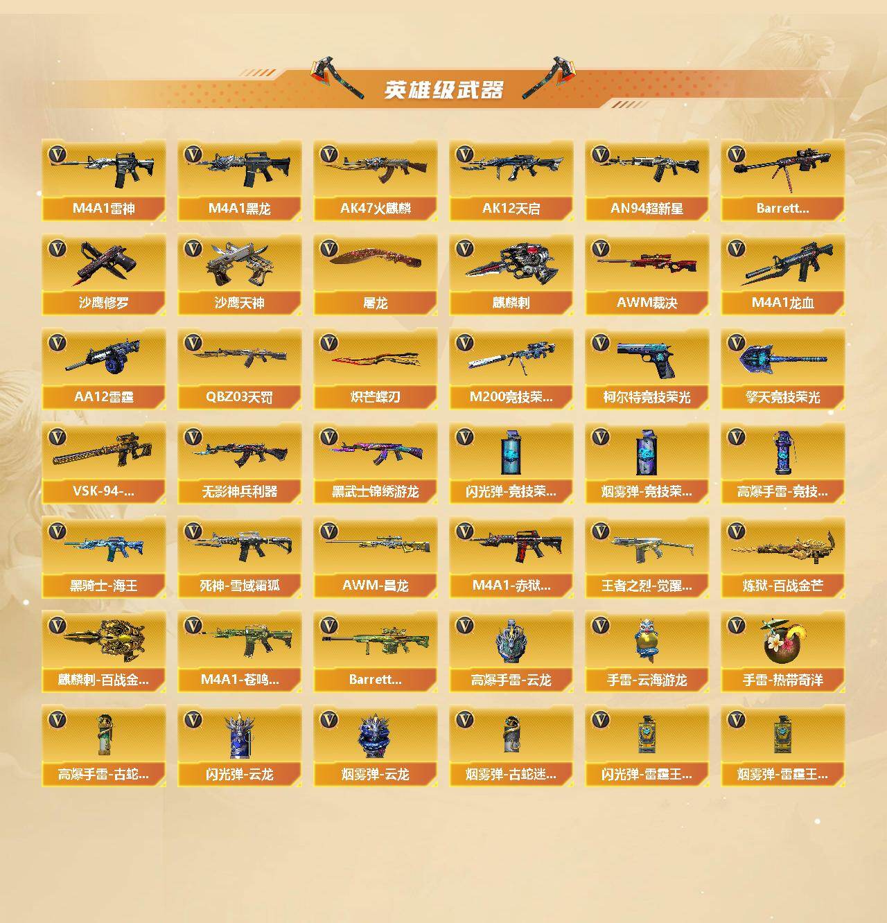 【英雄级武器】:AK47-火麒麟,M4A1-黑龙,M4A1-雷神*2,AK12-天启,AN94-超新星,M4A1-龙血,Scar Light-白虎,QBZ03-天罚,无影-神兵利器,G36C-幻影,黑武士-锦绣游龙,金色蔷薇-古蛇迷踪,死神-雪域霜狐,黑骑士-海王,王者之烈-觉醒版,Barrett-毁灭,AWM-裁决,M200-竞技荣光,VSK-94-金蚀,Barrett-金色蔷薇,炼狱-百战金芒,AA-12-雷霆,沙鹰-修罗,沙鹰-天神*4,COP-雷霆,柯尔特-竞技荣光,修罗-古蛇迷踪,屠龙*2,麒麟刺*2,擎天-竞技荣光,炽芒蝶刃,麒麟刺-百战金芒,高爆手雷-竞技荣光*7,高爆手雷-云龙*2,手雷-云海游龙,手雷-热带奇洋,高爆手雷-古蛇迷踪,闪光弹-竞技荣光*10,闪光弹-云龙,闪光弹-雷霆王者-觉醒版,烟雾弹-竞技荣光*11,烟雾弹-云龙*2,烟雾弹-古蛇迷踪,烟雾弹-雷霆王者-觉醒版,M4