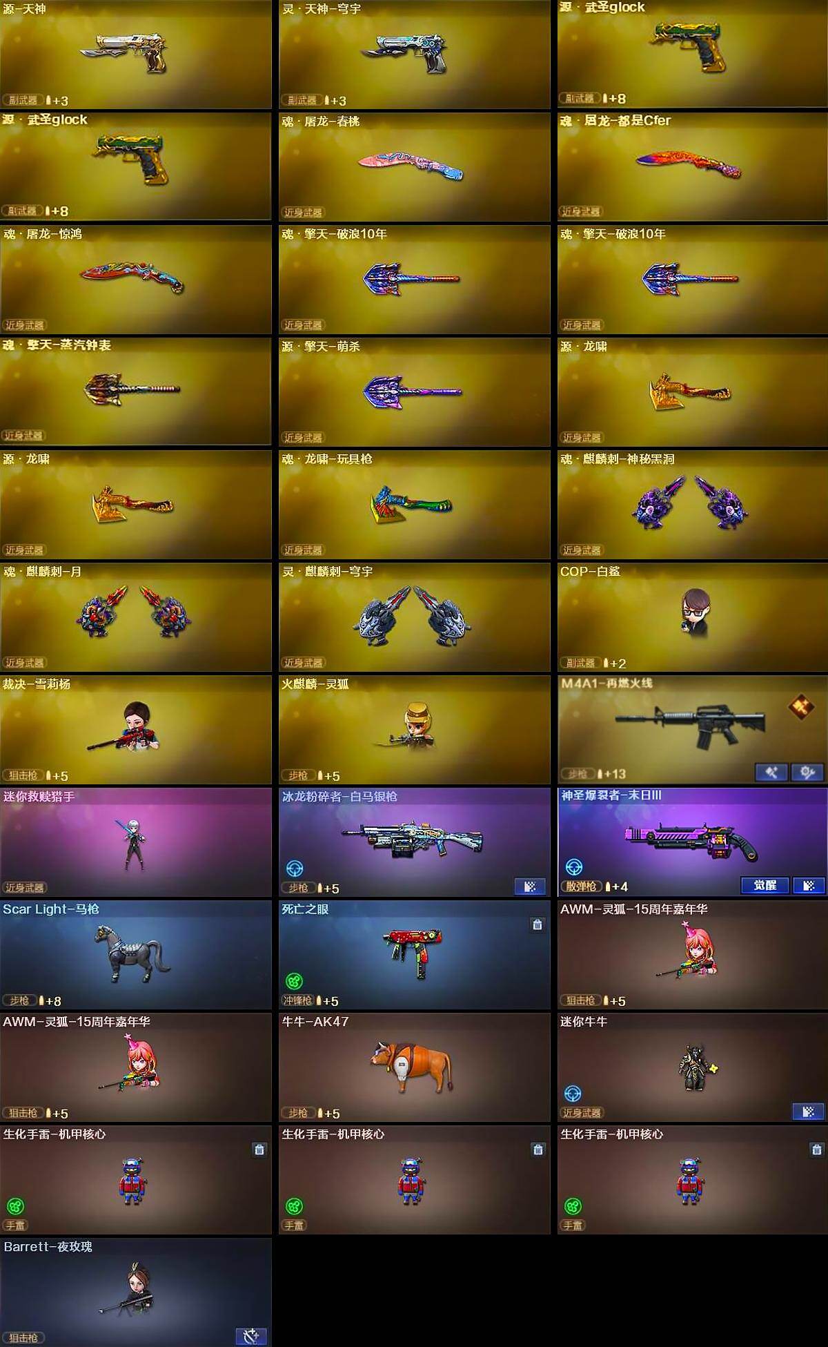 【人偶武器】:COP-白鲨,裁决-雪莉杨,火麒麟-灵狐,迷你救赎猎手,Scar Light-马枪,AWM-灵狐-15周年嘉年华*2,牛牛-AK47,迷你牛牛,生化手雷-机甲核心*3,Barrett-夜玫瑰,灵狐娃娃手雷