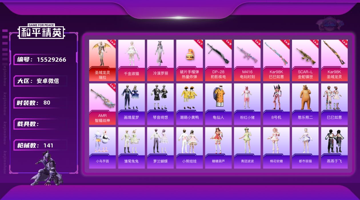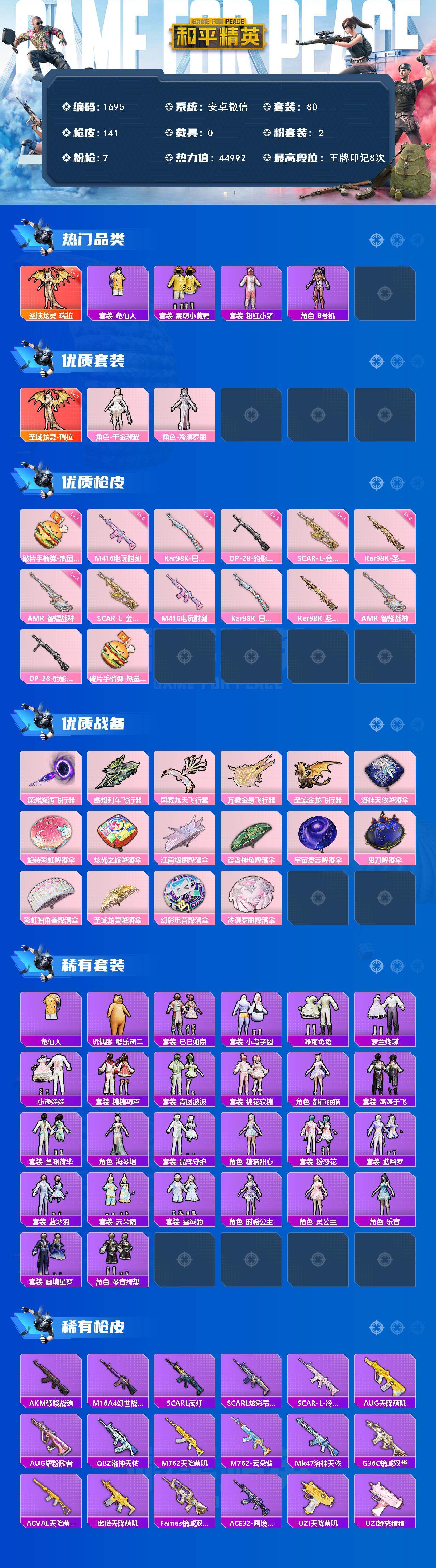 [15529266]【1695】安卓 微信-1神装-2粉装-7特效枪-0载具-5粉色飞行器-44992热力值-8王牌印记-80套装-141枪皮 【红色神装等级】:圣域龙灵-瑞拉(三级) 【红色角色神装】:圣域龙灵-瑞拉 【热门品类】:套装-龟仙人,套装-潮萌小黄鸭,套装-粉红小猪,角色-8号机 【粉色套装】:角色-千金淑猫,角色-冷漠罗丽 【粉色枪皮等级】:SCAR-L-金蛇镇世(三级),M416-电玩时刻(五级),Kar98K-巳巳如意(五级),Kar98K-圣域龙灵(三级),AMR-智耀战神(三级),DP-28-豹影疾电(五级),破片手榴弹-热量炸弹(七级) 【粉色枪皮】:SCAR-L-金蛇镇世,M416-电玩时刻,Kar98K-巳巳如意,Kar98K-圣域龙灵,AMR-智耀战神,DP-28-豹影疾电,破片手榴弹-热量炸弹 【粉色飞行器】:深渊漩涡飞行器,幽焰列车飞行器,凤舞九天飞行器,万象金身飞行器,圣域金龙飞行器 【粉色降落伞】:洛神天依降落伞,旋转彩虹降落伞,炫光之旅降落伞,江南烟雨降落伞,忍者神龟降落伞,宇宙意志降落伞,鬼刀降落伞,彩虹独角兽降落伞,圣域龙灵降落伞,幻彩电音降落伞,冷漠罗丽降落伞 【稀有套装】:套装-龟仙人,玩偶服-憨乐熊二,套装-巳巳如意,套装-小鸟芋圆,套装-雪国风尚,套装-雏菊兔兔,套装-萝兰蝴蝶,套装-小熊娃娃,套装-糖糖葫芦,套装-青团波波,套装-棉花软糖,角色-都市丽猫,套装-燕燕于飞,套装-鱼渊荷华,角色-海琴烟,套装-晶辉守护,角色-糖霜甜心,套装-粉恋花,套装-紫幽梦,套装-蓝冰羽,套装-云朵鹅,套装-雪绒豹,角色-时希公主,角色-灵公主,角色-乐音,套装-画境星梦,套装-琴音绮想 【稀有枪皮】:AKM-破晓战魂,M16A4-幻世战舞者,SCAR-L-夜灯,SCAR-L-炫彩节奏,SCAR-L-冷漠罗丽,AUG-天降萌叽,AUG-耀粉歌者,QBZ-洛神天依,M762-天降萌叽,M762-云朵鹅,Mk47-洛神天依,G36C-镜域双华,AC-VAL-天降萌叽,蜜獾-天降萌叽,Famas-镜域双华,ACE32-画境星梦,UZI-天降萌叽,UZI-娇憨猪猪,UZI-盛世惊鸿,UMP45-夜灯,UMP45-炫光之旅,UMP45-绒宝小鹅,Vector-焰鹰斗篷,汤姆逊-天降萌叽,MP5K-画境星梦,P90-金蛇镇世,P90-巳巳如意,Kar98K