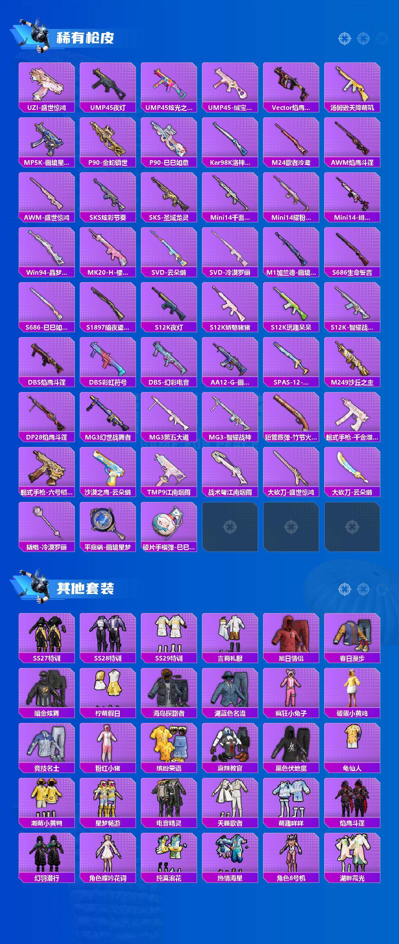 【稀有枪皮】:AKM-破晓战魂,M16A4-幻世战舞者,SCAR-L-夜灯,SCAR-L-炫彩节奏,SCAR-L-冷漠罗丽,AUG-天降萌叽,AUG-耀粉歌者,QBZ-洛神天依,M762-天降萌叽,M762-云朵鹅,Mk47-洛神天依,G36C-镜域双华,AC-VAL-天降萌叽,蜜獾-天降萌叽,Famas-镜域双华,ACE32-画境星梦,UZI-天降萌叽,UZI-娇憨猪猪,UZI-盛世惊鸿,UMP45-夜灯,UMP45-炫光之旅,UMP45-绒宝小鹅,Vector-焰鹰斗篷,汤姆逊-天降萌叽,MP5K-画境星梦,P90-金蛇镇世,P90-巳巳如意,Kar98K