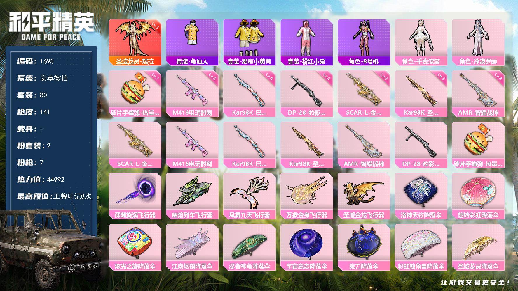 [15529266]【1695】安卓 微信-1神装-2粉装-7特效枪-0载具-5粉色飞行器-44992热力值-8王牌印记-80套装-141枪皮
