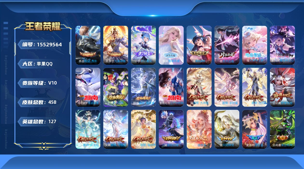 - [11933891]V10 2典藏 2无双 59传说 126英雄 440皮肤 典藏英雄武则天 可修改实名 优质装备:天鹅之梦(小乔典藏),杀手不太冷,韩信群星魔术团(韩信无双),天机白泽,黄金狮子座,黄金射手座,冠军飞将,云鹰飞将(小将军),黄金白羊座,猫影幻舞,久胜战神,炽阳神光,一念神魔,云霓雀翎,末日机甲-孙尚香(绿蚂蚱),地狱火,仲夏夜之梦(大飞蛾),地狱之眼,飞鸢探春,音你心动-周瑜,胖达荣荣,李逍遥,乞巧织情,时之恋人-刘备(电焊工),游龙清影(小青龙),超时空战士-狄仁杰,末日机甲-孙策,花朝如约(花篮子),无双飞将,神器·狴犴令,灼幽烈阳,惊梅引,小动物乐团,霜月吟,澜逐花归海,艾琳觅芳踪,金乌负日,黄金天蝎座,牧神诗旅 传说皮:乘龙·问璇玑(孙尚香年限),乘龙·铭钟鼎(赵云年限),乘龙·淬吴钩(孙策年限),貂蝉曦玄引,吕布曦玄引,典韦战鼓燎原,落雪白狼,九山相柳,云诺千山,祥瑞亨通,幻光神枪 珍宝阁皮:妄想食味,女武神,玩趣恶龙 限定皮:愿照·千秋盛(女娲年限),鸣野蒿,至尊宝,白虎志(电光耗子),凤求凰(白切鸡),凤凰于飞,太华(伽罗年限),武陵仙君(小桃花),傲雪梅枪,时之彼端,白鹤梁神女,神威(电光马子),飞衡(韩信年限),玄嵩(庄周年限),山海·碧波行(瑶年限),遇见飞天,高山流水,诗剑行,怒海麟威,五谷丰年,幽恒(沐浴露),梁祝,御风骁将(吕布年限),岱宗(典韦年限),天狼征服者,天狼绘梦者,李小龙,逐梦之影,朱雀志(守约年限),永曜之星,辉光之辰,如梦令-嫦娥,如梦令-后羿,圣诞老人,一生所爱,大圣娶亲,天魔缭乱,冰霜恋舞曲,乒乒小将,蜜橘之夏,时之祈愿-瑶(瑶传限),枫霜尽,山海·玄木吟(马可年限) 史诗皮:赞萌露比,苍鳞隐世,灵蛊蚀心,星界战将,龙之律动,石田雨龙,百相守梦-周瑜,幻珠鲛人,奇遇星旅,蔬乡物语(鲁班七号),乘龙·聚宝船(安琪拉年限),乘龙·忆丹青(大乔年限),百相守梦-黄忠,遇见神鹿,紫霞仙子,苍穹之光,电玩小子(小书包),白龙吟,黄金分割率,特工魅影,千年之狐,永昼,魅语,高渐离燃音魔法,蒙恬荣光圣徽,无限星赏官,冰冠公主,青蛇,偶像歌手,白蛇,晚萤,龙骑士(小龙虾),末日机甲-吕布,猫狗日记-孙策,猫狗日记-大乔,时之恋人-孙尚香,乱世虎臣,节奏热浪,修罗,女仆咖啡,摇滚巨星,水果甜心,绅士熊喵,天才门将,星夜王子,心灵骇客,功