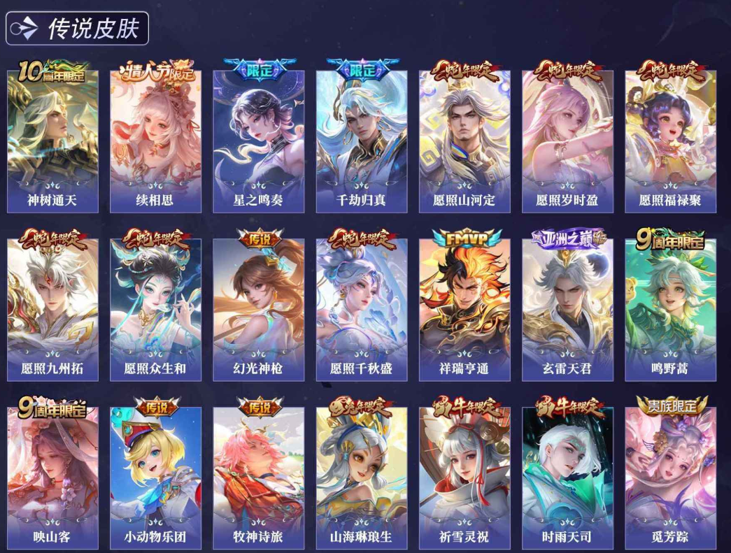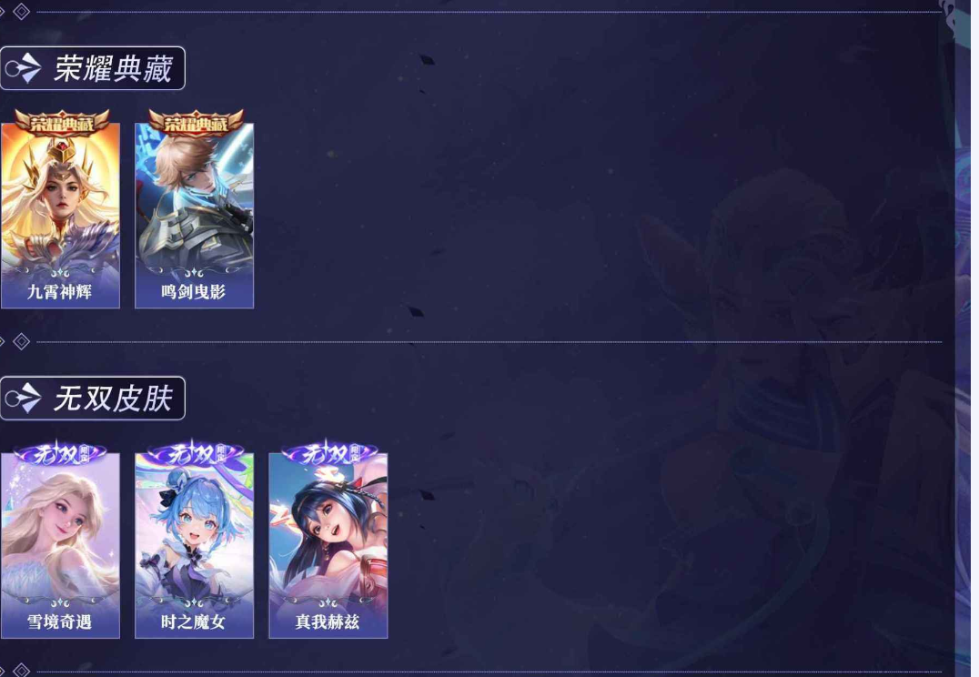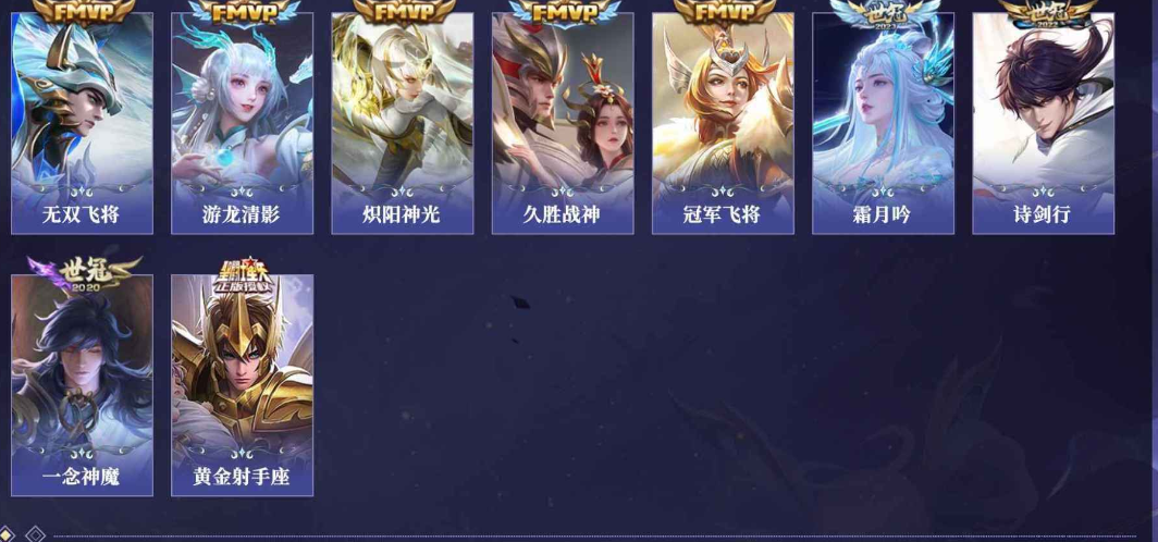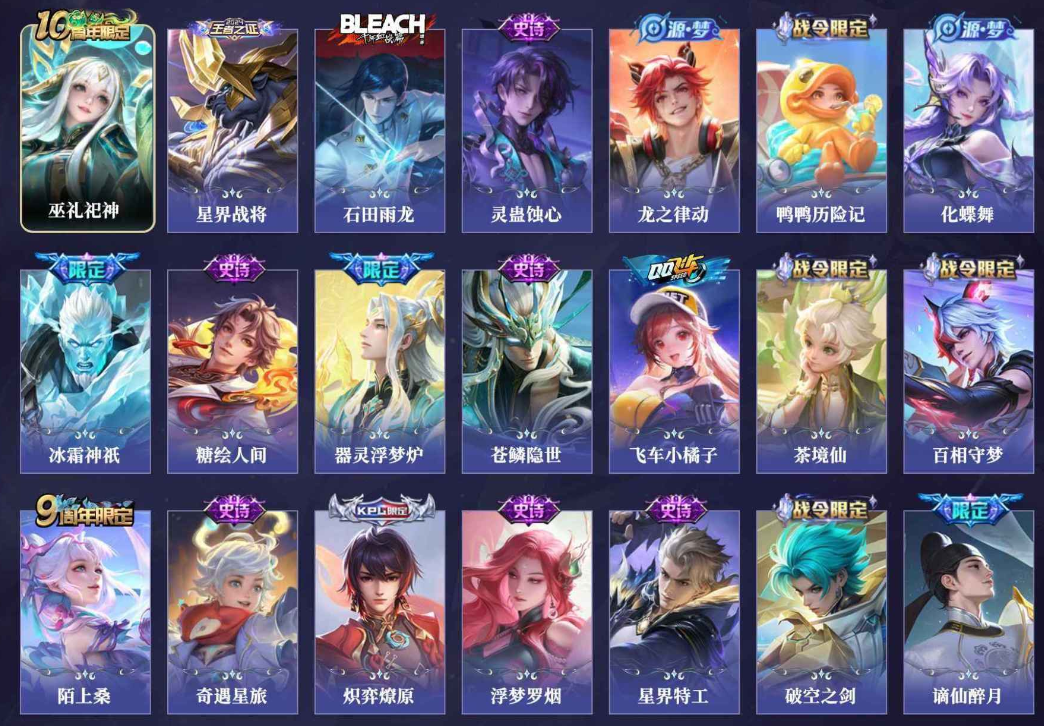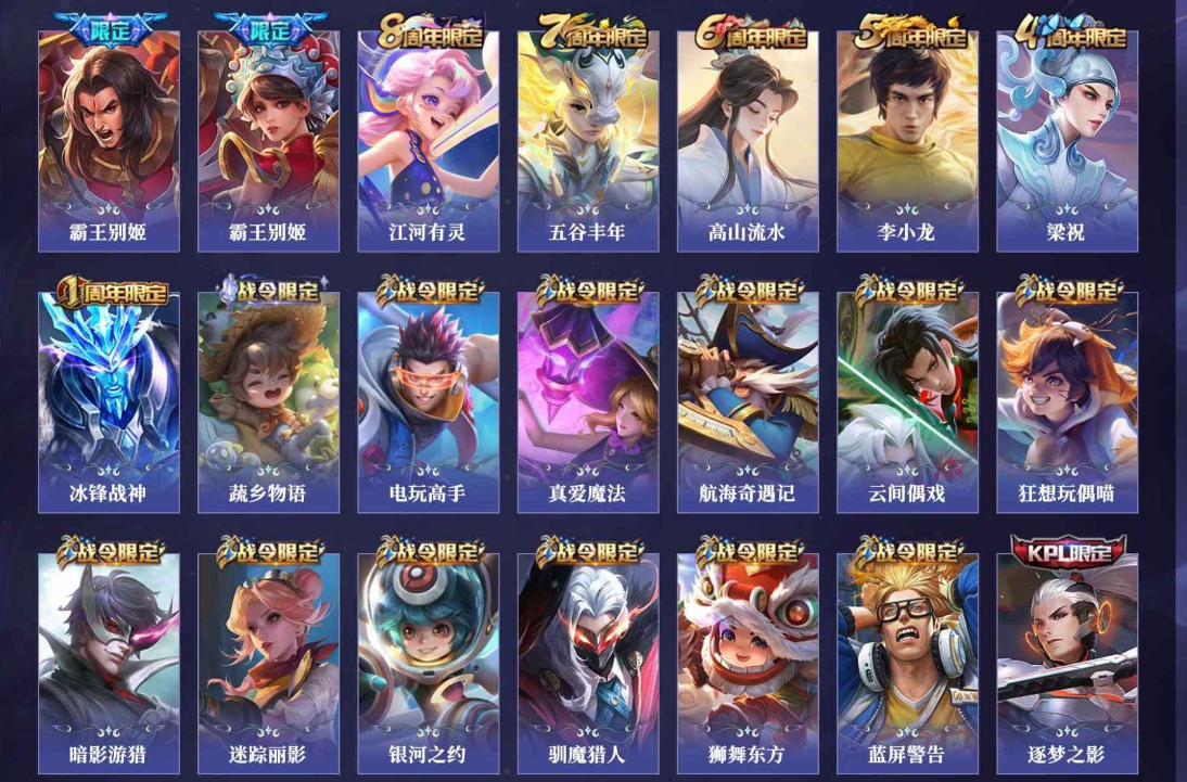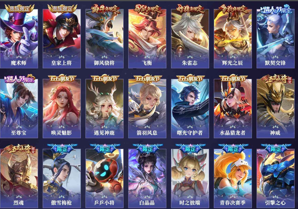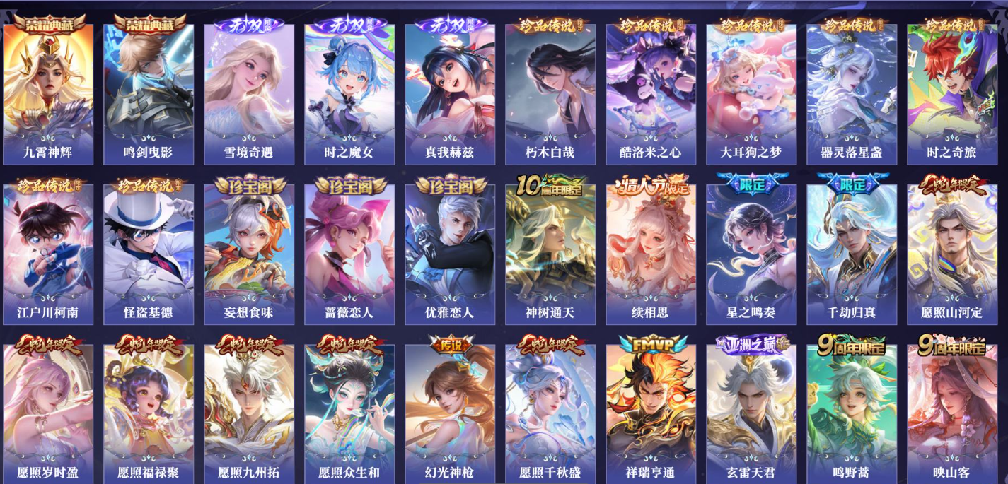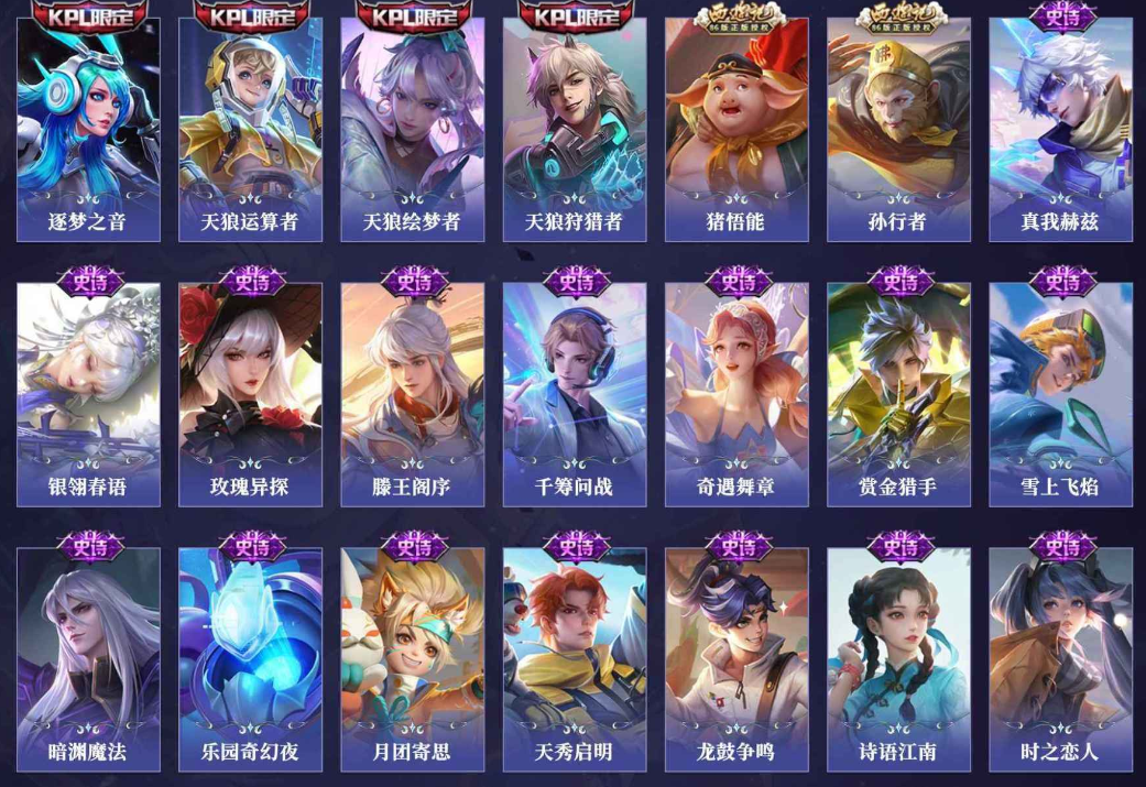 关羽冰锋战神,裴擒虎李小龙,上官婉儿梁祝,貂蝉逐梦之音,公孙离祈雪灵祝,吕布御风骁将,诸葛亮时雨天司,黄忠烈魂,马超神威,后羿辉光之辰,韩信飞衡,裴擒虎天狼狩猎者,孙膑天狼运算者,上官婉儿天狼绘梦者,韩信逐梦之影,百里守约朱雀志,项羽霸王别姬,虞姬霸王别姬,花木兰默契交锋,孙悟空至尊宝,雅典娜神奇女侠,花木兰青春决赛季,妲己时之彼端,公孙离蜜橘之夏,芈月白晶晶,赵云引擎之心,鲁班七号乒乒小将,猪八戒猪悟能,孙悟空孙行者,韩信傲雪梅枪,不知火舞绯月行,李白诗剑行,盘古冰霜神祇,桑启鸣野蒿,艾琳陌上桑,王昭君映山客,澜愿照·九州拓,蔡文姬愿照·福禄聚,虞姬愿照·岁时盈,司空震愿照·山河定,妲己愿照·众生和,女娲愿照·千秋盛