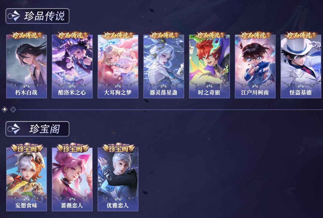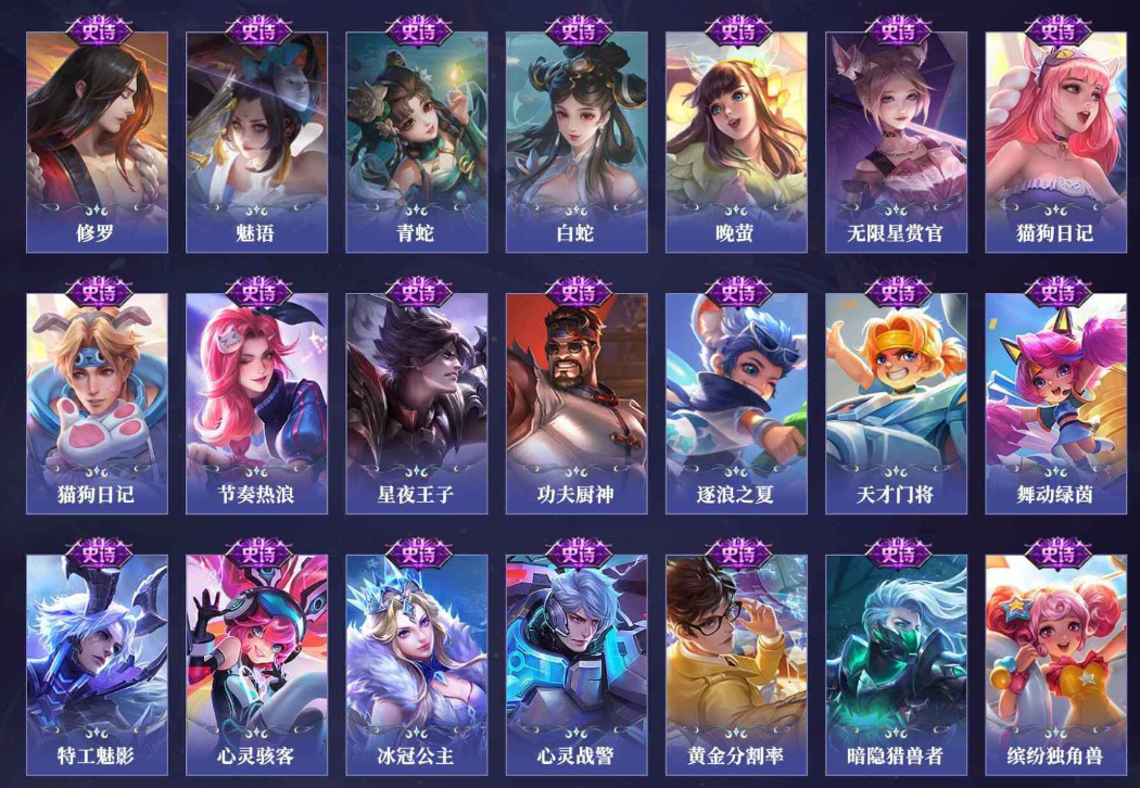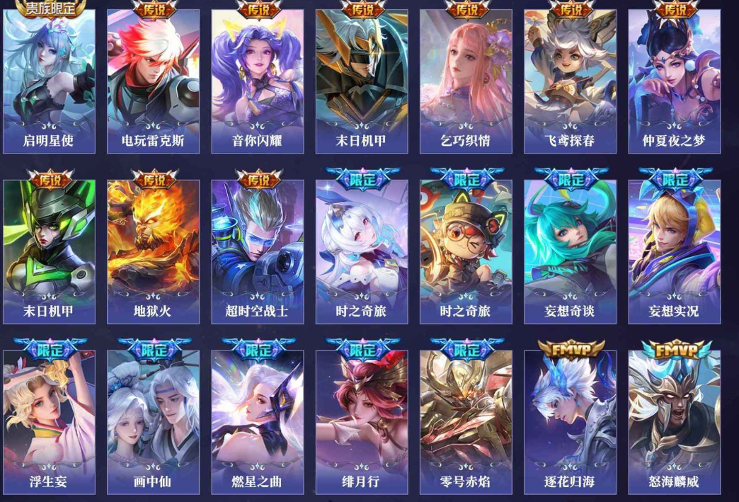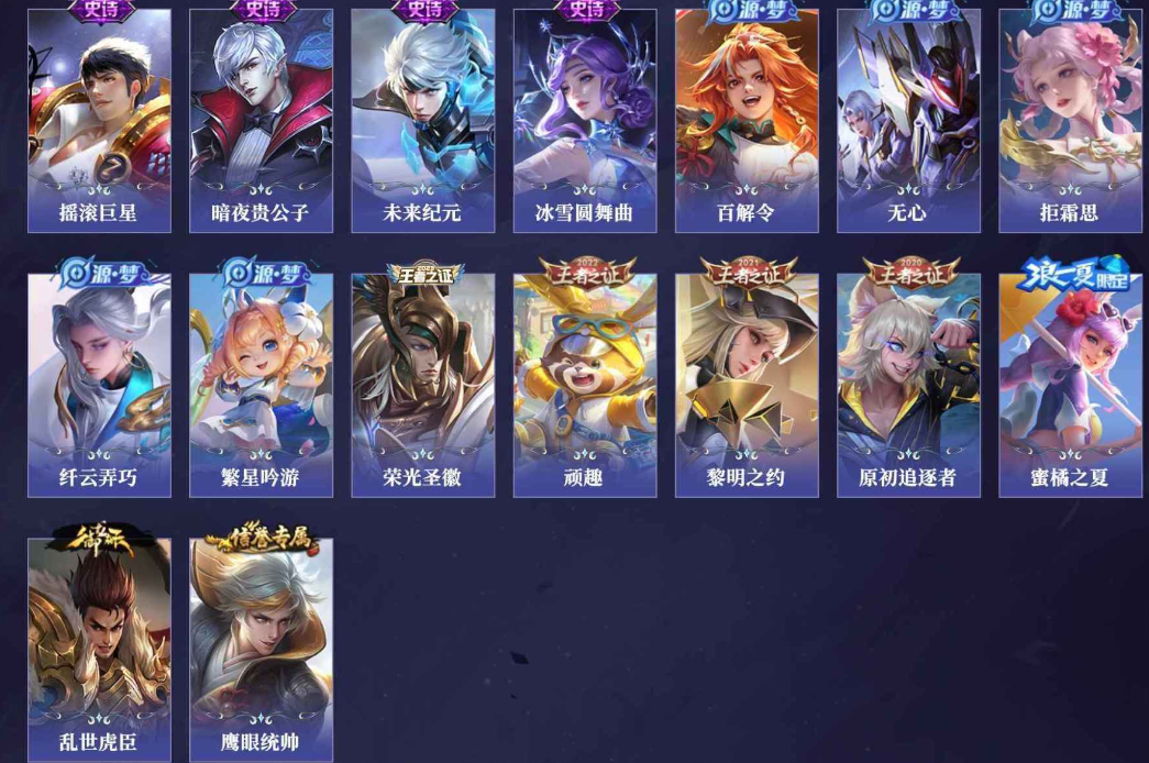 小乔青蛇,大乔白蛇,瑶遇见神鹿,娜可露露晚萤,伽罗箭羽风息,李元芳逐浪之夏,不知火舞魅语,公孙离无限星赏官,大乔猫狗日记,孙策猫狗日记,阿轲节奏热浪,露娜紫霞仙子,诸葛亮黄金分割率,王昭君偶像歌手,韩信白龙吟,项羽苍穹之光,孙尚香时之恋人,阿轲暗夜猫娘,雅典娜冰冠公主,吕布末日机甲,鲁班七号电玩小子,蒙犽龙鼓争鸣,橘右京修罗,墨子龙骑士,嬴政摇滚巨星,刘禅绅士熊喵,刘禅天才门将,白起星夜王子,安琪拉心灵骇客,程咬金功夫厨神,刘邦德古拉伯爵,兰陵王暗隐猎兽者,曹操幽灵船长,宫本武藏鬼剑武藏,司马懿暗渊魔法,亚瑟心灵战警,钟馗乐园奇幻夜,杨戬天秀·启明,蔡文姬舞动绿茵,廉颇地狱岩魂,西施诗语江南,小乔缤纷独角兽,夏侯惇乘风破浪,花木兰水晶猎龙者,铠曙光守护者,墨子金属风暴,百里玄策原初追逐者,吕布圣诞狂欢,貂蝉圣诞恋歌,百里守约特工魅影,嬴政暗夜贵公子,嫦娥拒霜思,雅典娜黎明之约,李白千年之狐,哪吒雪上飞焰,澜赏金猎手,艾琳奇遇舞章,貂蝉唤灵魅影,张良千筹问战,弈星滕王阁序,镜玫瑰异探,杨玉环银翎春语,海月浮梦罗烟,百里守约真我赫兹,蒙犽百解令,桑启奇遇星旅,李白谪仙醉月,姬小满飞车小橘子,白起苍鳞隐世,赵怀真器灵·浮梦炉,亚连糖绘人间