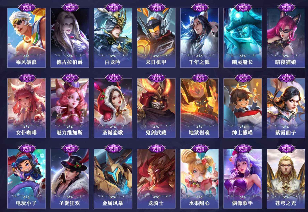 白起狰,太乙真人饕餮,曹操烛龙,芈月重明,典韦穷奇,狂铁御狮,米莱狄御霄,牛魔御旌,盾山御銮,夏侯惇朔风刀,明世隐疑决卦,老夫子醍醐杖,鬼谷子原初探秘者,狄仁杰万华元夜,程咬金演武夺筹,钟馗驱傩正仪,苏烈千军破阵,女娲朔望之晖,典韦蓝屏警告,钟馗神迹守卫,鲁班七号狮舞东方,沈梦溪星空之诺,李元芳银河之约,刘邦夺宝奇兵,马可波罗暗影游猎,蒙犽狂想玩偶喵,元歌云间偶戏,弈星混沌棋,达摩沙漠行僧,兰陵王金庭之子,沈梦溪大漠名商,李元芳云中旅人,桑启海盐诗旅,裴擒虎擒涛扼浪,鲁班大师探海日志,张良古海寻踪