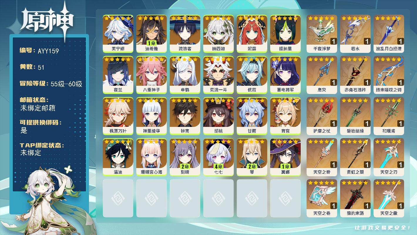 [15530631]60级/51黄/女主/24个五星角色/17个五星武器 0命芙宁娜,1命迪希雅,0命流浪者,0命纳西妲,0命妮露,0命提纳里,0命夜兰,0命八重神子,0命申鹤,0命荒泷一斗,0命优菈,0命雷电将军,0命枫原万叶,0命神里绫华,0命钟离,0命胡桃,0命甘雨,0命宵宫,0命温迪,0命珊瑚宫心海,2命刻晴,4命七七,2命琴,1命莫娜,精1千夜浮梦,精1若水,精1波乱月白经津,精1息灾,精1赤角石溃杵,精1终末嗟叹之诗,精1护摩之杖,精1磐岩结绿,精1和璞鸢,精1天空之脊,精1贯虹之槊,精1天空之刃,精1天空之卷,精1狼的末路,精1天空之傲