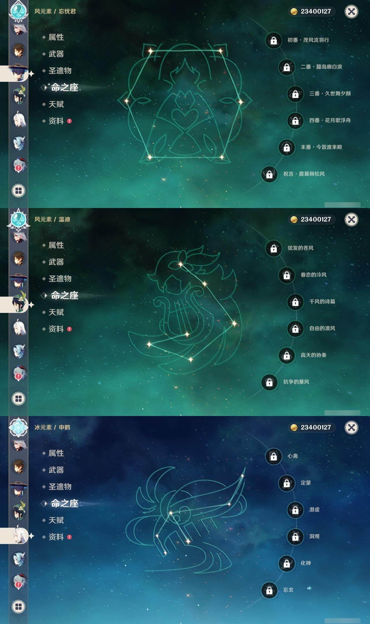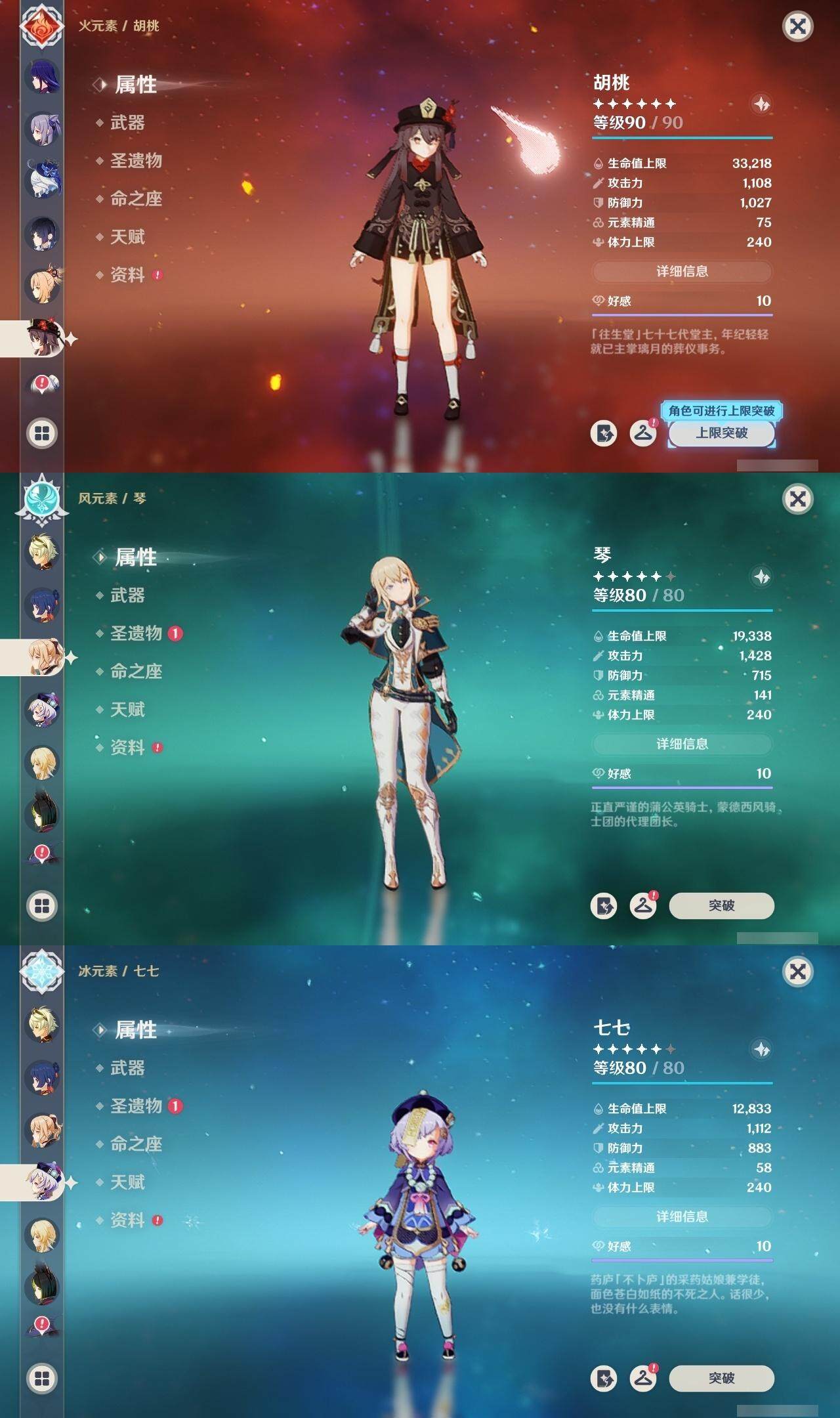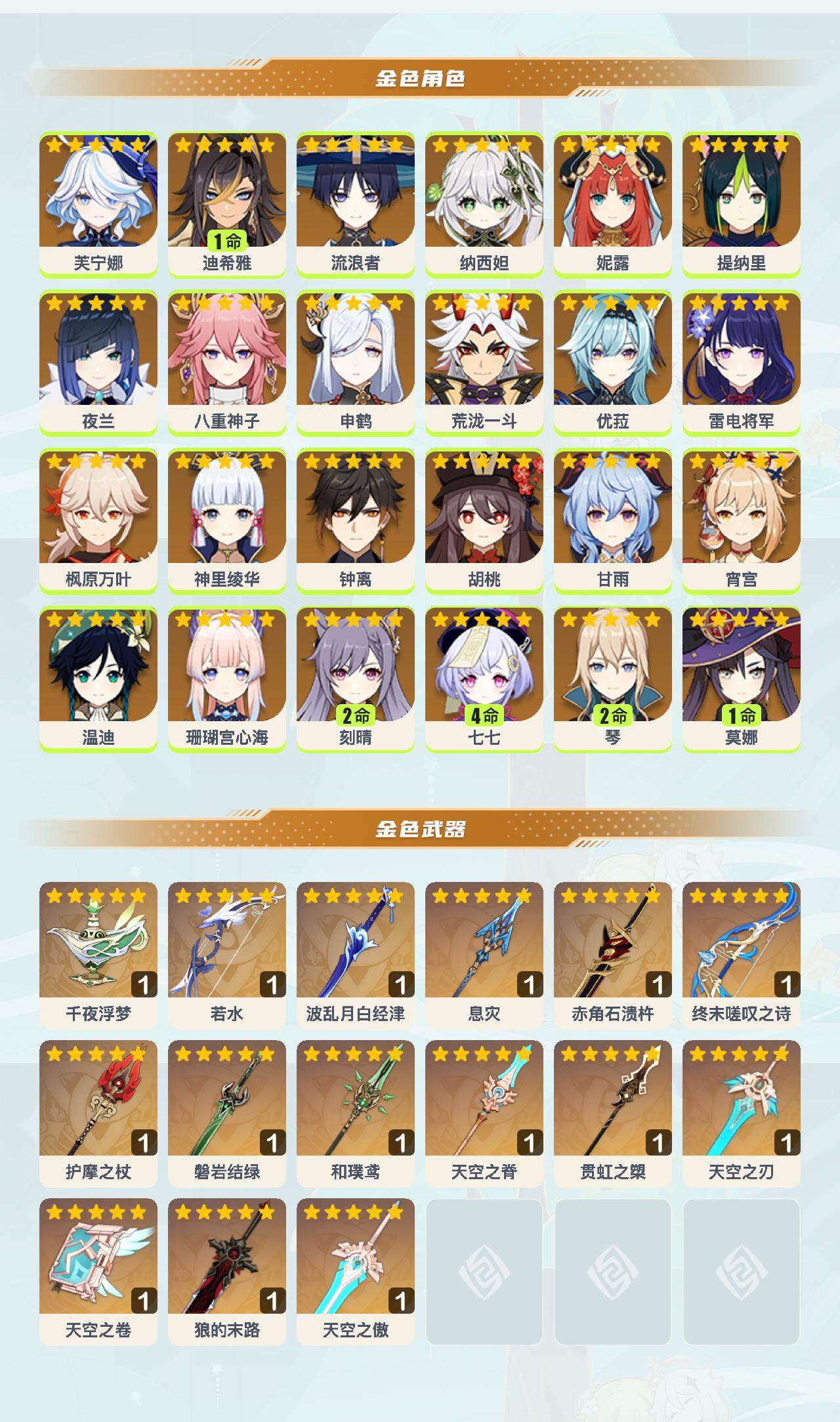 0命芙宁娜,1命迪希雅,0命流浪者,0命纳西妲,0命妮露,0命提纳里,0命夜兰,0命八重神子,0命申鹤,0命荒泷一斗,0命优菈,0命雷电将军,0命枫原万叶,0命神里绫华,0命钟离,0命胡桃,0命甘雨,0命宵宫,0命温迪,0命珊瑚宫心海,2命刻晴,4命七七,2命琴,1命莫娜,精1千夜浮梦,精1若水,精1波乱月白经津,精1息灾,精1赤角石溃杵,精1终末嗟叹之诗,精1护摩之杖,精1磐岩结绿,精1和璞鸢,精1天空之脊,精1贯虹之槊,精1天空之刃,精1天空之卷,精1狼的末路,精1天空之傲