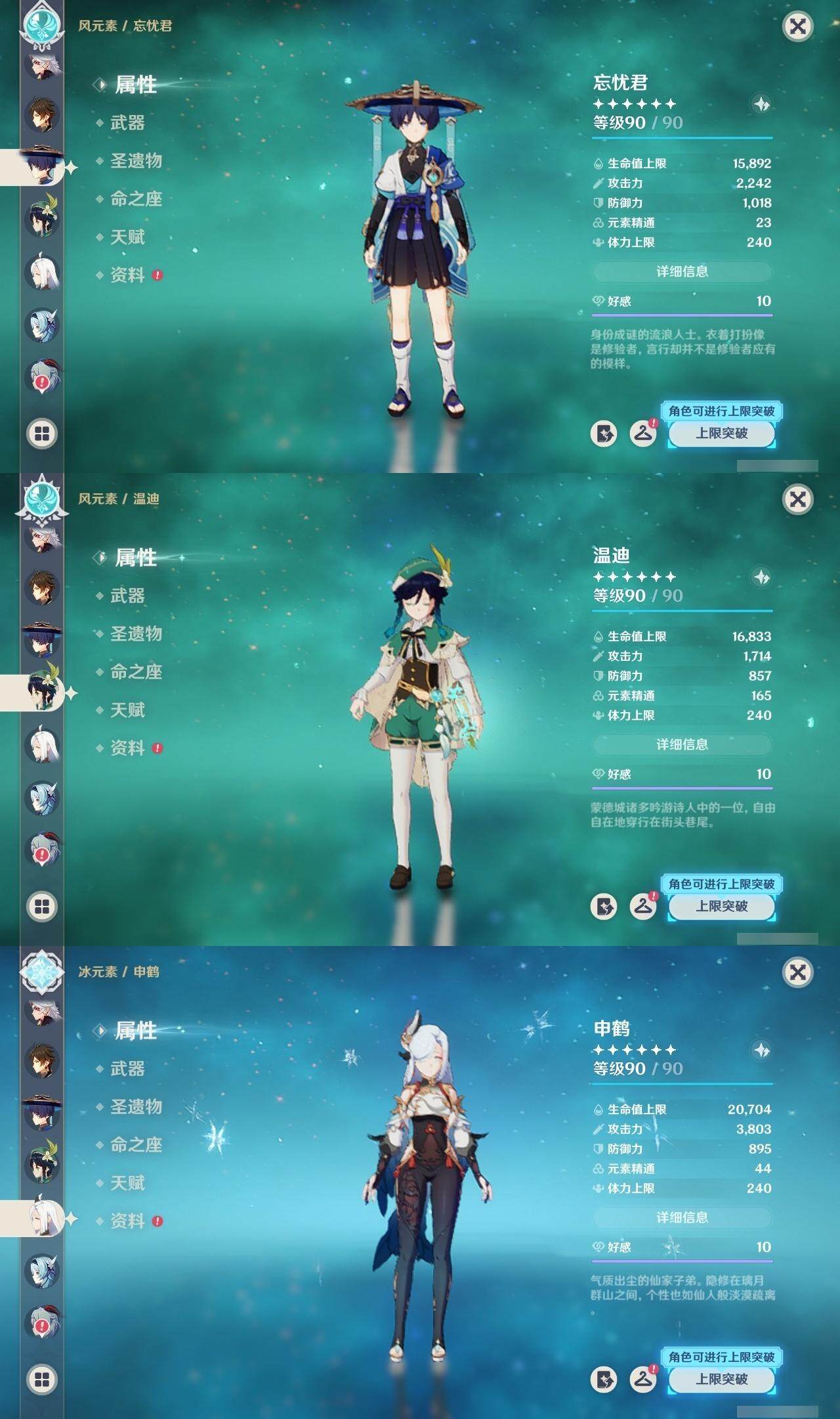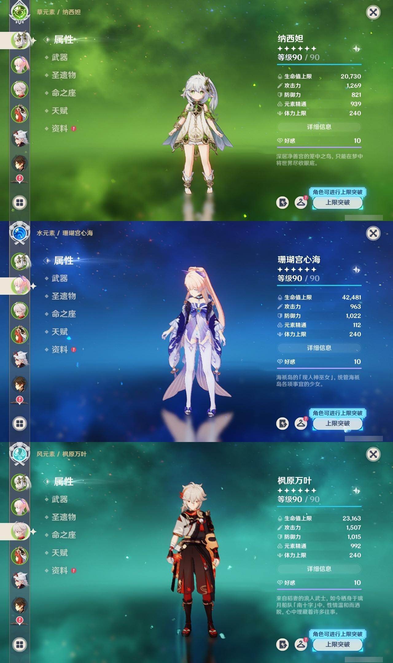 珊瑚宫心海,枫原万叶,荒泷一斗,钟离,温迪,申鹤,优菈,甘雨,神里凌华,八重神子,雷电将军,刻晴,宵宫,胡桃,琴,七七,莫娜