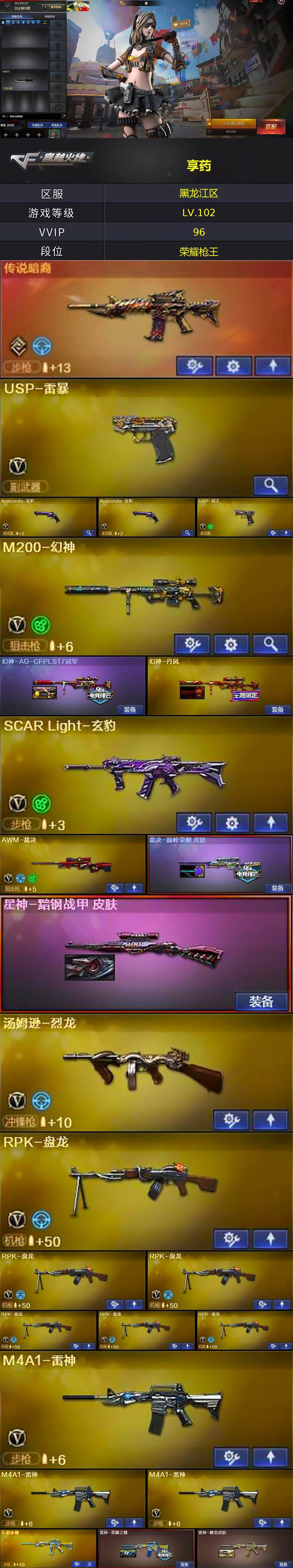 【热门武器】:传说暗裔,HK417-朱雀,M200-幻神,荣耀世冠-火麒麟,王者炎心,M4A1-黑骑士*2,汤姆逊-烈龙,RPK-盘龙*6,毁灭-孙三炮,USP-雷暴,沙鹰-修罗*4