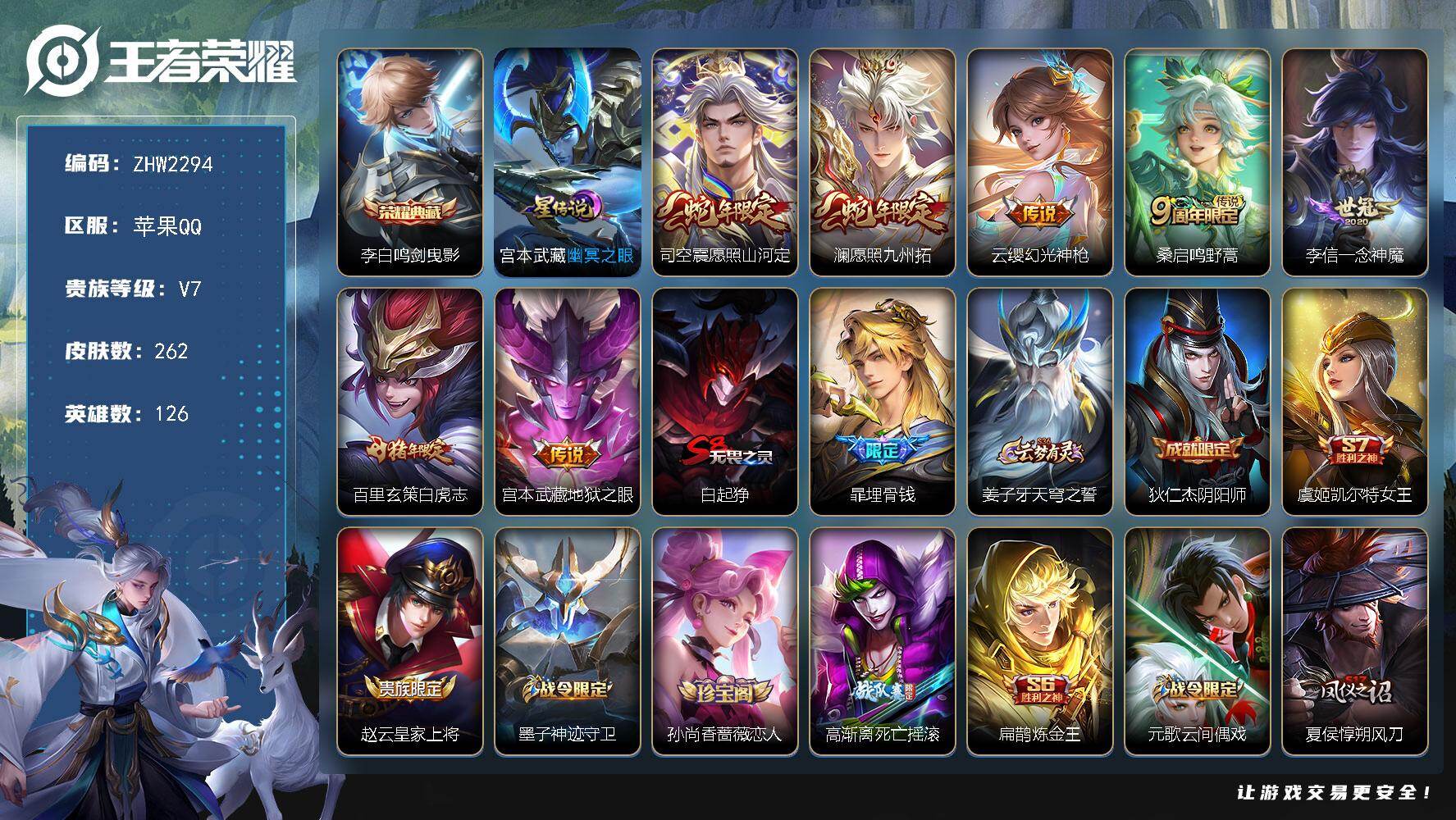 [15534049]可二次【店主推荐捡漏号!可直接换绑/42段打野/31段发育路/1省标/7市标】:苹果Q-V7-最强王者段位-126英雄-262皮肤-1典藏皮肤-1星元-7传说-72史诗 【英雄全皮】:孙权全皮,蒙恬全皮,司空震全皮,影全皮 【荣耀典藏】:李白鸣剑曳影 【传说皮肤】:司空震愿照山河定,澜愿照九州拓,云缨幻光神枪,桑启鸣野蒿,李信一念神魔,百里玄策白虎志,宫本武藏地狱之眼 【限定皮肤】:白起狰,暃埋骨钱,姜子牙天穹之誓,狄仁杰阴阳师,虞姬凯尔特女王,赵云皇家上将,墨子神迹守卫,孙尚香蔷薇恋人,高渐离死亡摇滚,扁鹊炼金王,元歌云间偶戏,夏侯惇朔风刀,曹操烛龙,马可波罗逐梦之星,狄仁杰魔术师,狄仁杰万华元夜,达摩沙漠行僧,项羽海滩派对,老夫子醍醐杖,老夫子航海奇遇记,程咬金演武夺筹,韩信逐梦之影,韩信飞衡,兰陵王金庭之子,亚瑟潮玩骑士王,孙悟空至尊宝,牛魔御旌,钟馗驱傩正仪,杨玉环遇见飞天,雅典娜黎明之约,蔡文姬繁星吟游,太乙真人饕餮,太乙真人华丽摇滚,鬼谷子原初探秘者,苏烈千军破阵,百里玄策白虎志,百里玄策原初追逐者,弈星混沌棋,梦奇顽趣,沈梦溪大漠名商,明世隐疑决卦,裴擒虎李小龙,裴擒虎擒涛扼浪,米莱狄御霄,云中君纤云弄巧,盾山御銮,猪八戒猪悟能,上官婉儿梁祝,嫦娥拒霜思,嫦娥暖冬兔眠,鲁班大师探海日志,桑启海盐诗旅,暃星界游侠,艾琳流音漫舞,司空震地狱燃心,阿古朵江河有灵,张良古海寻踪,蒙犽百解令,蒙恬荣光圣徽,鬼谷子天穹祈灯,姬小满妄想食味,沈梦溪龙舞盛年,刘邦剑破天穹,程咬金群星魔术团 【年限皮肤】:百里玄策白虎志,韩信飞衡 【赛季限定】:扁鹊炼金王,白起狰,夏侯惇朔风刀,曹操烛龙,狄仁杰万华元夜,达摩沙漠行僧,老夫子醍醐杖,程咬金演武夺筹,兰陵王金庭之子,张良古海寻踪,牛魔御旌,虞姬凯尔特女王,钟馗驱傩正仪,雅典娜黎明之约,太乙真人饕餮,鬼谷子原初探秘者,苏烈千军破阵,百里玄策原初追逐者,弈星混沌棋,梦奇顽趣,沈梦溪大漠名商,明世隐疑决卦,裴擒虎擒涛扼浪,米莱狄御霄,盾山御銮,鲁班大师探海日志,桑启海盐诗旅,鬼谷子天穹祈灯,蒙恬荣光圣徽,刘邦剑破天穹,姜子牙天穹之誓 【战令限定】:墨子神迹守卫,元歌云间偶戏,老夫子航海奇遇记,艾琳流音漫舞,亚瑟潮玩骑士王,嫦娥暖冬兔眠,司空震地狱燃心,暃星界游侠 【史诗皮肤】:项羽苍穹之光,露娜紫霞仙子,赵云皇家上将,赵云未来