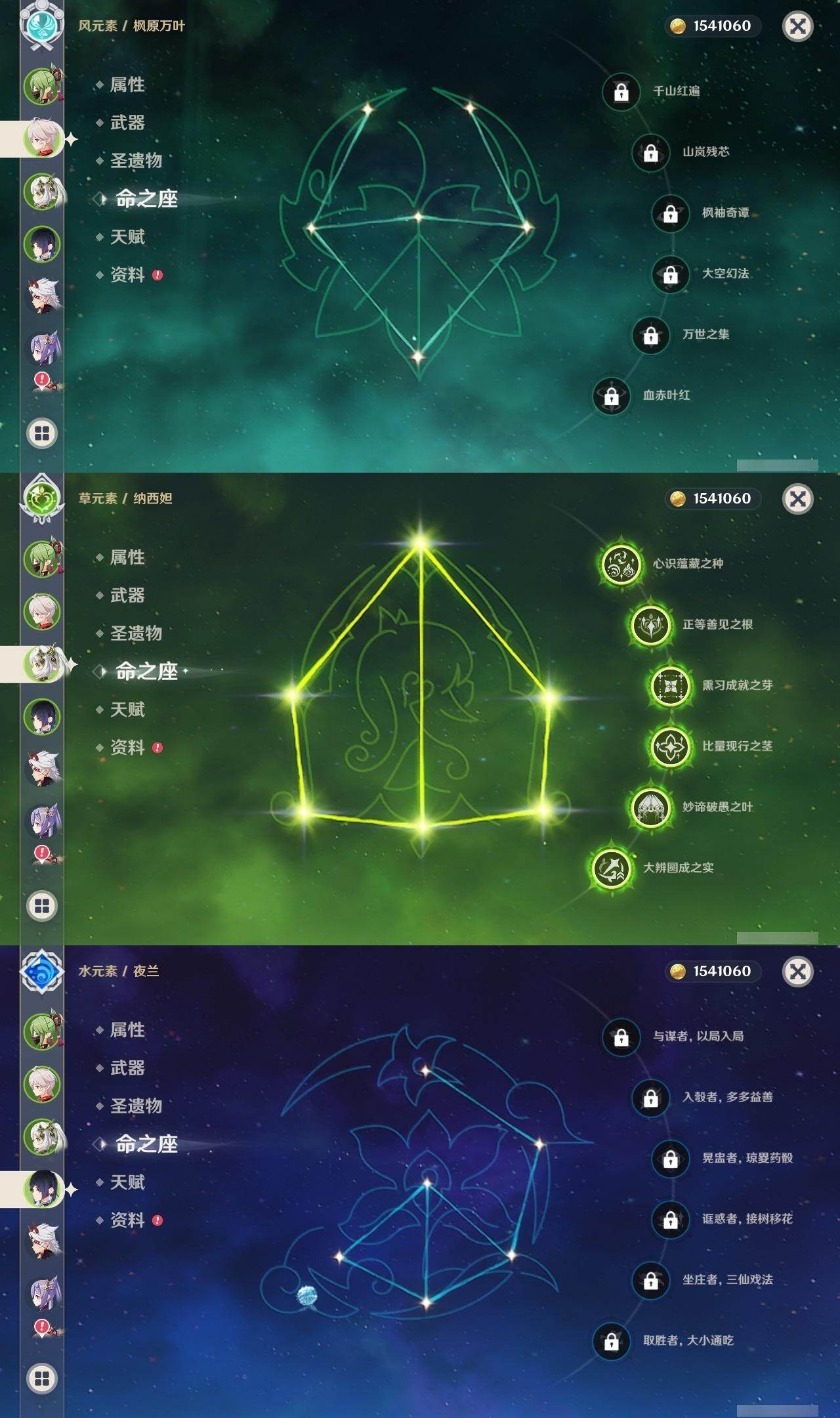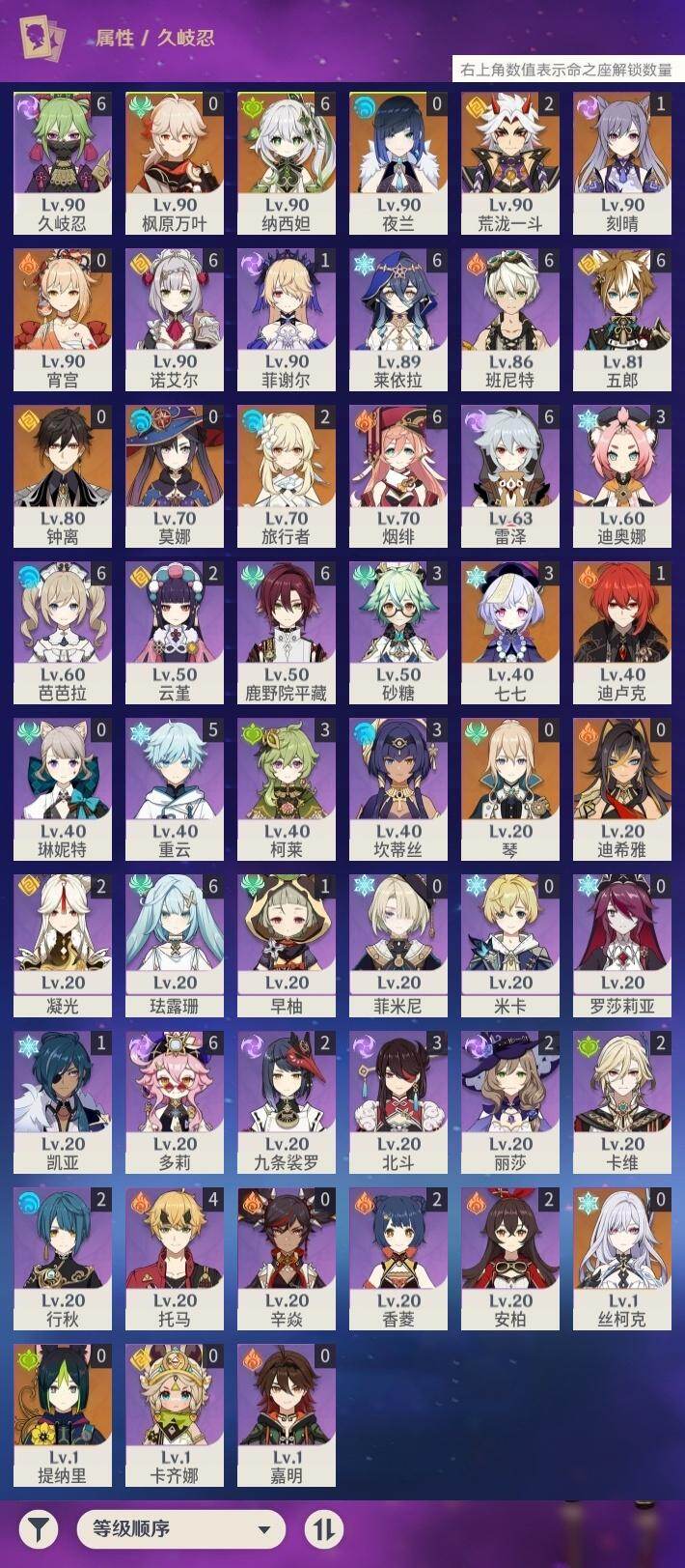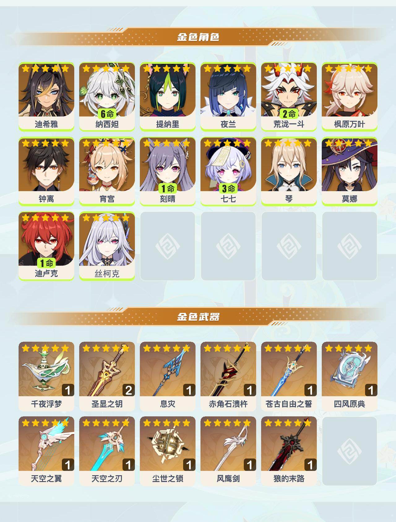 0命迪希雅,满命纳西妲,0命提纳里,0命夜兰,2命荒泷一斗,0命枫原万叶,0命钟离,0命宵宫,1命刻晴,3命七七,0命琴,0命莫娜,1命迪卢克,0命丝柯克,精1千夜浮梦,精2圣显之钥,精1息灾,精1赤角石溃杵,精1苍古自由之誓,精1四风原典,精1天空之翼,精1天空之刃,精1尘世之锁,精1风鹰剑,精1狼的末路