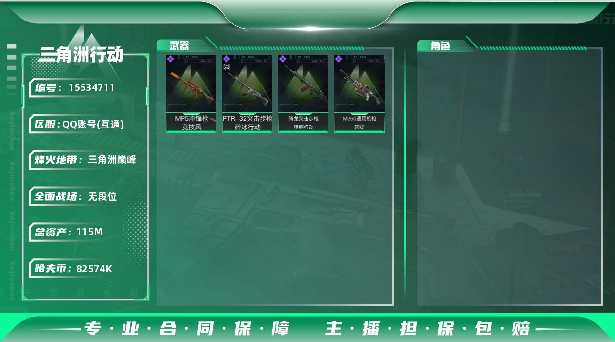 [15534711]【特价出售/店主推荐】 115m总资产-82574k哈伏币-60烽火等级-三角洲巅峰-1战场等级-无军衔 【近战皮肤】:近战-黑鹰 【史诗外观】:PTR-32突击步枪-碎冰行动,腾龙突击步枪-猎鳄行动,MP5冲锋枪-竞技风,M250通用机枪-囚徒 【稀有外观】:沙漠之鹰-天际线,M700狙击步枪-旧梦,AKM突击步枪-肃杀,SCAR-H战斗步枪-荣耀列队,K437突击步枪-生存指令,MK47突击步枪-精英联盟,SMG-45-行动开启 【普通外观】:R93狙击步枪-凶兽,AUG突击步枪-浅蓝涂装,M7战斗步枪-红色涂装,UZI冲锋枪-海色,QCQ171冲锋枪-三角洲力量,M1014霰弹枪-高雅黑,沙漠之鹰-海浪,93R-三角洲力量 【军牌】:军牌-静谧时光,军牌-永恒,军牌-信誉优秀,军牌-小心鳄鱼 【挂饰】:挂饰-崩岩重炮*3,挂饰-暗行哨兵*4