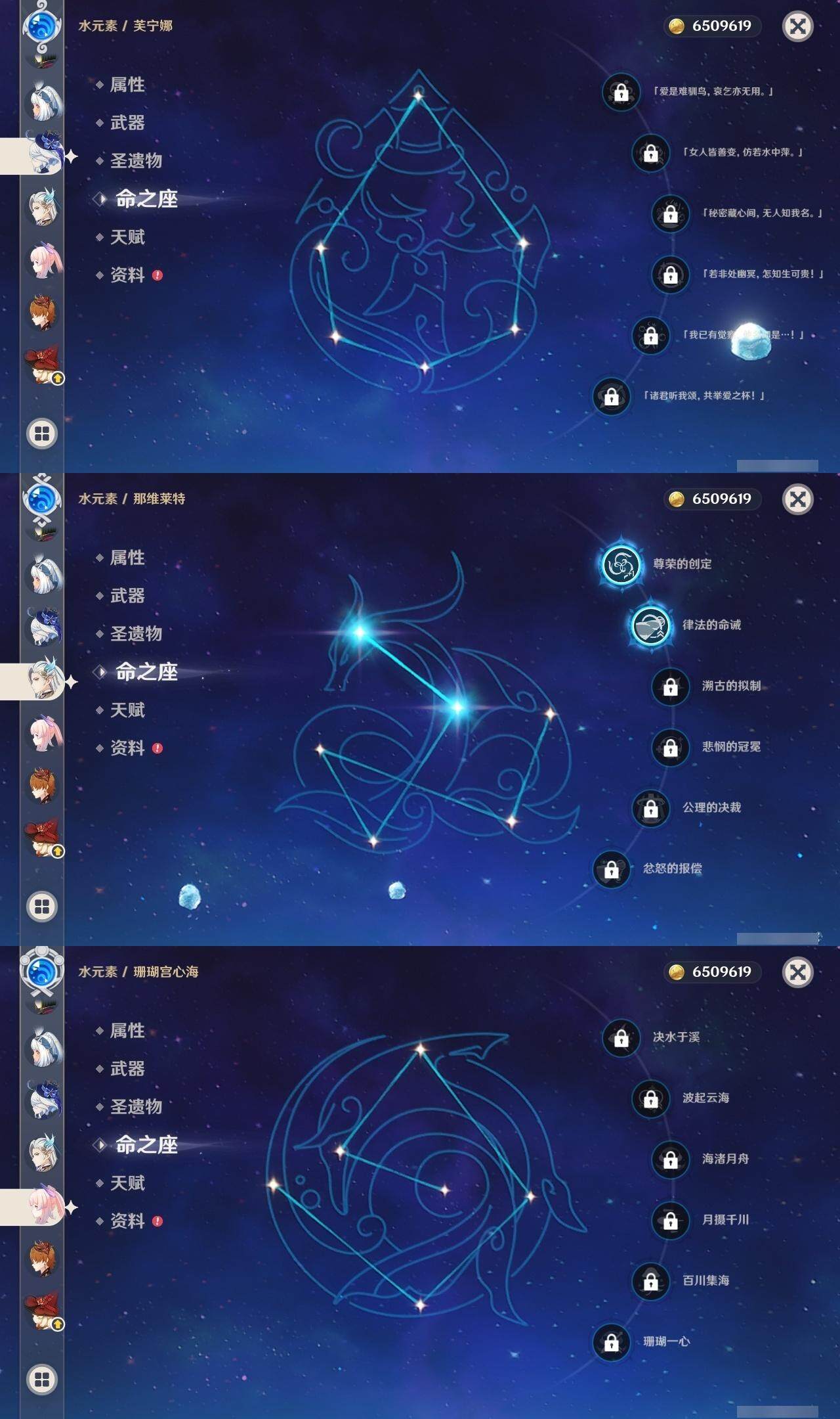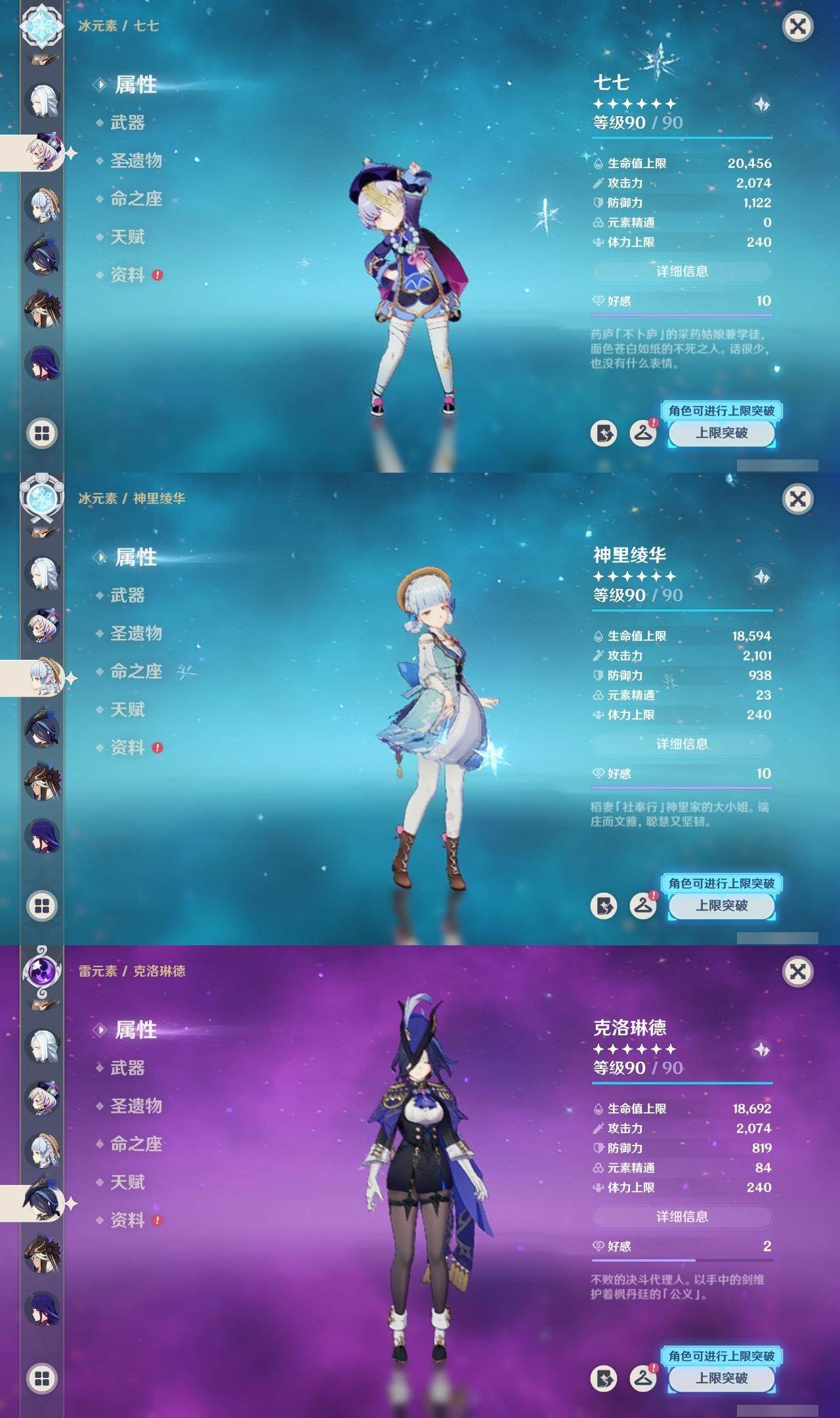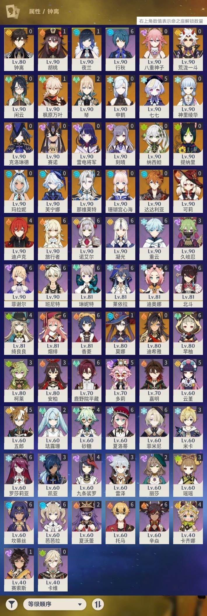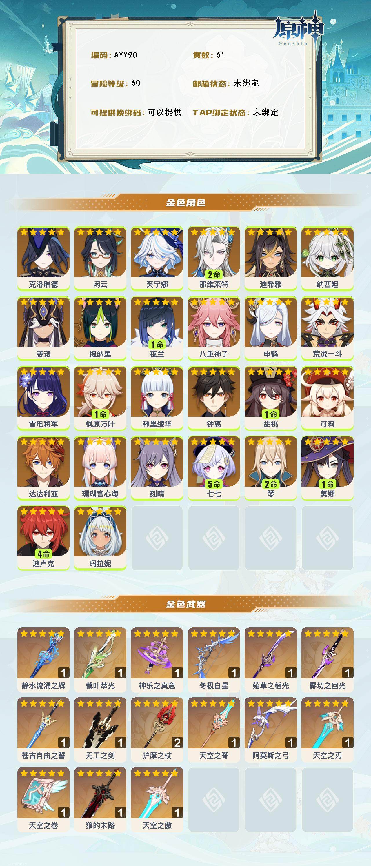 0命克洛琳德,0命闲云,0命芙宁娜,2命那维莱特,0命迪希雅,0命纳西妲,0命赛诺,0命提纳里,1命夜兰,0命八重神子,0命申鹤,0命荒泷一斗,0命雷电将军,1命枫原万叶,0命神里绫华,0命钟离,1命胡桃,0命可莉,0命达达利亚,0命珊瑚宫心海,0命刻晴,5命七七,2命琴,1命莫娜,4命迪卢克,0命玛拉妮,精1静水流涌之辉,精1裁叶萃光,精1神乐之真意,精1冬极白星,精1薙草之稻光,精1雾切之回光,精1苍古自由之誓,精1无工之剑,精2护摩之杖,精1天空之脊,精1阿莫斯之弓,精1天空之刃,精1天空之卷,精1狼的末路,精1天空之傲