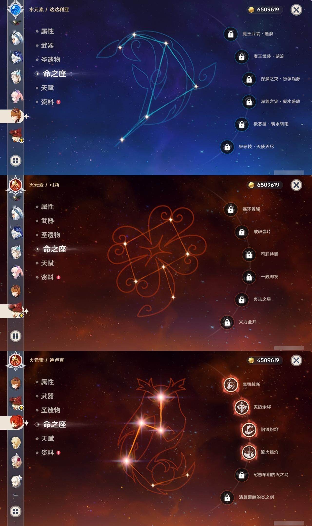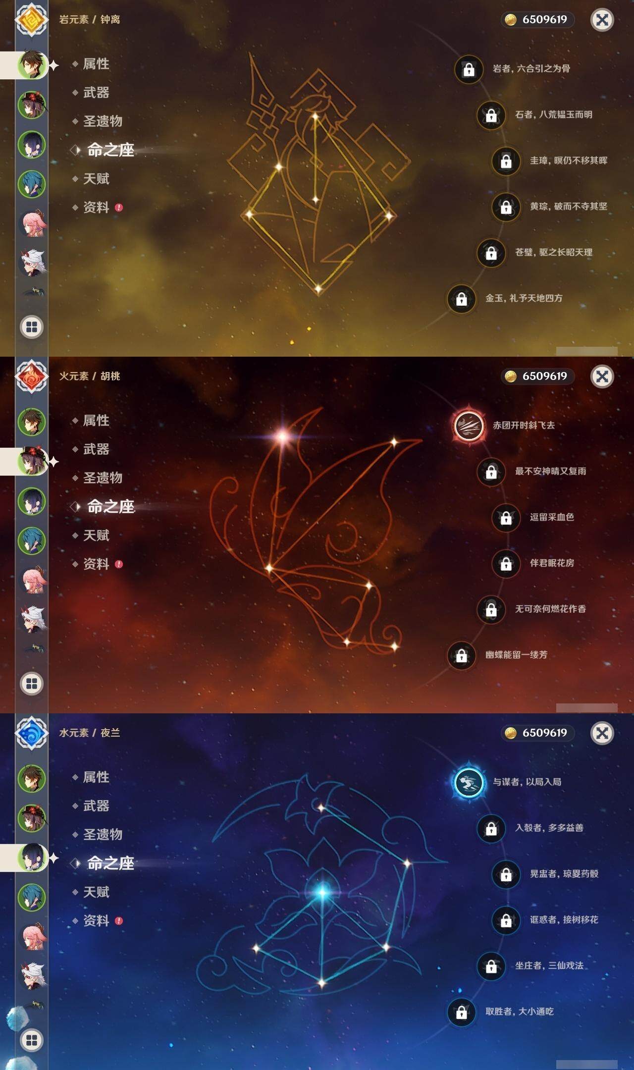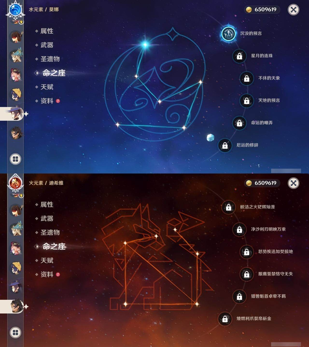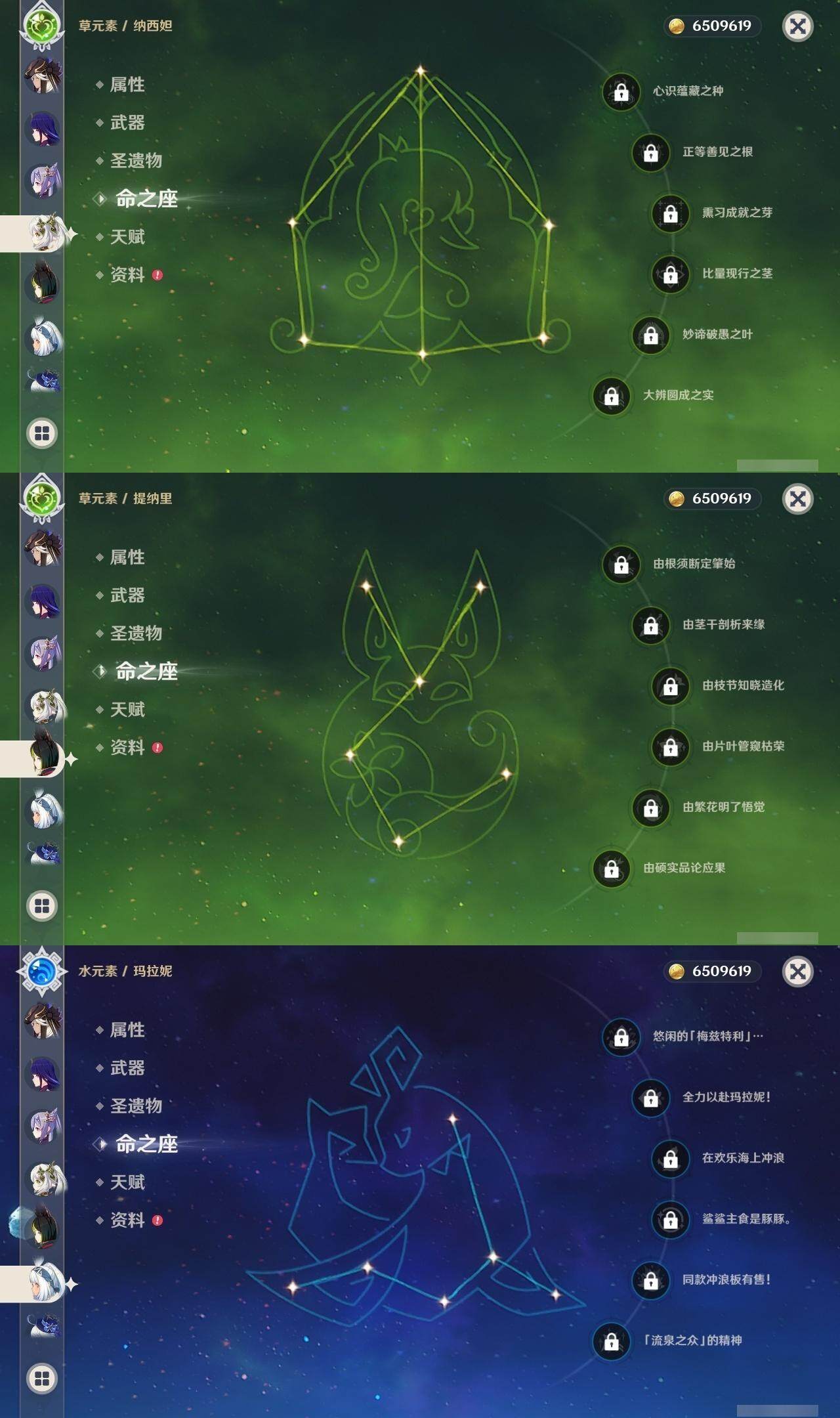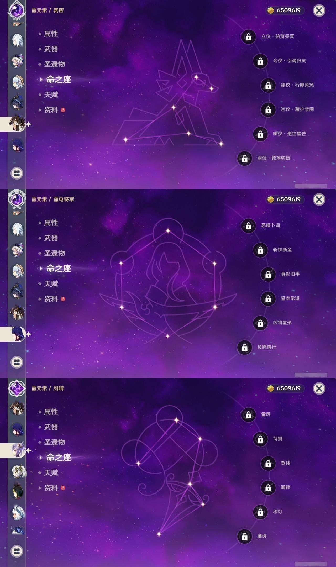 0命克洛琳德,0命闲云,0命芙宁娜,2命那维莱特,0命迪希雅,0命纳西妲,0命赛诺,0命提纳里,1命夜兰,0命八重神子,0命申鹤,0命荒泷一斗,0命雷电将军,1命枫原万叶,0命神里绫华,0命钟离,1命胡桃,0命可莉,0命达达利亚,0命珊瑚宫心海,0命刻晴,5命七七,2命琴,1命莫娜,4命迪卢克,0命玛拉妮,精1静水流涌之辉,精1裁叶萃光,精1神乐之真意,精1冬极白星,精1薙草之稻光,精1雾切之回光,精1苍古自由之誓,精1无工之剑,精2护摩之杖,精1天空之脊,精1阿莫斯之弓,精1天空之刃,精1天空之卷,精1狼的末路,精1天空之傲