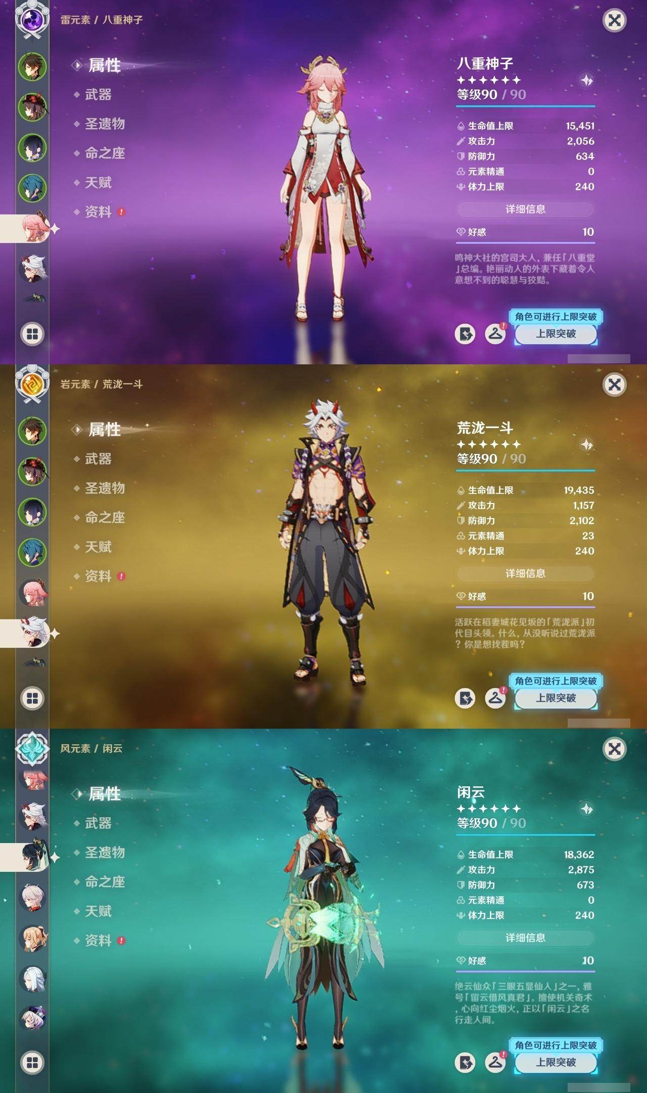 钟离,胡桃,八重神子,荒泷一斗,枫原万叶,琴,申鹤,七七,神里凌华,雷电将军,刻晴,珊瑚宫心海,达达利亚,可莉,迪卢克,莫娜