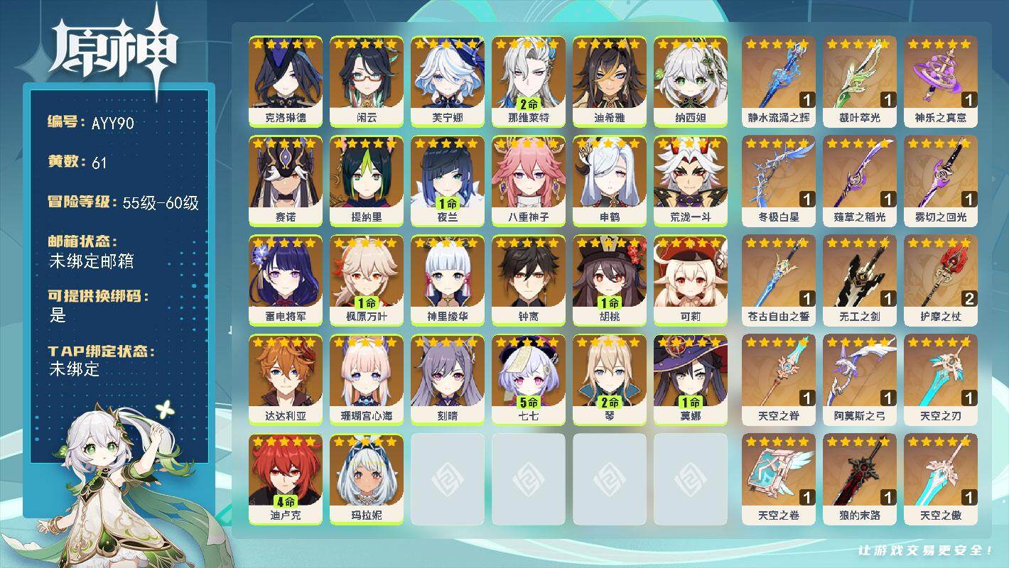 [15534952]60级/61黄/女主/26个五星角色/17个五星武器 0命克洛琳德,0命闲云,0命芙宁娜,2命那维莱特,0命迪希雅,0命纳西妲,0命赛诺,0命提纳里,1命夜兰,0命八重神子,0命申鹤,0命荒泷一斗,0命雷电将军,1命枫原万叶,0命神里绫华,0命钟离,1命胡桃,0命可莉,0命达达利亚,0命珊瑚宫心海,0命刻晴,5命七七,2命琴,1命莫娜,4命迪卢克,0命玛拉妮,精1静水流涌之辉,精1裁叶萃光,精1神乐之真意,精1冬极白星,精1薙草之稻光,精1雾切之回光,精1苍古自由之誓,精1无工之剑,精2护摩之杖,精1天空之脊,精1阿莫斯之弓,精1天空之刃,精1天空之卷,精1狼的末路,精1天空之傲