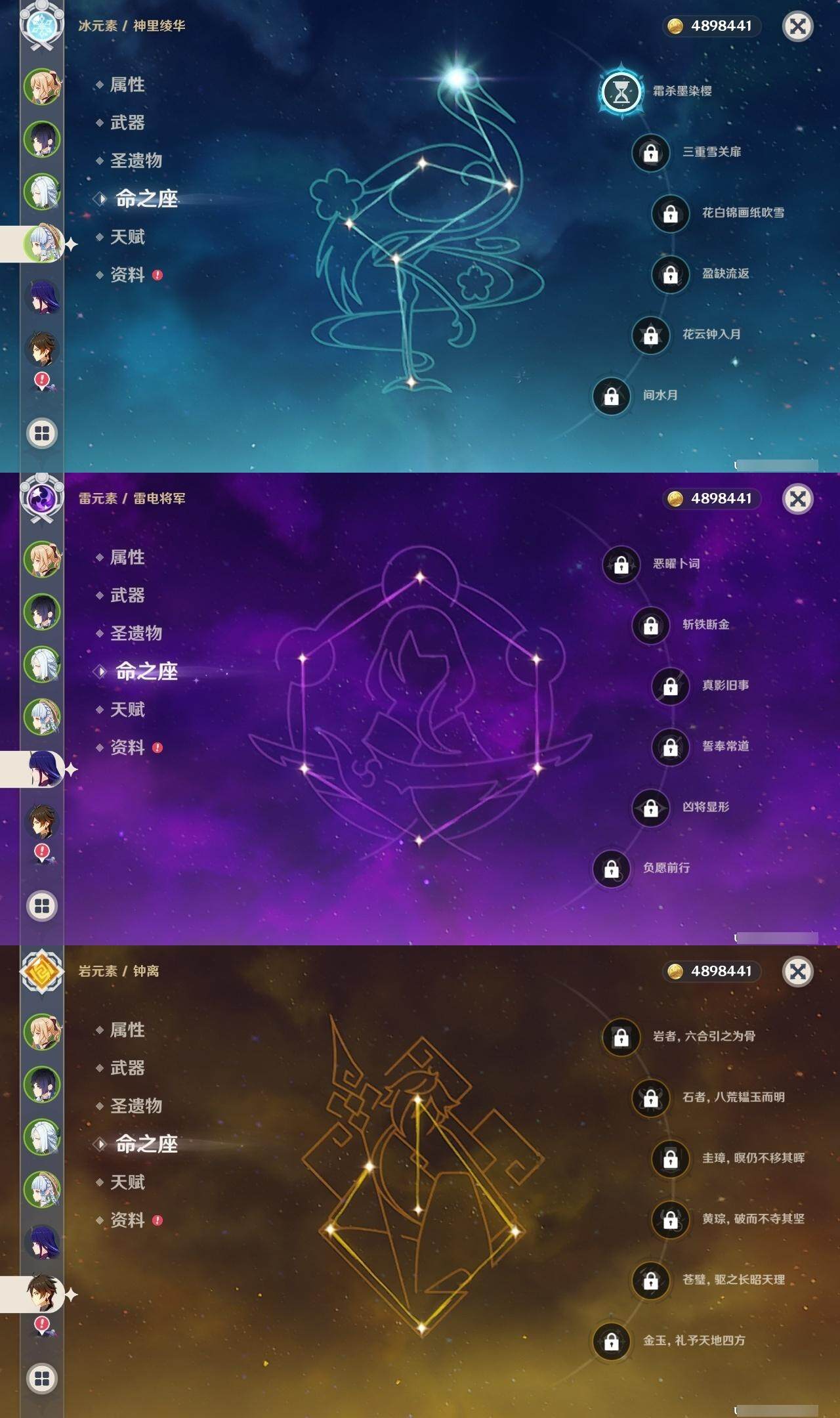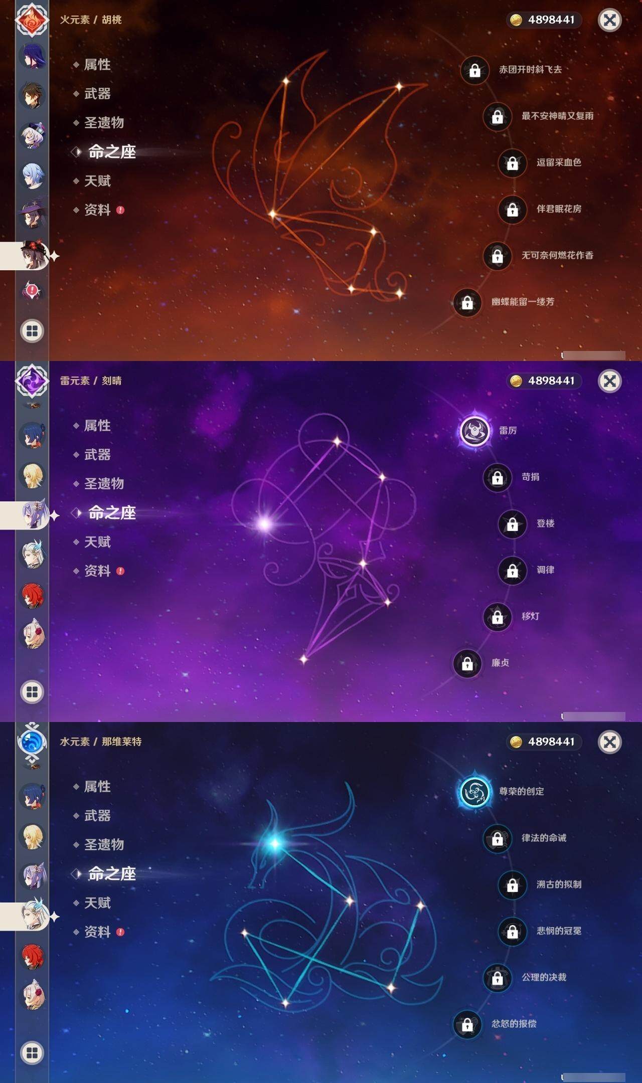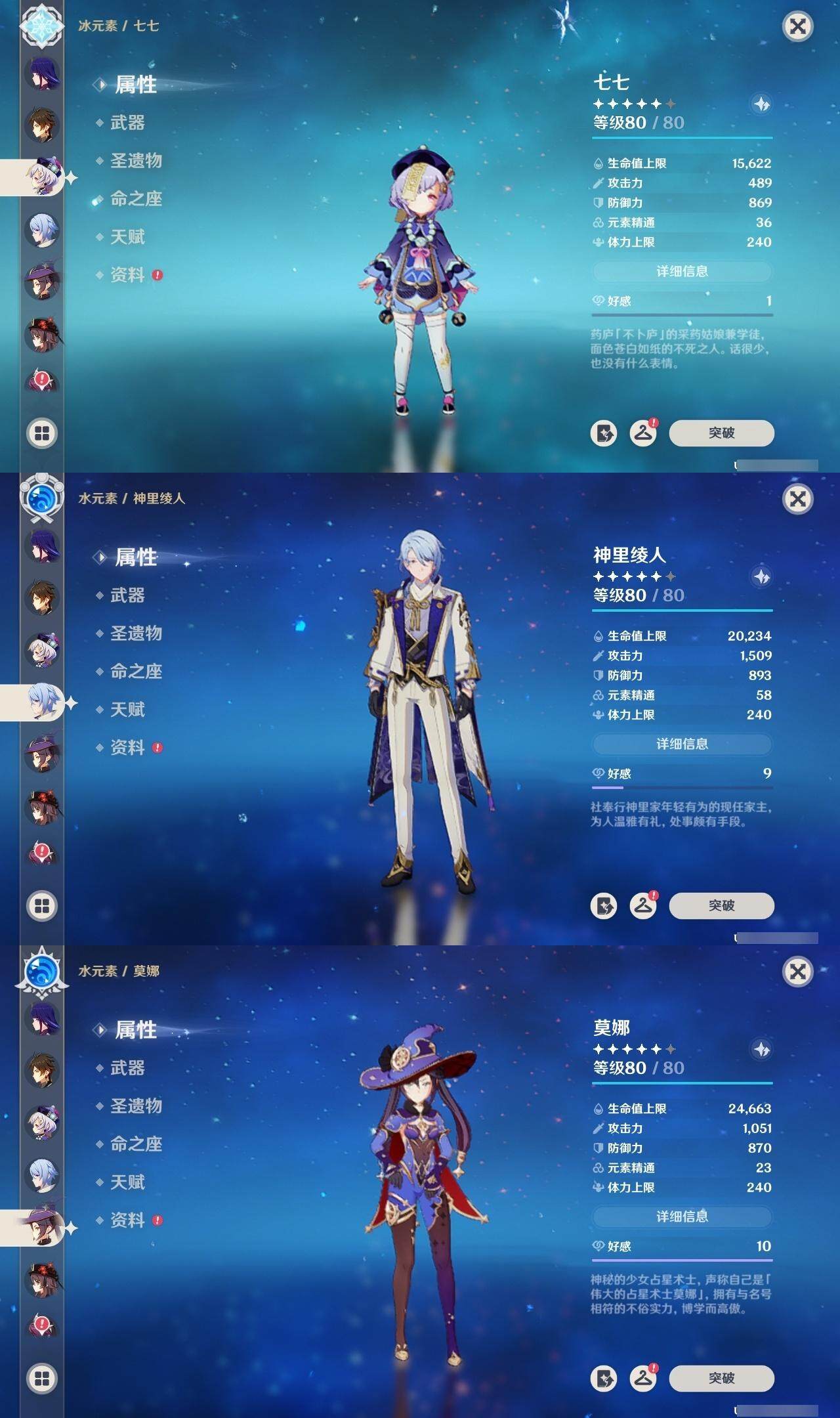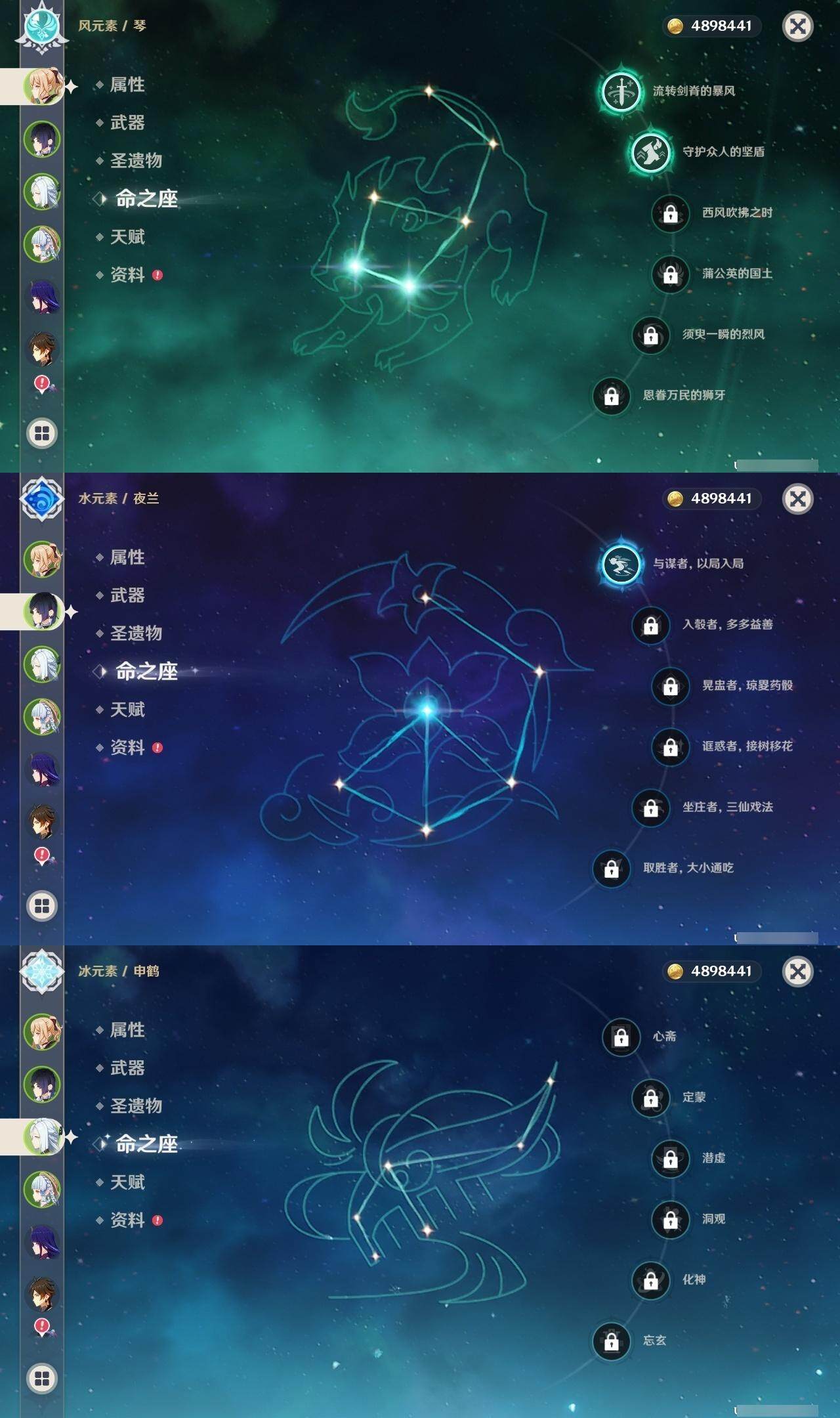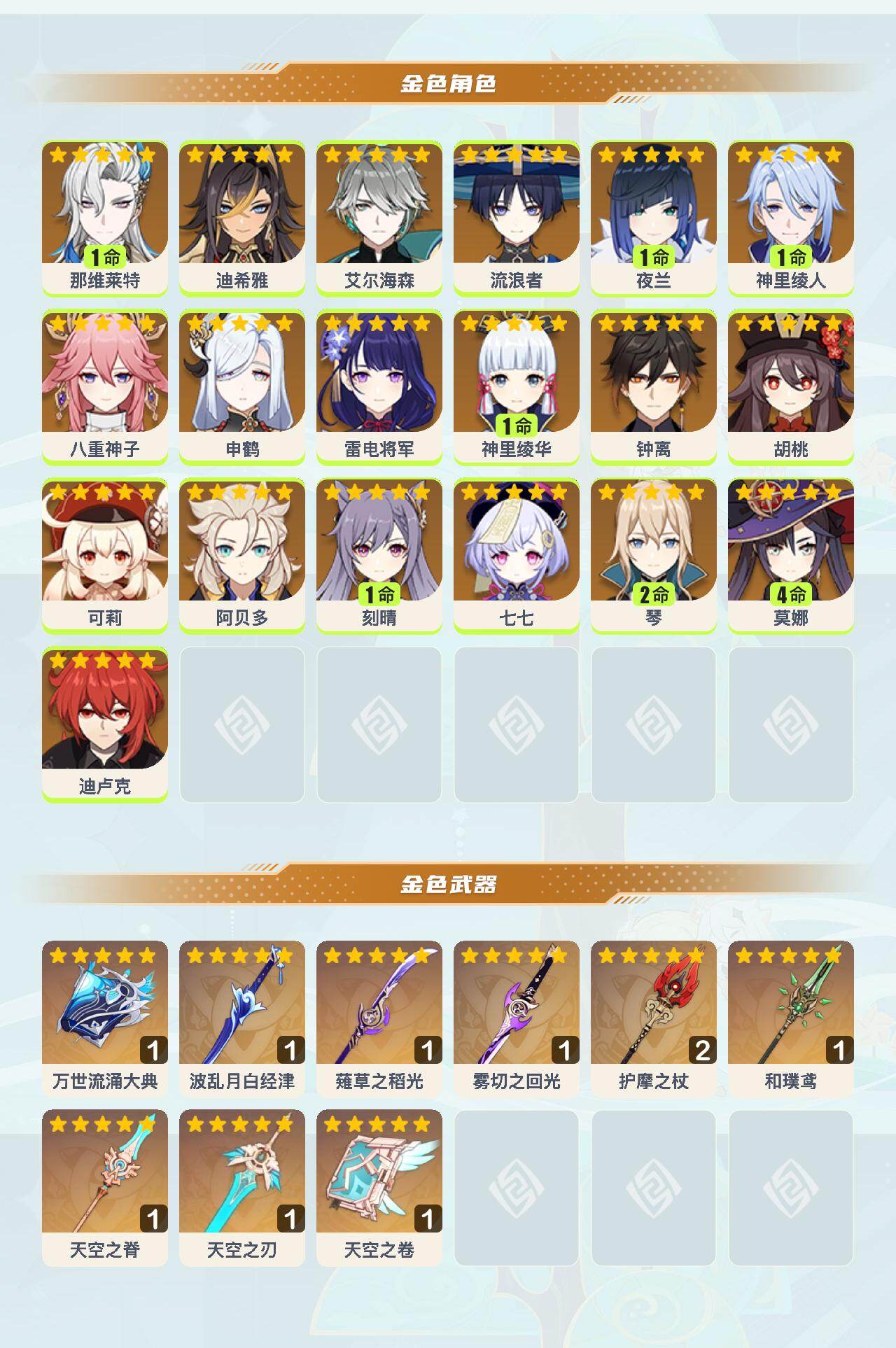 1命那维莱特,0命迪希雅,0命艾尔海森,0命流浪者,1命夜兰,1命神里绫人,0命八重神子,0命申鹤,0命雷电将军,1命神里绫华,0命钟离,0命胡桃,0命可莉,0命阿贝多,1命刻晴,0命七七,2命琴,4命莫娜,0命迪卢克,精1万世流涌大典,精1波乱月白经津,精1薙草之稻光,精1雾切之回光,精2护摩之杖,精1和璞鸢,精1天空之脊,精1天空之刃,精1天空之卷