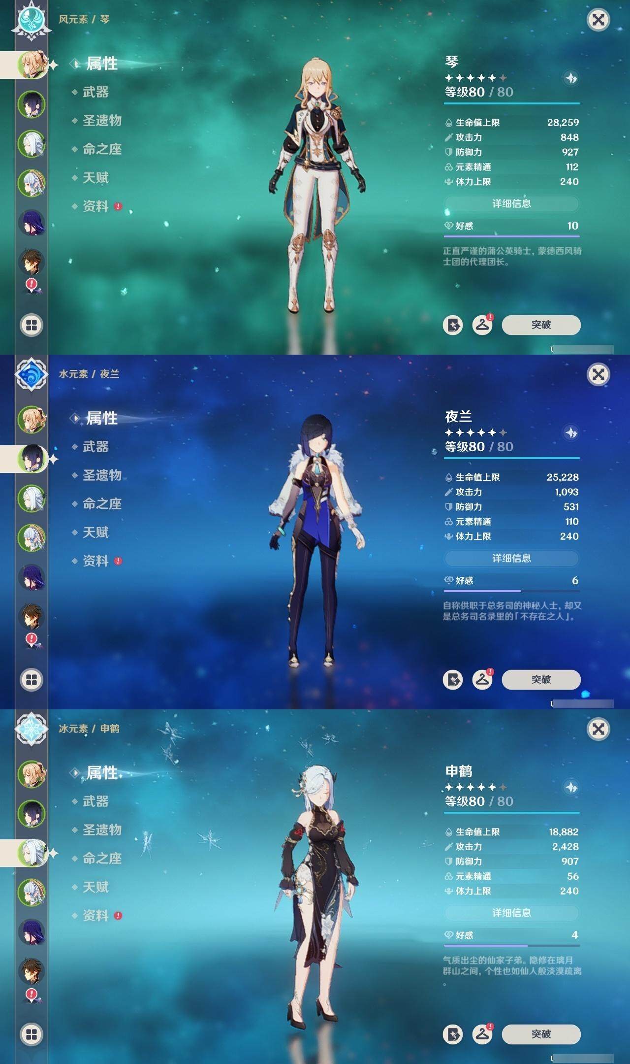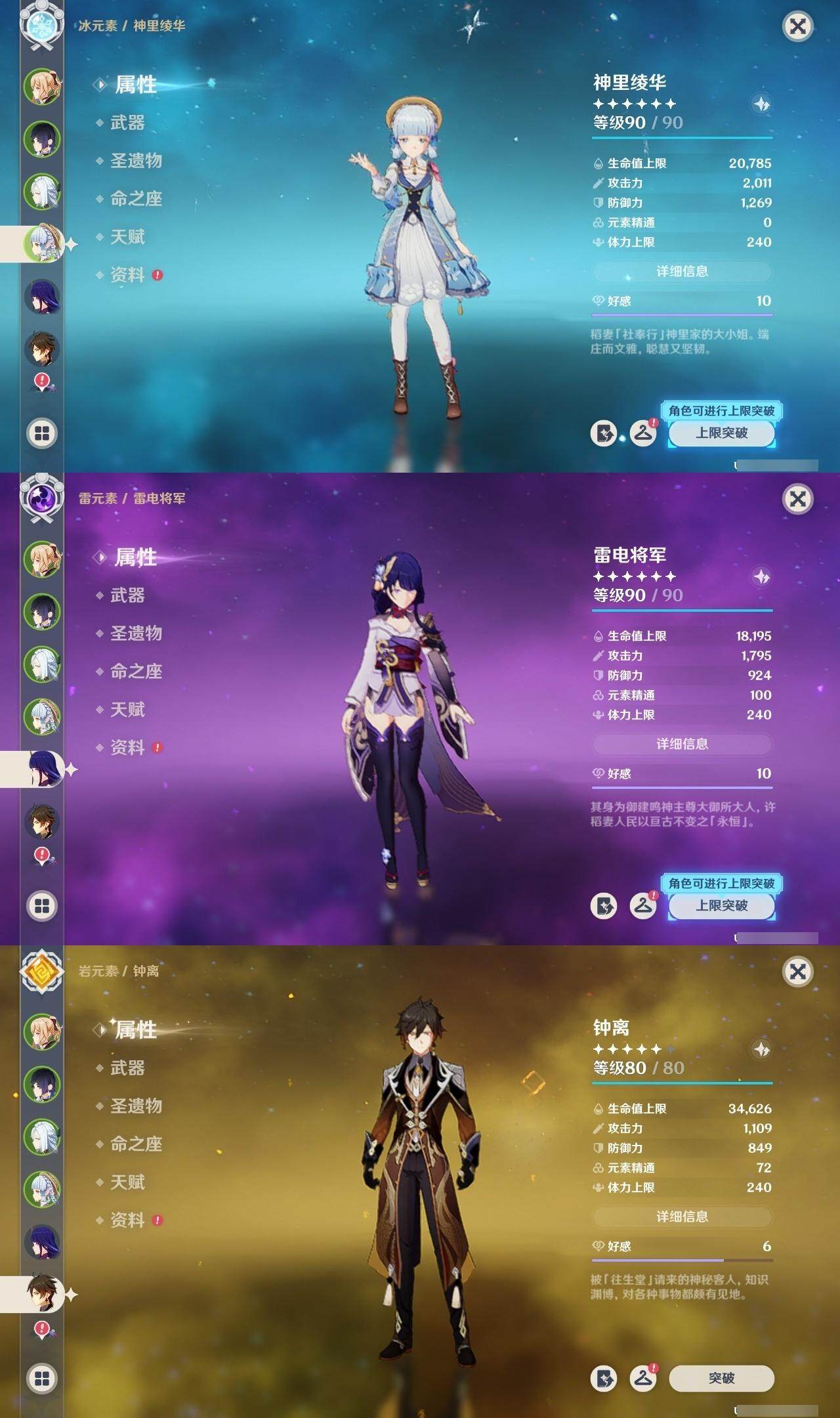 琴,申鹤,神里凌华,雷电将军,钟离,七七,莫娜,胡桃,刻晴,迪卢克,可莉,八重神子,阿贝多