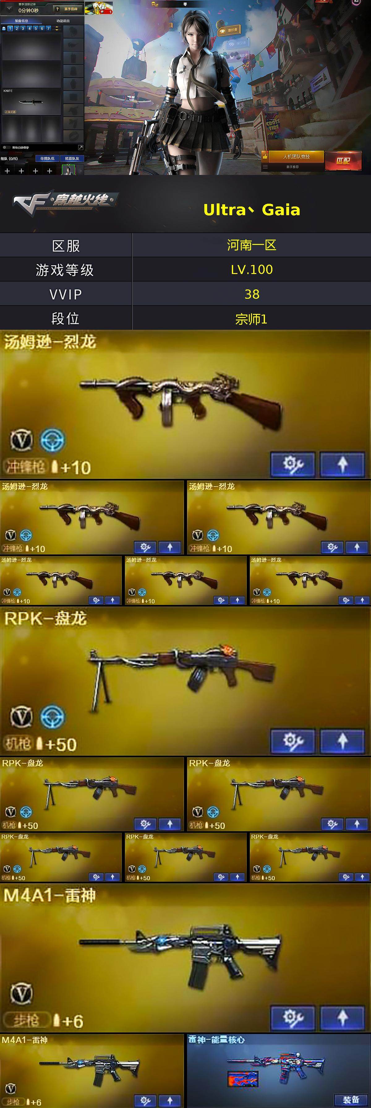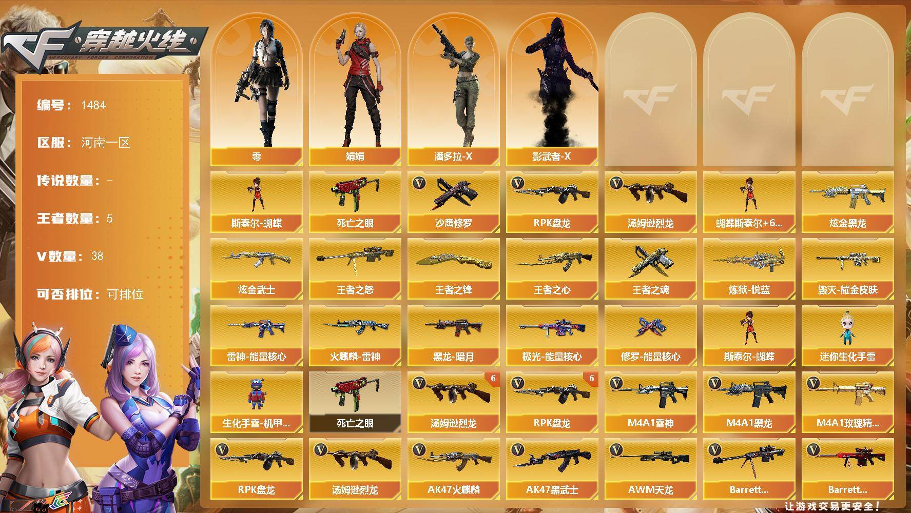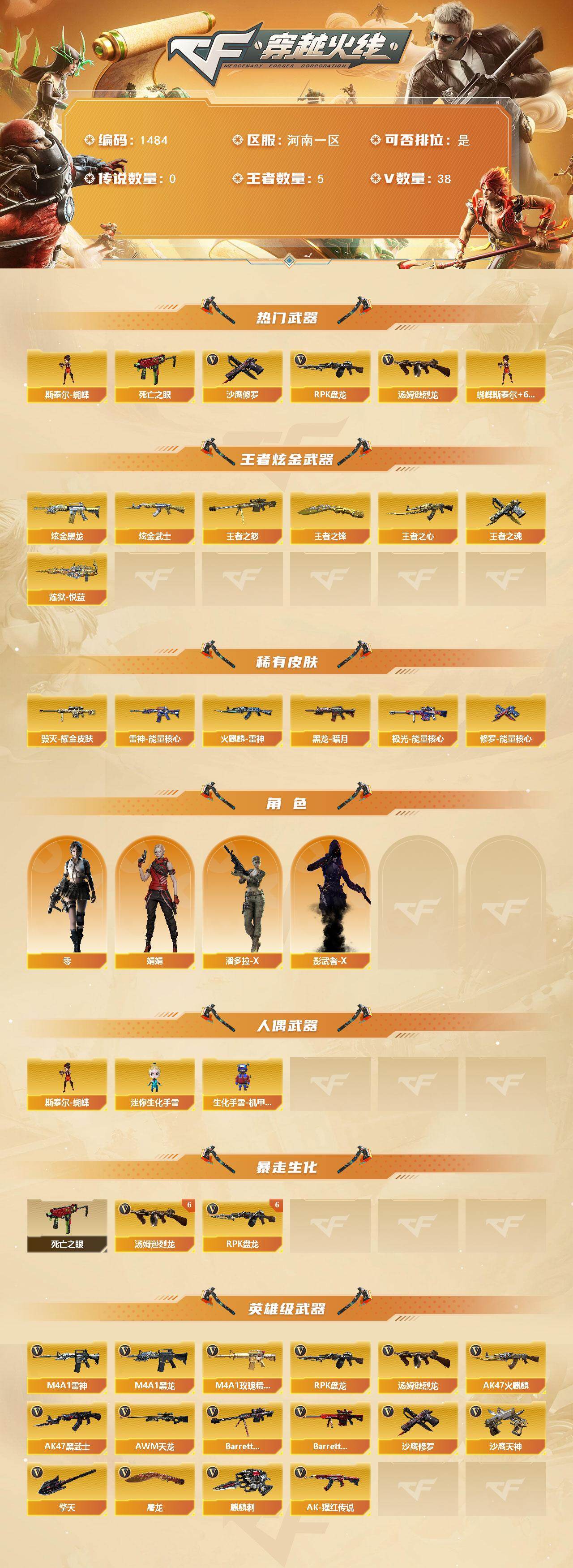 [15536971]河南一区-38V-5王者-2炫金 【热门武器】:死亡之眼,汤姆逊-烈龙*6,RPK-盘龙*6,斯泰尔-蝴蝶,沙鹰-修罗*5 【王者炫金武器】:王者之心,王者之怒,炼狱-悦蓝,王者之魂,王者之锋,炫金黑龙,炫金武士 【皮肤】:雷神-能量核心,火麒麟-雷神,毁灭耀金皮肤,黑龙-暗月,极光-能量核心,修罗-能量核心 【角色】:零,娟娟,潘多拉-X,影武者-X 【人偶武器】:斯泰尔-蝴蝶,迷你生化手雷,生化手雷-机甲核心 【暴走生化】:死亡之眼 【英雄级武器】:AK47-火麒麟*3,M4A1-黑龙,M4A1-雷神*2,AK47-黑武士,M4A1-玫瑰精灵,AK-47-猩红传说,AWM-天龙,Barrett-毁灭,Barrett-极光*2,RPK-盘龙*6,汤姆逊-烈龙*6,沙鹰-修罗*5,沙鹰-天神,屠龙*3,擎天*2,麒麟刺 【道具】:亚洲杯纪念炫彩背包,炫彩背包,超级背包,绿色巨人,灵魂忍者,变异宝贝,迷雾幽灵,夺命之镰,防化服*2,防弹头盔*2,防弹衣*2,C4工具钳*2,手雷包*2 【特殊枪械】:蝴蝶斯泰尔+6烈龙,6烈龙,6盘龙,1蝴蝶斯泰尔