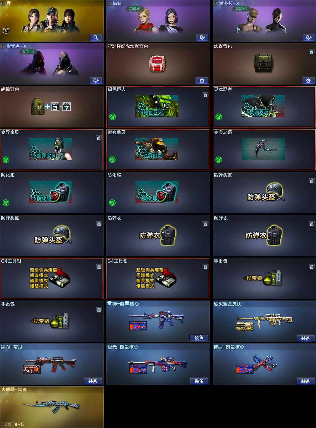 【道具】:亚洲杯纪念炫彩背包,炫彩背包,超级背包,绿色巨人,灵魂忍者,变异宝贝,迷雾幽灵,夺命之镰,防化服*2,防弹头盔*2,防弹衣*2,C4工具钳*2,手雷包*2