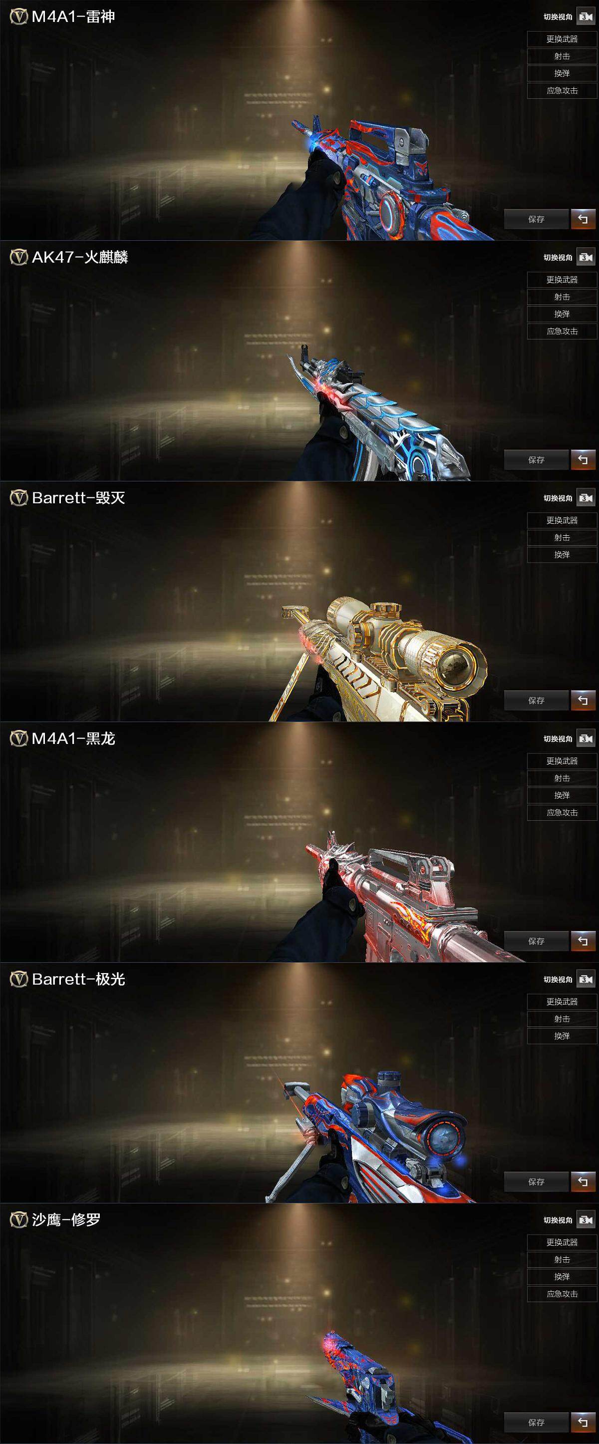 【英雄级武器】:AK47-火麒麟*3,M4A1-黑龙,M4A1-雷神*2,AK47-黑武士,M4A1-玫瑰精灵,AK-47-猩红传说,AWM-天龙,Barrett-毁灭,Barrett-极光*2,RPK-盘龙*6,汤姆逊-烈龙*6,沙鹰-修罗*5,沙鹰-天神,屠龙*3,擎天*2,麒麟刺