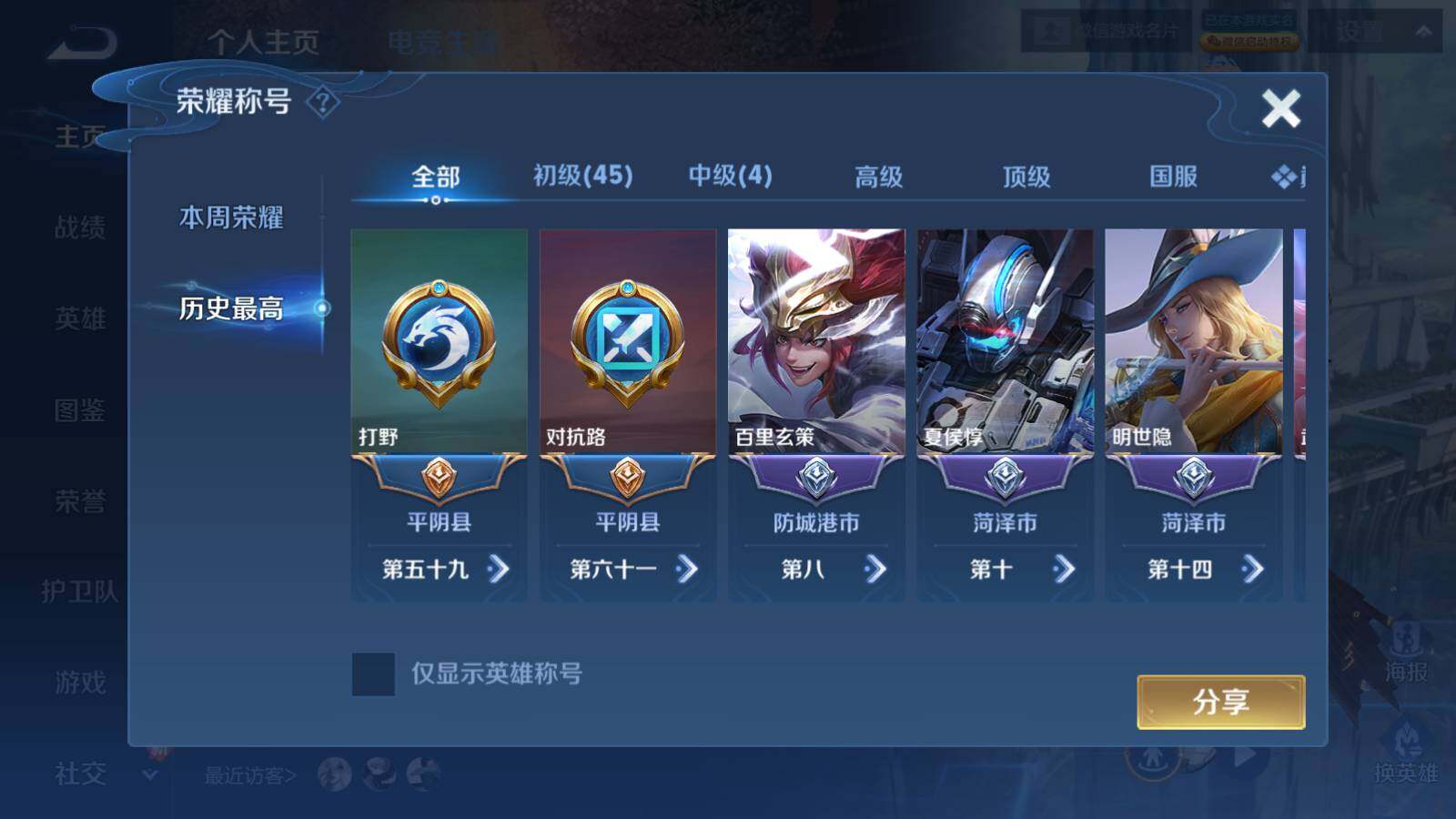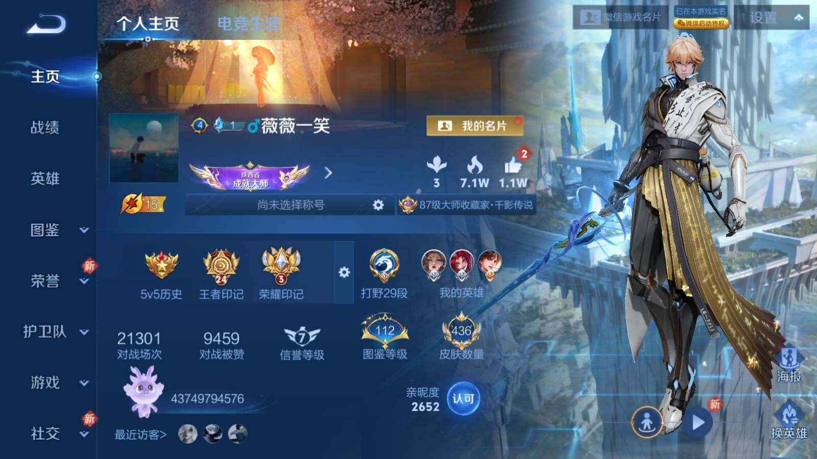 - [12298772]V8 2典藏 1珍品传说 22传说 126英雄 309皮肤 可修改实名 优质装备:鸣剑·曳影,最初的交响(伽罗典藏),怪盗基德,黄金狮子座,黄金射手座,云鹰飞将(小将军),久胜战神,炽阳神光,一念神魔,李逍遥,时之恋人-刘备(电焊工),超时空战士-狄仁杰,末日机甲-孙策,挚爱之约,山海·炽霜斩(李信年限),鹤羽星尊,涂山容容 传说皮:乘龙·问璇玑(孙尚香年限),吕布曦玄引,幻光神枪,云诺千山 珍宝阁皮:胡桃夹子,蔷薇恋人,玩趣恶龙 限定皮:愿照·九州拓(澜年限),逐霄战戟,陌上桑,鸣野蒿,傲雪梅枪,前尘镜,高山流水,五谷丰年,青龙志(铠年限),梁祝,祈雪灵祝(雪兔子),李小龙,朱雀志(守约年限),如梦令-后羿,孙行者,猪悟能,时之祈愿-云中君 史诗皮:灵蛊蚀心,苍鳞隐世,器灵·浮梦炉,化蝶舞,龙之律动,琥珀纪元伽罗,茶境仙,蒙犽顽岩魄,百相守梦-百里守约,星界特工,破空之剑,埋骨钱,海诺心动手记,蔬乡物语(鲁班七号),百相守梦-黄忠,星界战将,织梦人,紫霞仙子,黄金分割率,特工魅影,千年之狐,雪夜绮愿(周瑜),江河有灵,龙骑士(小龙虾),百解令(蒙犽),高渐离燃音魔法,蒙恬荣光圣徽,无限星赏官,冰冠公主,偶像歌手,电玩·爆裂旋风,暗夜猫娘,末日机甲-吕布,猫狗日记-孙策,猫狗日记-大乔,时之恋人-孙尚香,乱世虎臣,节奏热浪,修罗,女仆咖啡,摇滚巨星,水果甜心,绅士熊喵,天才门将,星夜王子,心灵骇客,功夫厨神,德古拉伯爵,暗隐猎兽者,幽灵船长,鬼剑武藏,暗渊魔法,心灵战警,天秀·启明,舞动绿茵,地狱岩魂,纤云弄巧,拒霜思,缤纷独角兽,乘风破浪,逐浪之夏,水晶猎龙者,曙光守护者,金属风暴,原初追逐者,圣诞狂欢,圣诞恋歌,鹰眼统帅,暗夜贵公子,魅力维加斯,黎明之约,赏金猎手,天秀·音浪,未来纪元-赵云