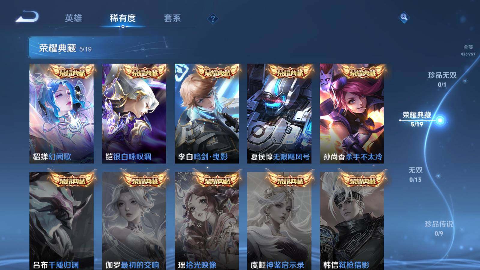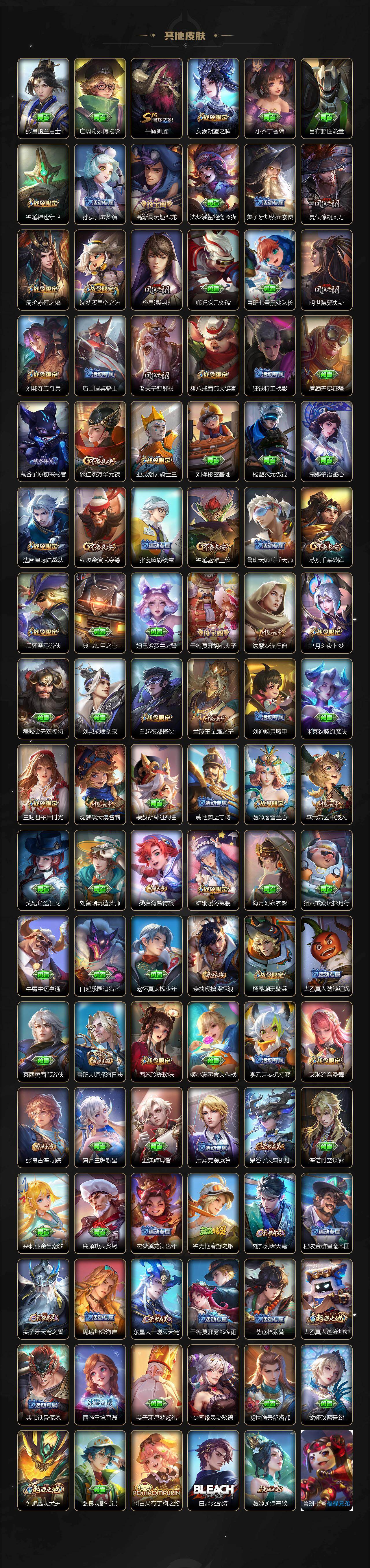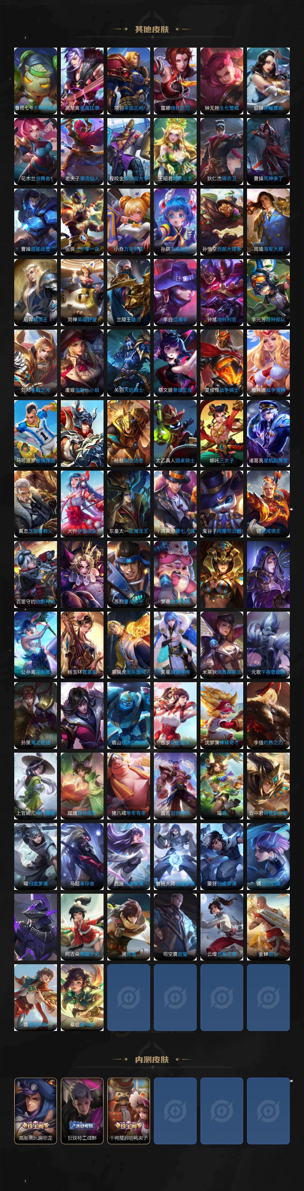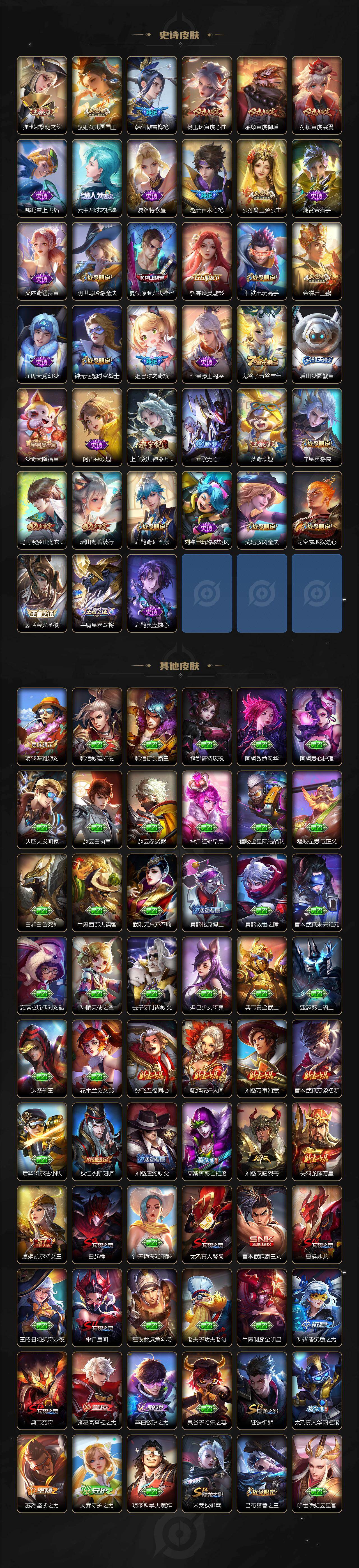 虞姬凯尔特女王,白起狰,太乙真人饕餮,曹操烛龙,芈月重明,典韦穷奇,狂铁御狮,米莱狄御霄,牛魔御旌,夏侯惇朔风刀,明世隐疑决卦,老夫子醍醐杖,鬼谷子原初探秘者,狄仁杰万华元夜,程咬金演武夺筹,钟馗驱傩正仪,苏烈千军破阵,吕布猎兽之王,嬴政白昼王子,女娲朔望之晖,典韦蓝屏警告,钟馗神迹守卫,沈梦溪星空之诺,李元芳银河之约,刘邦夺宝奇兵,马可波罗暗影游猎,元歌云间偶戏,弈星混沌棋,达摩沙漠行僧,兰陵王金庭之子,沈梦溪大漠名商,李元芳云中旅人,桑启海盐诗旅,裴擒虎擒涛扼浪,鲁班大师探海日志,张良古海寻踪