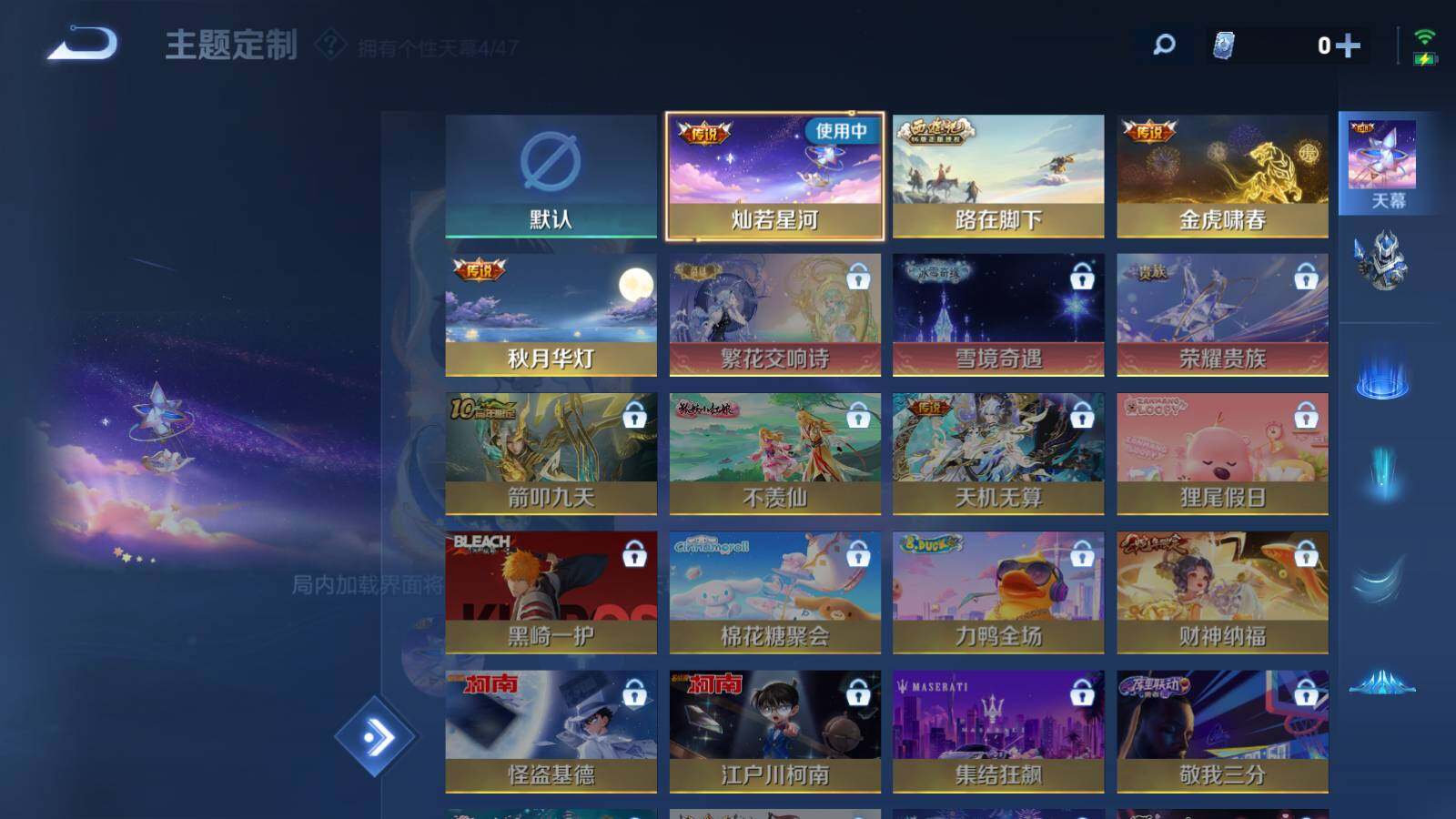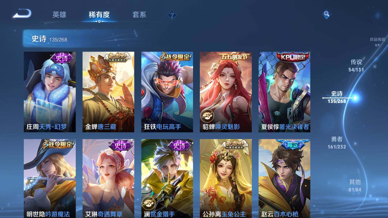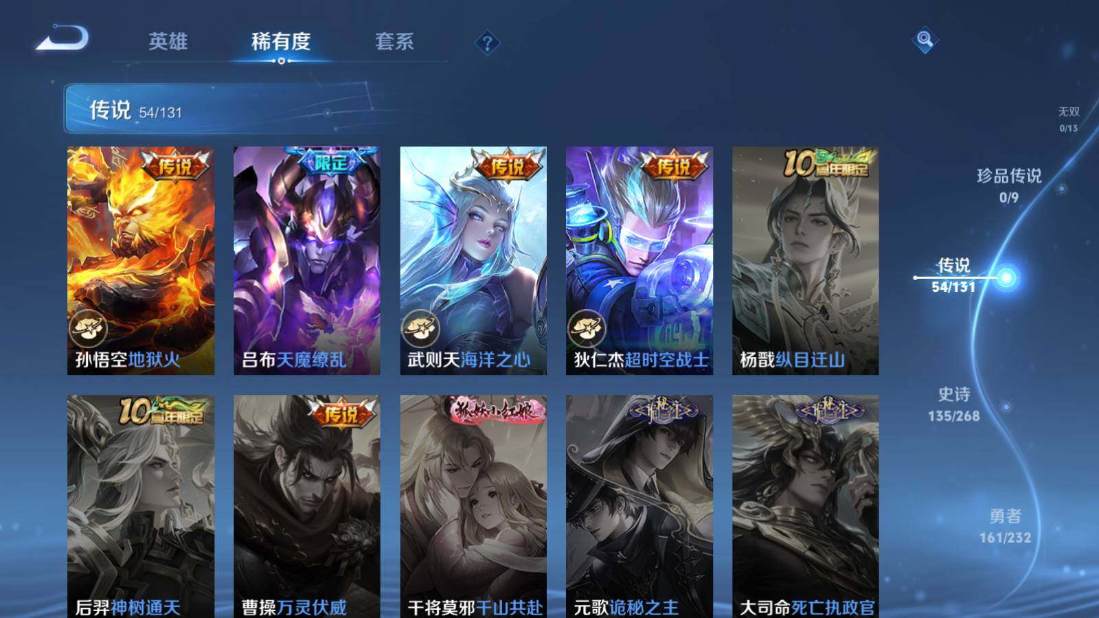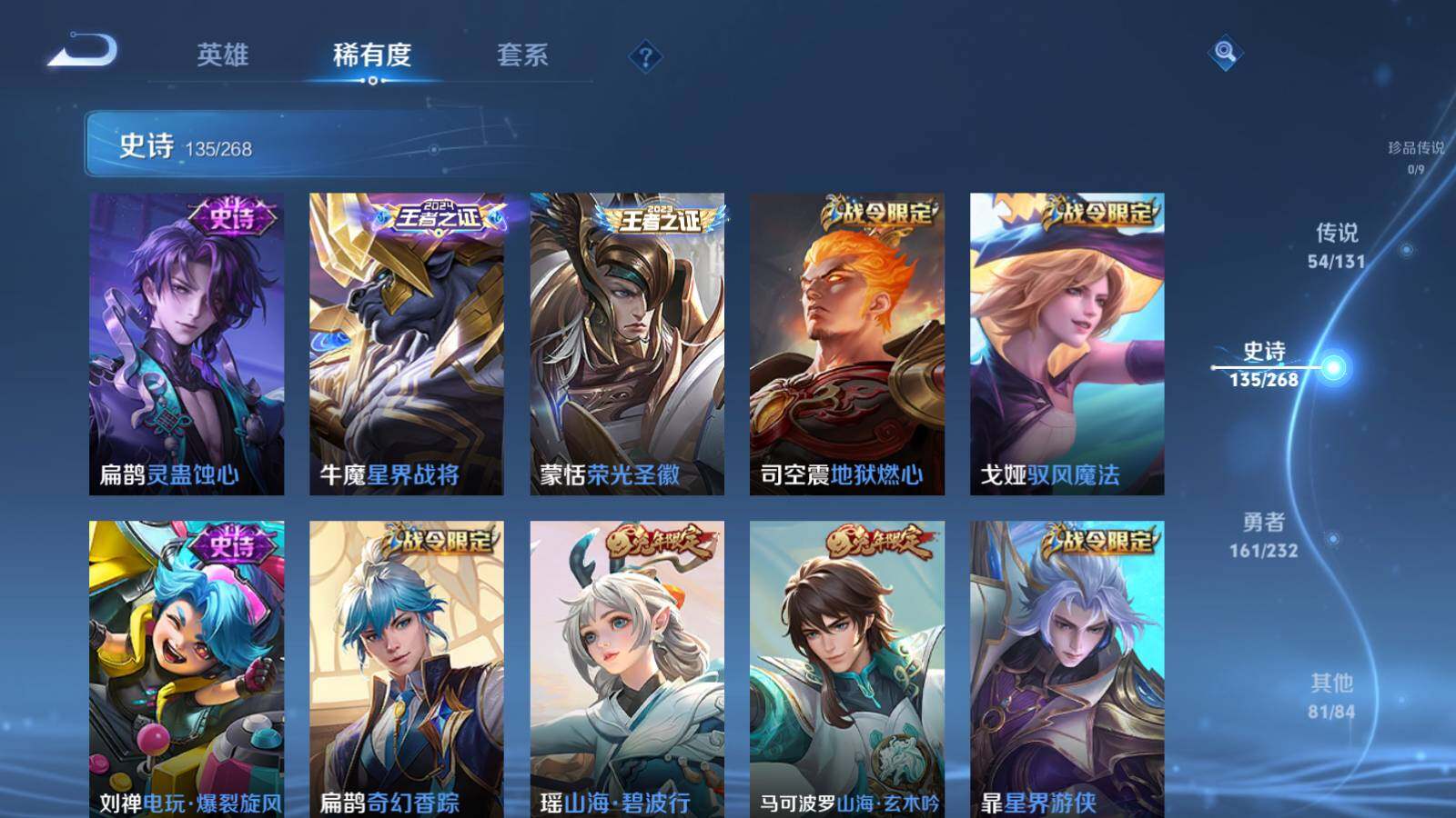 虞姬凯尔特女王,白起狰,太乙真人饕餮,曹操烛龙,芈月重明,典韦穷奇,狂铁御狮,米莱狄御霄,牛魔御旌,夏侯惇朔风刀,明世隐疑决卦,老夫子醍醐杖,鬼谷子原初探秘者,狄仁杰万华元夜,程咬金演武夺筹,钟馗驱傩正仪,苏烈千军破阵,吕布猎兽之王,嬴政白昼王子,女娲朔望之晖,典韦蓝屏警告,钟馗神迹守卫,沈梦溪星空之诺,李元芳银河之约,刘邦夺宝奇兵,马可波罗暗影游猎,元歌云间偶戏,弈星混沌棋,达摩沙漠行僧,兰陵王金庭之子,沈梦溪大漠名商,李元芳云中旅人,桑启海盐诗旅,裴擒虎擒涛扼浪,鲁班大师探海日志,张良古海寻踪