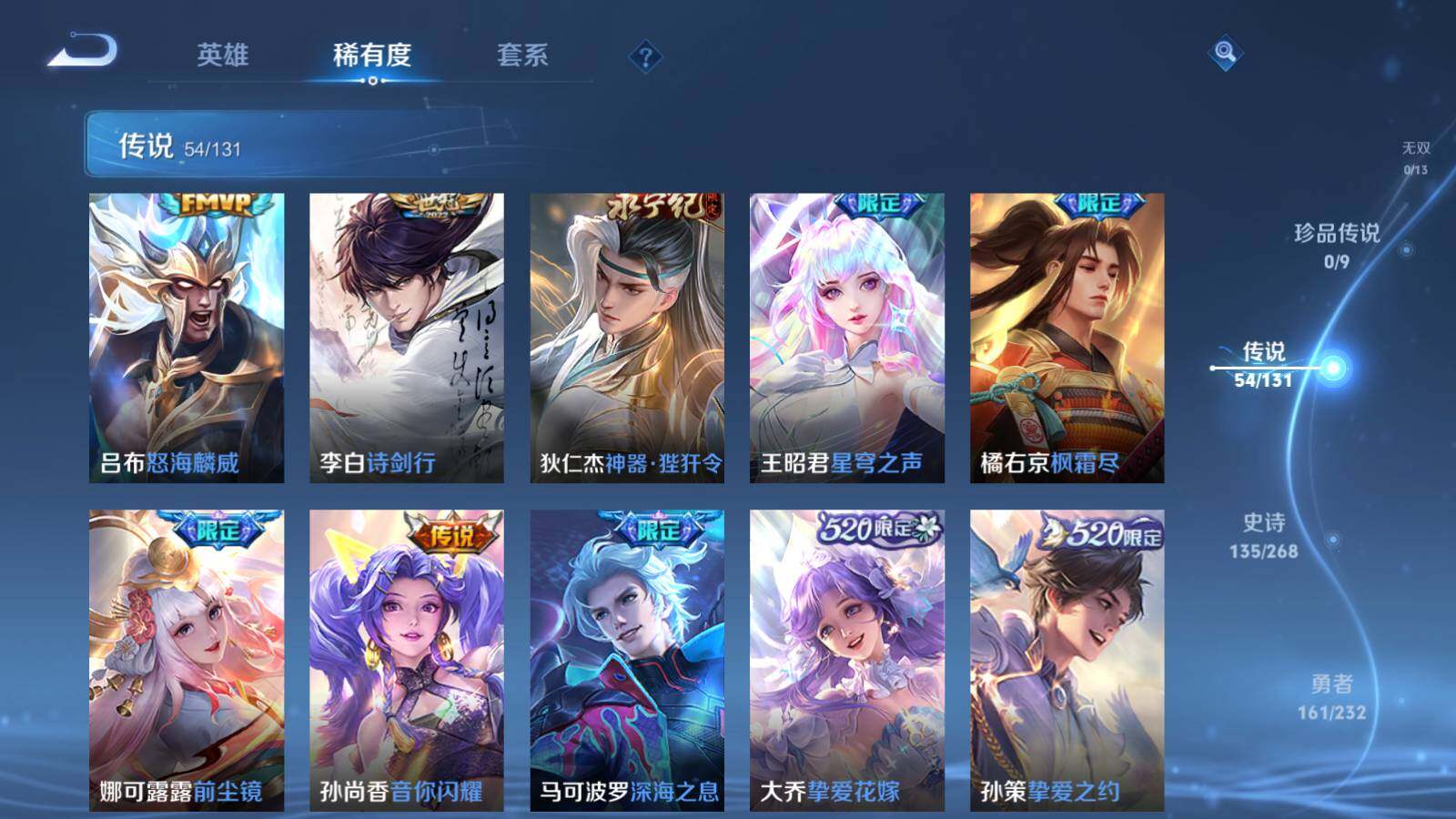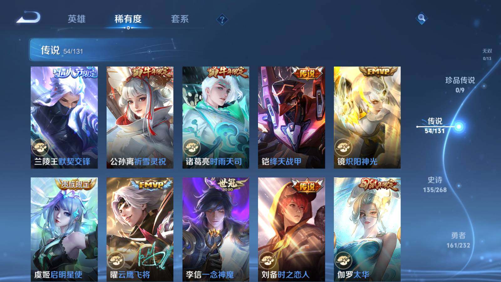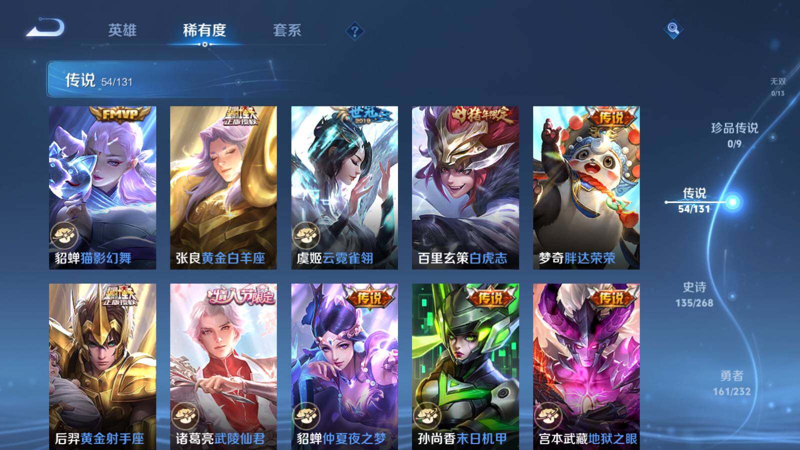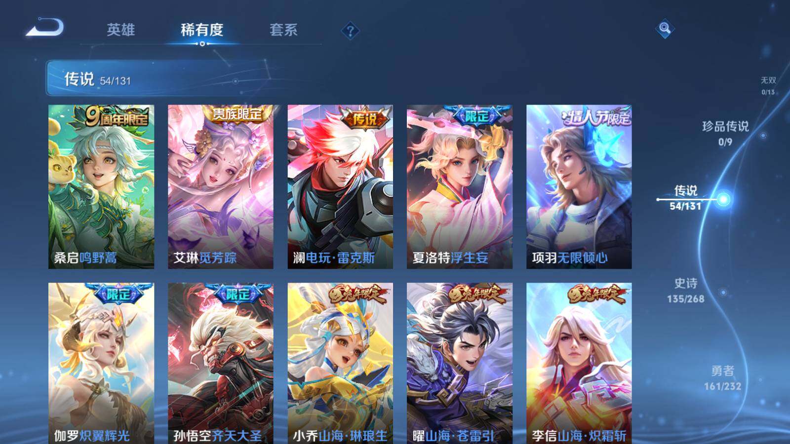 【传说皮肤】:桑启鸣野蒿,艾琳觅芳踪,澜电玩雷克斯,夏洛特浮生妄,项羽无限倾心,伽罗炽翼辉光,孙悟空齐天大圣,小乔山海琳琅生,曜山海苍雷引,李信山海炽霜斩,吕布怒海麟威,李白诗剑行,狄仁杰神器狴犴令,王昭君星穹之声,橘右京枫霜尽,娜可露露前尘镜,孙尚香音你闪耀,马可波罗深海之息,大乔挚爱花嫁,孙策挚爱之约,露娜启示之音,蔡文姬花朝如约,孙策末日机甲,裴擒虎寅虎赤拳,鲁班七号寅虎瑞焰,赵云淬星耀世,王昭君乞巧织情,西施游龙清影,周瑜音你心动,小乔音你心动,兰陵王默契交锋,公孙离祈雪灵祝,诸葛亮时雨天司,铠绛天战甲,镜炽阳神光,虞姬启明星使,曜云鹰飞将,李信一念神魔,刘备时之恋人,伽罗太华,貂蝉猫影幻舞,张良黄金白羊座,虞姬云霓雀翎,百里玄策白虎志,梦奇胖达荣荣,后羿黄金射手座,诸葛亮武陵仙君,貂蝉仲夏夜之梦,孙尚香末日机甲,宫本武藏地狱之眼,孙悟空地狱火,吕布天魔缭乱,武则天海洋之心,狄仁杰超时空战士