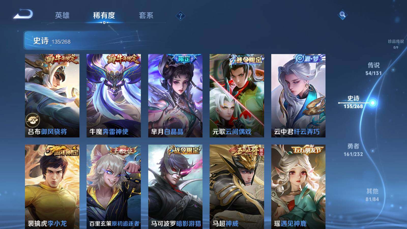 裴擒虎李小龙,上官婉儿梁祝,牛魔奔雷神使,公孙离祈雪灵祝,吕布御风骁将,诸葛亮时雨天司,马超神威,后羿辉光之辰,伽罗太华,裴擒虎天狼狩猎者,铠青龙志,百里玄策白虎志,花木兰瑞麟志,苏烈玄武志,百里守约朱雀志,项羽霸王别姬,虞姬霸王别姬,小乔纯白花嫁,孙悟空大圣娶亲,花木兰默契交锋,兰陵王默契交锋,后羿如梦令,妲己热情桑巴,干将莫邪冰霜恋舞曲,芈月白晶晶,赵云引擎之心,猪八戒猪悟能,廉颇寅虎·御盾,孙悟空孙行者,甄姬女儿国国王,镜匿光追影者,韩信傲雪梅枪,鲁班七号寅虎·瑞焰,孙膑寅虎·展翼,杨玉环寅虎·心曲,裴擒虎寅虎·赤拳,云中君时之祈愿,赵云百木心枪,公孙离玉兔公主,露娜启示之音,夏侯惇匿光决锋者,马可波罗深海之息,金蝉唐三藏,娜可露露前尘镜,橘右京枫霜尽,妲己时之奇旅,王昭君星穹之声,上官婉儿神器·万象笔,盾山梦圆繁星,李白诗剑行,马可波罗山海·玄木吟,瑶山海·碧波行,桑启鸣野蒿