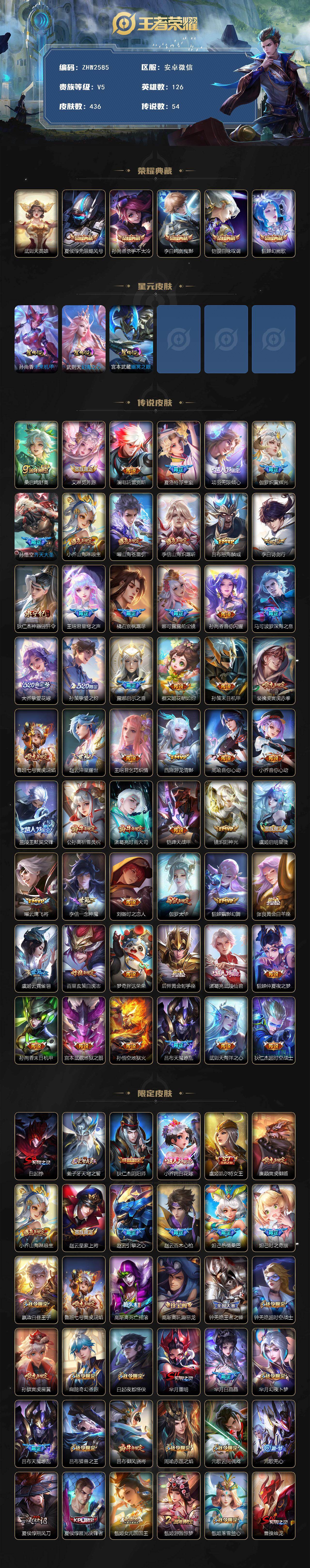 [15539143]安卓WX!信用分不足介意勿拍!V10-126英雄-436皮肤-5典藏皮肤-1典藏英雄-54传说-135史诗