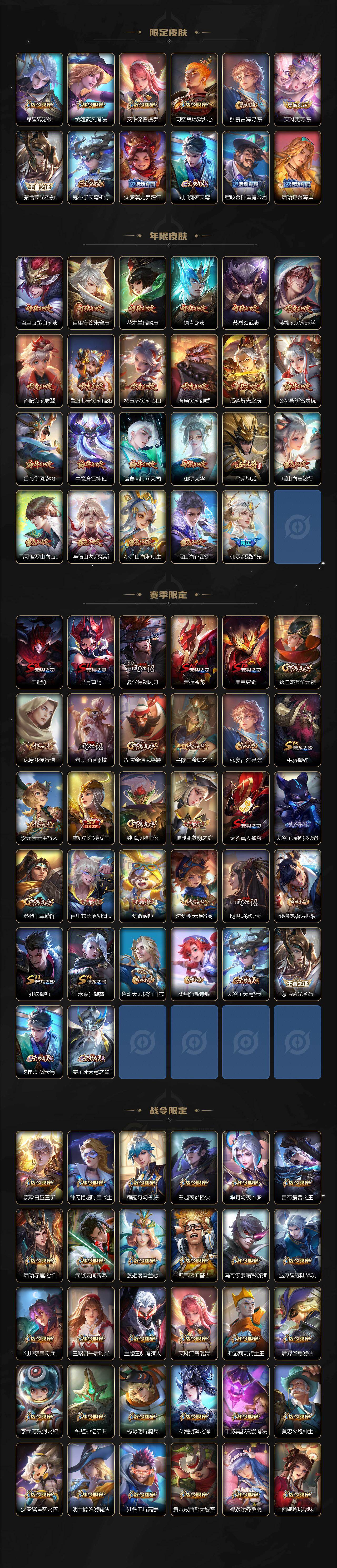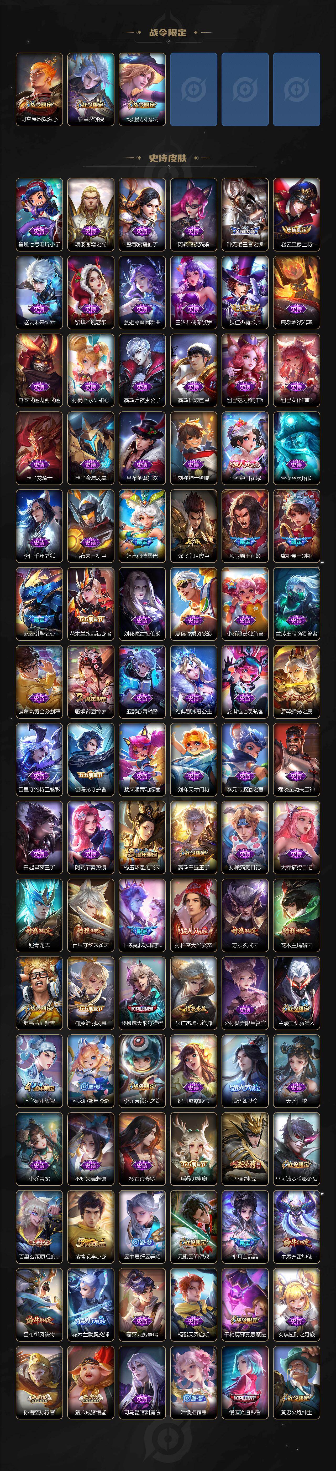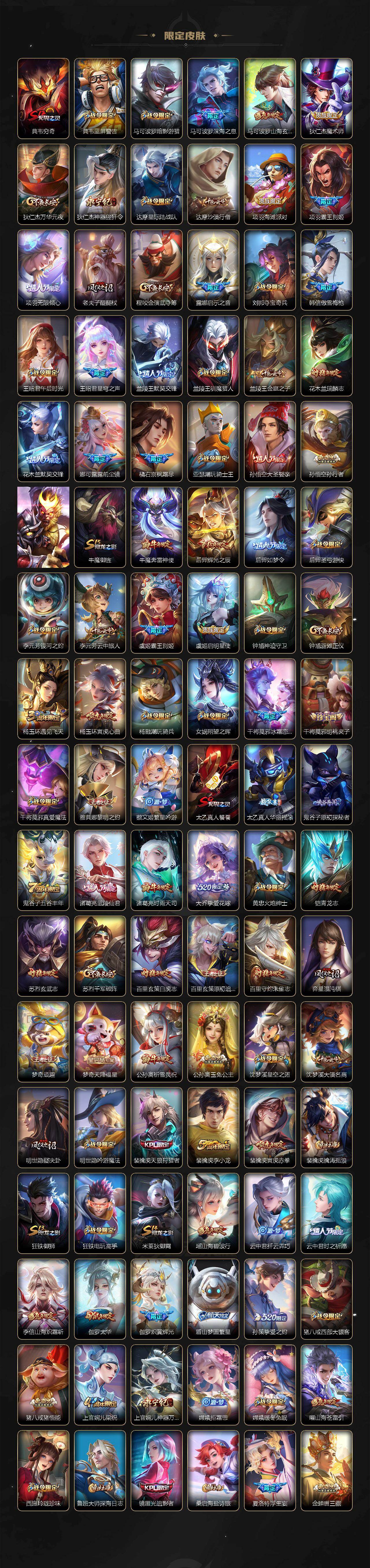 【限定皮肤】:白起狰,姜子牙天穹之誓,狄仁杰阴阳师,小乔纯白花嫁,虞姬凯尔特女王,廉颇寅虎御盾,小乔山海琳琅生,赵云皇家上将,赵云引擎之心,赵云百木心枪,妲己热情桑巴,妲己时之奇旅,嬴政白昼王子,鲁班七号寅虎瑞焰,高渐离死亡摇滚,高渐离玩趣恶龙,钟无艳王者之锤,钟无艳超时空战士,孙膑寅虎展翼,扁鹊奇幻香踪,白起夜都怪侠,芈月重明,芈月白晶晶,芈月幻夜卜梦,吕布天魔缭乱,吕布猎兽之王,吕布御风骁将,周瑜赤莲之焰,元歌云间偶戏,元歌无心,夏侯惇朔风刀,夏侯惇匿光决锋者,甄姬女儿国国王,甄姬游园惊梦,甄姬落雪兰心,曹操烛龙,典韦穷奇,典韦蓝屏警告,马可波罗暗影游猎,马可波罗深海之息,马可波罗山海玄木吟,狄仁杰魔术师,狄仁杰万华元夜,狄仁杰神器狴犴令,达摩星际陆战队,达摩沙漠行僧,项羽海滩派对,项羽霸王别姬,项羽无限倾心,老夫子醍醐杖,程咬金演武夺筹,露娜启示之音,刘邦夺宝奇兵,韩信傲雪梅枪,王昭君午后时光,王昭君星穹之声,兰陵王默契交锋,兰陵