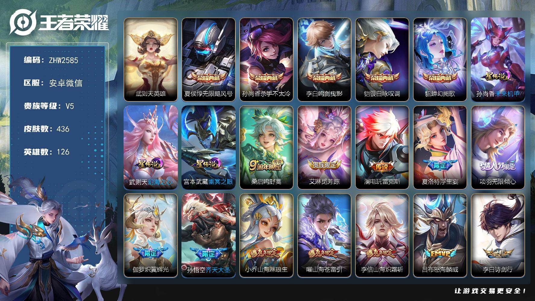 [15539143]安卓WX!信用分不足介意勿拍!V10-126英雄-436皮肤-5典藏皮肤-1典藏英雄-54传说-135史诗 【英雄全皮】:刘邦全皮,娜可露露全皮,橘右京全皮,太乙真人全皮,梦奇全皮,李信全皮,猪八戒全皮,夏洛特全皮,金蝉全皮,戈娅全皮 【荣耀典藏】:武则天英雄,夏侯惇无限飓风号,孙尚香杀手不太冷,李白鸣剑曳影,铠银白咏叹调,貂蝉幻阙歌 【传说皮肤】:桑启鸣野蒿,艾琳觅芳踪,澜电玩雷克斯,夏洛特浮生妄,项羽无限倾心,伽罗炽翼辉光,孙悟空齐天大圣,小乔山海琳琅生,曜山海苍雷引,李信山海炽霜斩,吕布怒海麟威,李白诗剑行,狄仁杰神器狴犴令,王昭君星穹之声,橘右京枫霜尽,娜可露露前尘镜,孙尚香音你闪耀,马可波罗深海之息,大乔挚爱花嫁,孙策挚爱之约,露娜启示之音,蔡文姬花朝如约,孙策末日机甲,裴擒虎寅虎赤拳,鲁班七号寅虎瑞焰,赵云淬星耀世,王昭君乞巧织情,西施游龙清影,周瑜音你心动,小乔音你心动,兰陵王默契交锋,公孙离祈雪灵祝,诸葛亮时雨天司,铠绛天战甲,镜炽阳神光,虞姬启明星使,曜云鹰飞将,李信一念神魔,刘备时之恋人,伽罗太华,貂蝉猫影幻舞,张良黄金白羊座,虞姬云霓雀翎,百里玄策白虎志,梦奇胖达荣荣,后羿黄金射手座,诸葛亮武陵仙君,貂蝉仲夏夜之梦,孙尚香末日机甲,宫本武藏地狱之眼,孙悟空地狱火,吕布天魔缭乱,武则天海洋之心,狄仁杰超时空战士 【限定皮肤】:白起狰,姜子牙天穹之誓,狄仁杰阴阳师,小乔纯白花嫁,虞姬凯尔特女王,廉颇寅虎御盾,小乔山海琳琅生,赵云皇家上将,赵云引擎之心,赵云百木心枪,妲己热情桑巴,妲己时之奇旅,嬴政白昼王子,鲁班七号寅虎瑞焰,高渐离死亡摇滚,高渐离玩趣恶龙,钟无艳王者之锤,钟无艳超时空战士,孙膑寅虎展翼,扁鹊奇幻香踪,白起夜都怪侠,芈月重明,芈月白晶晶,芈月幻夜卜梦,吕布天魔缭乱,吕布猎兽之王,吕布御风骁将,周瑜赤莲之焰,元歌云间偶戏,元歌无心,夏侯惇朔风刀,夏侯惇匿光决锋者,甄姬女儿国国王,甄姬游园惊梦,甄姬落雪兰心,曹操烛龙,典韦穷奇,典韦蓝屏警告,马可波罗暗影游猎,马可波罗深海之息,马可波罗山海玄木吟,狄仁杰魔术师,狄仁杰万华元夜,狄仁杰神器狴犴令,达摩星际陆战队,达摩沙漠行僧,项羽海滩派对,项羽霸王别姬,项羽无限倾心,老夫子醍醐杖,程咬金演武夺筹,露娜启示之音,刘邦夺宝奇兵,韩信傲雪梅枪,王昭君午后时光,王昭君星穹之声,兰陵王默契交锋,兰陵
