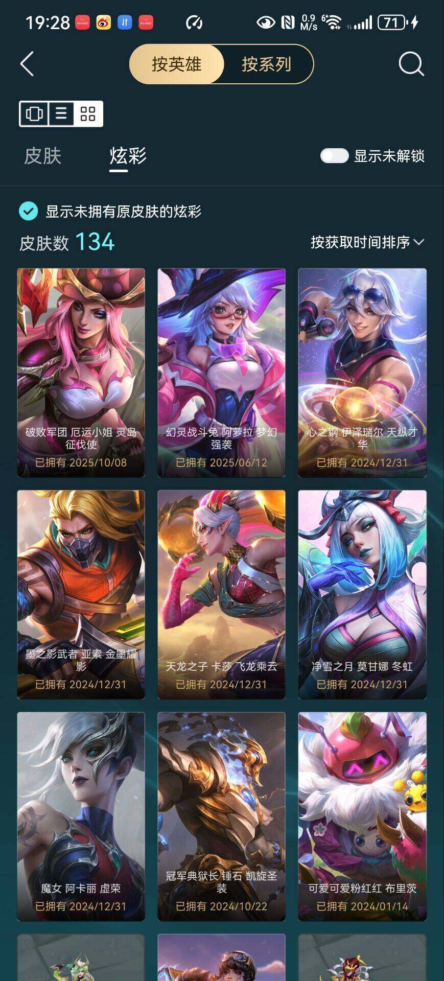 【臻彩皮肤】:天龙之子卡莎飞龙乘云,无畏骑士瑟庄妮赤子初心,墨之影武者亚索金墨耀影,冠军典狱长锤石凯旋圣装,泳池派对凯特琳粉红冰川,破败军团厄运小姐灵岛征伐使,可爱可爱粉红红布里茨,魔女阿卡丽虚荣,净雪之月莫甘娜冬虹,幻灵战斗兔阿萝拉梦幻强袭,心之钢伊泽瑞尔天纵才华