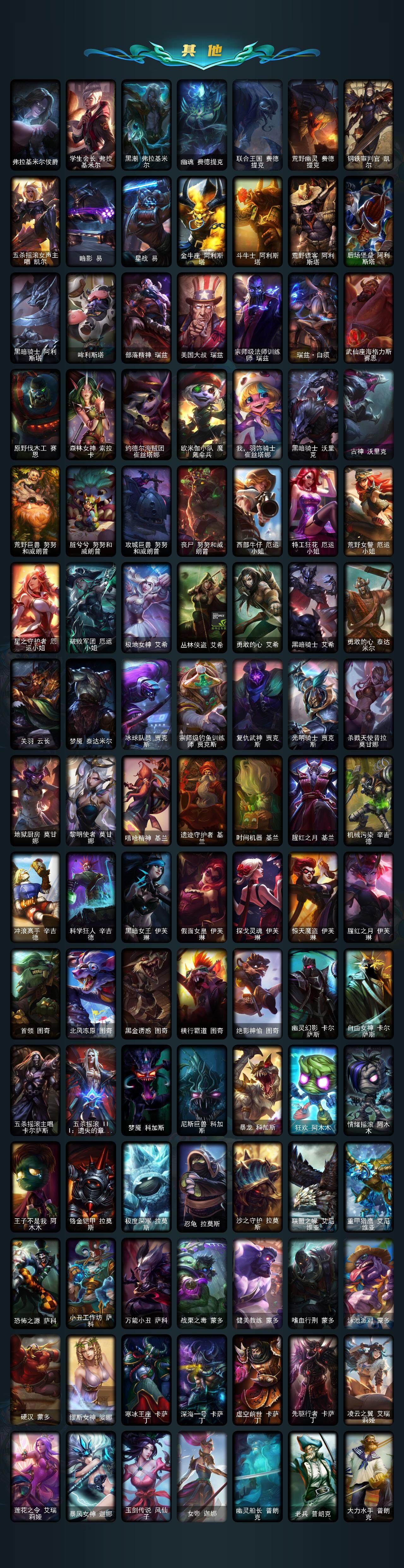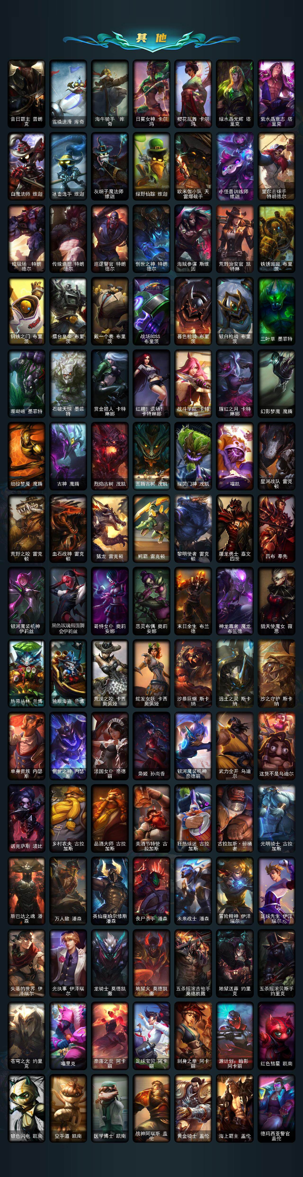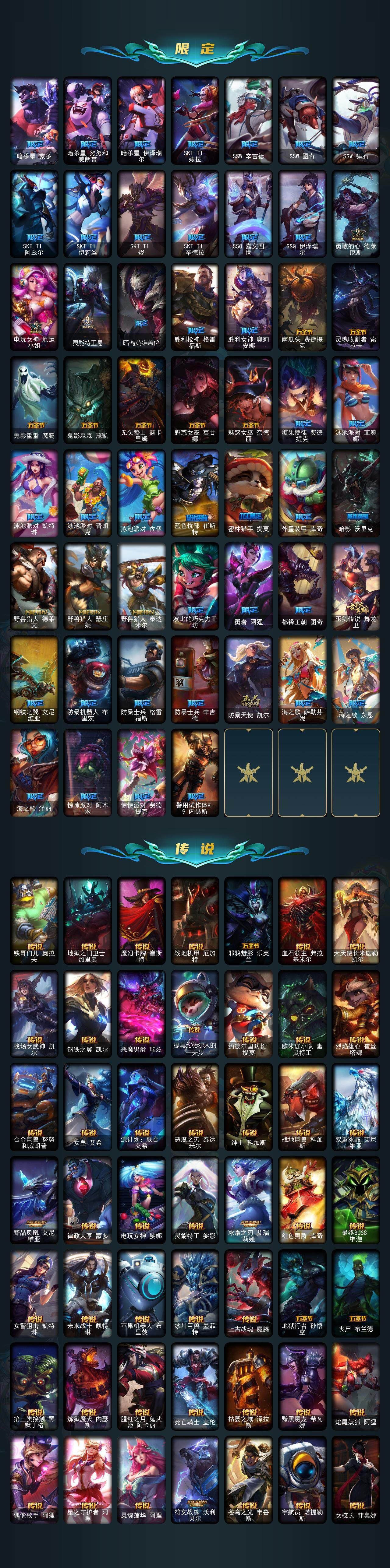 【限定皮肤】:生化领主泰达米尔,送披萨的小姐姐希维尔,地底世界崔斯特,冠军之血希瓦娜,Fnatic古拉加斯,Fnatic迦娜,暗杀星奥莉安娜,暗杀星蒙多,暗杀星努努和威朗普,暗杀星伊泽瑞尔,SKTT1婕拉,SSW辛吉德,SSW图奇,SSW锤石,SKTT1阿兹尔,SKTT1伊莉丝,SKTT1烬,SKTT1辛德拉,SSG嘉文四世,SSG伊泽瑞尔,勇敢的心德莱厄斯,电玩女神厄运小姐,灵能特工易,暗裔英雄盖伦,胜利枪神格雷福斯,胜利女神奥莉安娜,南瓜头费德提克,灵魂收割者索拉卡,鬼影重重魔腾,鬼影森森茂凯,无头骑士赫卡里姆,魅惑女巫莫甘娜,魅惑女巫奈德丽,糖果使徒费德提克,泳池派对菲奥娜,泳池派对凯特琳,泳池派对普朗克,