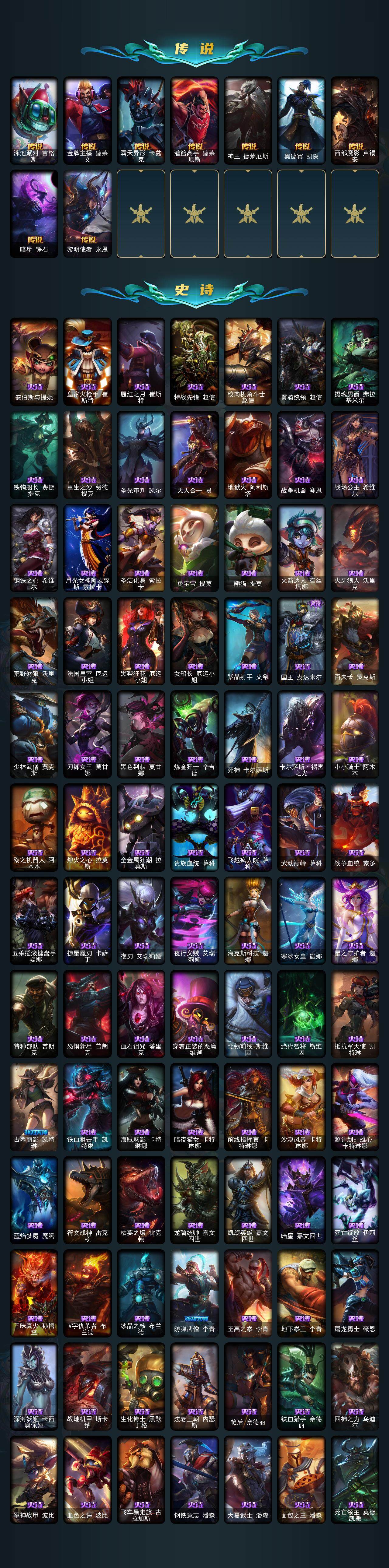 【年限皮肤】:古琴余韵娑娜,你看见过我的熊猫吗安妮,碧玉之牙卡西奥佩娅,替父从军花木兰,美猴王孙悟空,紫金罗刹莫甘娜,玉净夜叉凯特琳,张辽文远,烈焰美人薇恩,天龙之子斯莫德