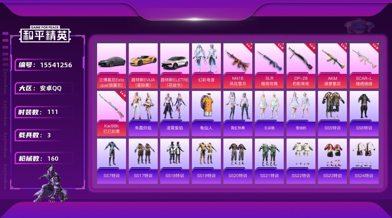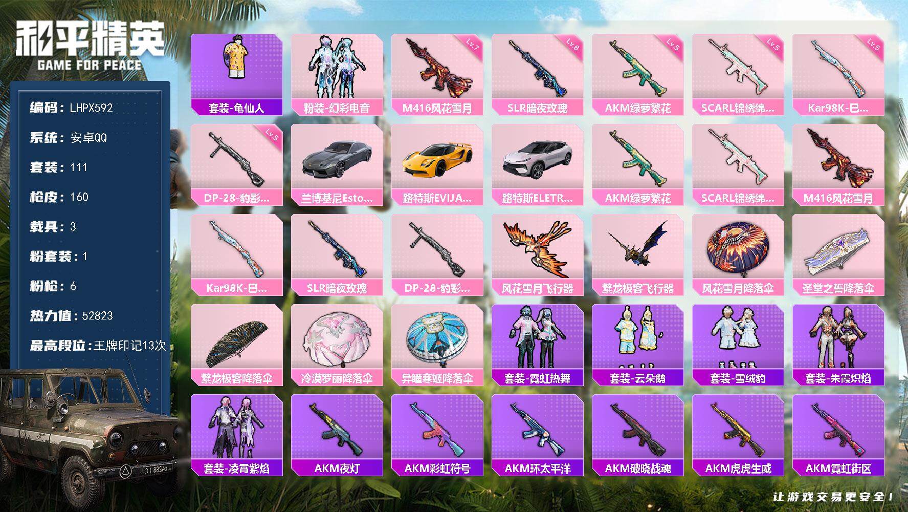 [15541256]【特价出售/店主推荐】安卓 手Q-1粉装-6特效枪-3载具-2粉色飞行器-52823热力值-13王牌印记-111套装-160枪皮 【热门品类】:套装-龟仙人 【粉色套装】:粉装-幻彩电音 【粉色枪皮等级】:AKM-绿萝繁花(五级),SCAR-L-锦绣绵绵(五级),M416-风花雪月(七级),Kar98K-巳巳如意(五级),SLR-暗夜玫瑰(六级),DP-28-豹影疾电(五级) 【粉色载具】:兰博基尼Estoque(银翼灰),路特斯EVIJA(星际黄),路特斯ELETRE(花绽灰) 【粉色枪皮】:AKM-绿萝繁花,SCAR-L-锦绣绵绵,M416-风花雪月,Kar98K-巳巳如意,SLR-暗夜玫瑰,DP-28-豹影疾电 【粉色飞行器】:风花雪月飞行器,繁龙极客飞行器 【粉色降落伞】:风花雪月降落伞,圣堂之誓降落伞,繁龙极客降落伞,冷漠罗丽降落伞,异瞳寒姬降落伞 【稀有套装】:套装-龟仙人,套装-霓虹热舞,套装-云朵鹅,套装-雪绒豹,套装-朱霞炽焰,套装-凌霄紫焰 【稀有枪皮】:AKM-夜灯,AKM-彩虹符号,AKM-环太平洋,AKM-破晓战魂,AKM-虎虎生威,AKM-霓虹街区,AKM-龙的传人,M16A4-幻世战舞者,M16A4-魔法学院,SCAR-L-夜灯,SCAR-L-炫彩节奏,SCAR-L-玉兔迎春,M416-红色方程式,M416-蓝色火焰,GROZA-懵萌河马,GROZA-生命誓言,AUG-天降萌叽,AUG-耀粉歌者,QBZ-彩虹符号,QBZ-未来歌姬,M762-天降萌叽,M762-奇异狩猎者,M762-拳皇97,M762-牛气冲天,M762-瑞龙福将,M762-第五大道,M762-风花雪月,M762-云朵鹅,Mk47-洛神天依,G36C-懵萌河马,G36C-星穹咏叹调,AC-VAL-天降萌叽,AC-VAL-快闪甜心,蜜獾-垂柳戏鸭,蜜獾-天降萌叽,ARX-凌霄紫焰,UZI-啾咪啾咪,UZI-炫彩节奏,UZI-红色方程式,UMP45-夜灯,UMP45-涂山之恋,UMP45-生命誓言,Vector-焰鹰斗篷,Vector-彩虹符号,Vector-暗夜玫瑰,Vector-生命誓言,汤姆逊-天降萌叽,汤姆逊-暗夜鎏金,野牛-电玩视界,JS9-凌霄紫焰,P90-快闪甜心,P90-巳巳如意,Kar98K-炫彩节奏,Kar98K-王子的夏天,Kar98K-红色方程式,