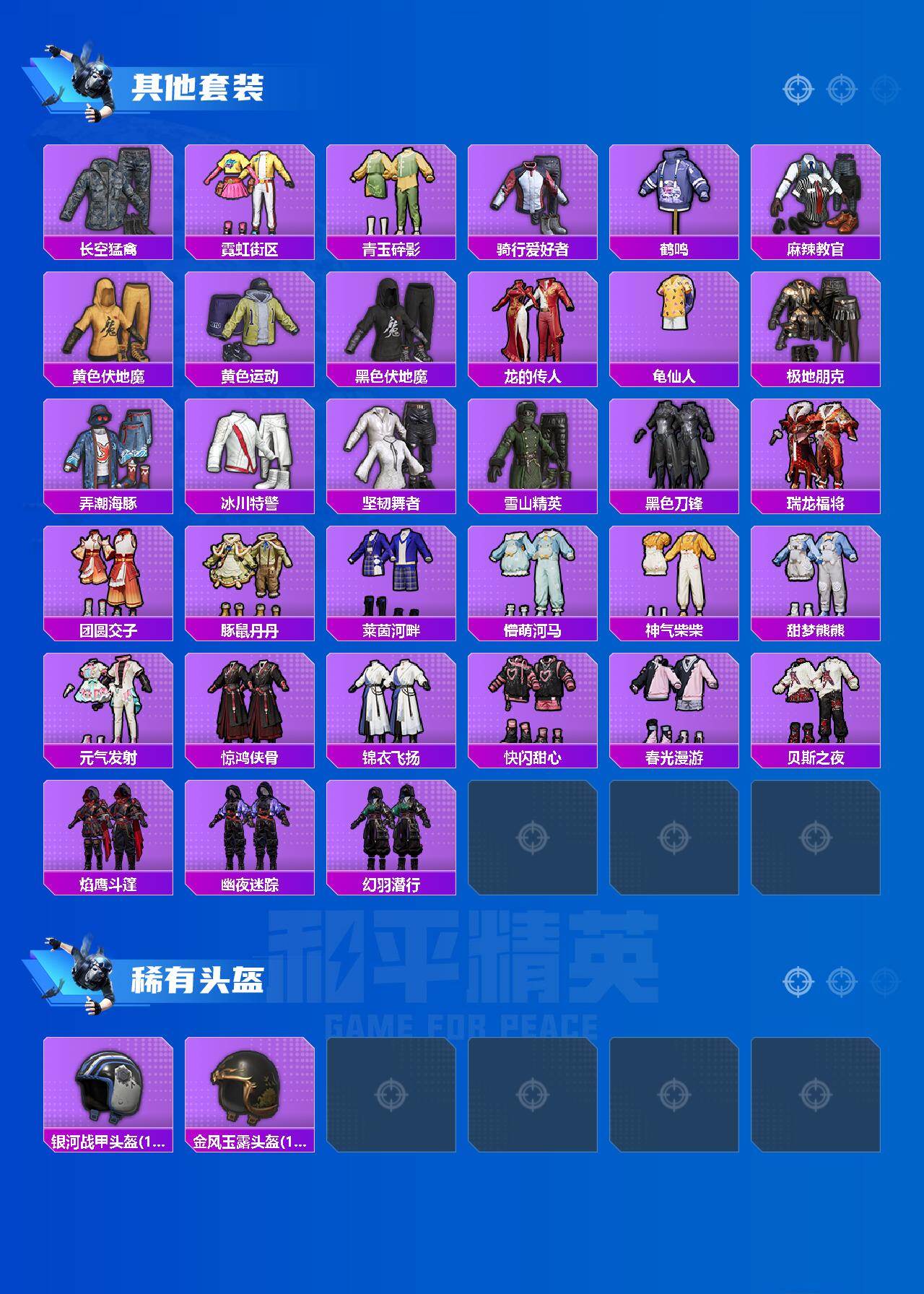 【稀有枪皮】:AKM-夜灯,AKM-彩虹符号,AKM-环太平洋,AKM-破晓战魂,AKM-虎虎生威,AKM-霓虹街区,AKM-龙的传人,M16A4-幻世战舞者,M16A4-魔法学院,SCAR-L-夜灯,SCAR-L-炫彩节奏,SCAR-L-玉兔迎春,M416-红色方程式,M416-蓝色火焰,GROZA-懵萌河马,GROZA-生命誓言,AUG-天降萌叽,AUG-耀粉歌者,QBZ-彩虹符号,QBZ-未来歌姬,M762-天降萌叽,M762-奇异狩猎者,M762-拳皇97,M762-牛气冲天,M762-瑞龙福将,M762-第五大道,M762-风花雪月,M762-云朵鹅,Mk47-洛神天依,G36C-懵萌河马,G36C-星穹咏叹调,AC-VAL-天降萌叽,AC-VAL-快闪甜心,蜜獾-垂柳戏鸭,蜜獾-天降萌叽,ARX-凌霄紫焰,UZI-啾咪啾咪,UZI-炫彩节奏,UZI-红色方程式,UMP45-夜灯,UMP45-涂山之恋,UMP45-生命誓言,Vector-焰鹰斗篷,Vector-彩虹符号,Vector-暗夜玫瑰,Vector-生命誓言,汤姆逊-天降萌叽,汤姆逊-暗夜鎏金,野牛-电玩视界,JS9-凌霄紫焰,P90-快闪甜心,P90-巳巳如意,Kar98K-炫彩节奏,Kar98K-王子的夏天,Kar98K-红色方程式,
