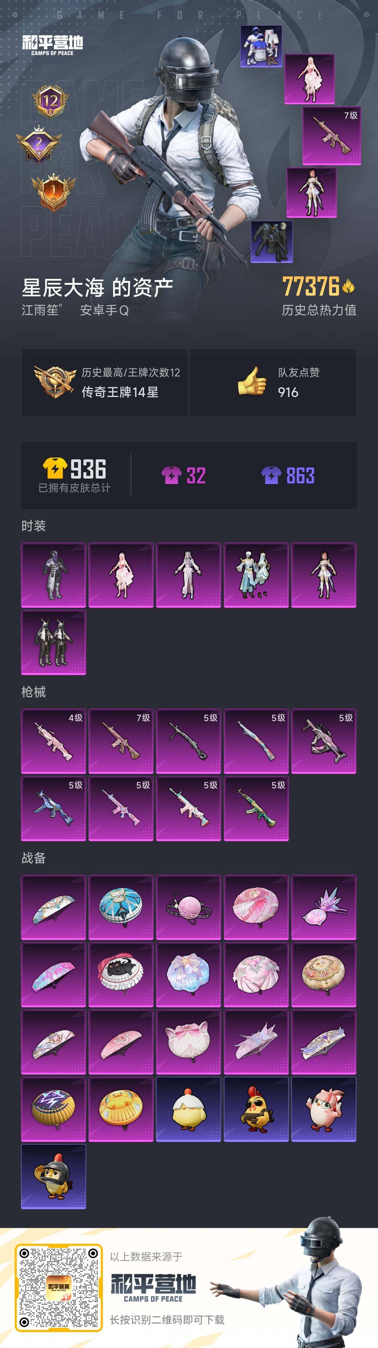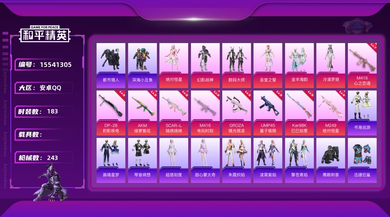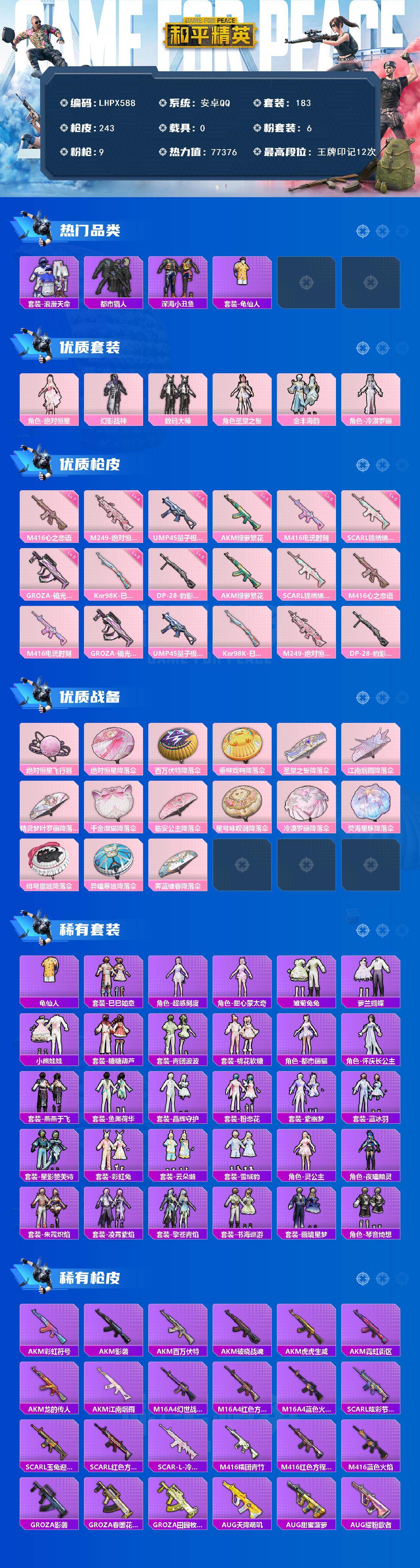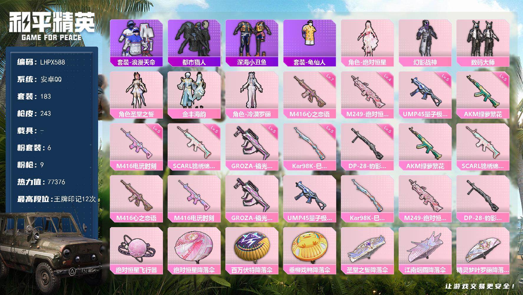 [15541305]【特价出售/店主推荐】安卓 手Q-6粉装-9特效枪-2粉色飞行器-7.7w热力值-12王牌印记-183套装-243枪皮 【热门品类】:套装-浪漫天命,套装-都市猎人,套装-深海小丑鱼,套装-龟仙人 【粉色套装】:角色-绝对恒星,粉装-幻影战神,粉装-数码大师,角色-圣堂之誓,粉装-金丰海韵,角色-冷漠罗丽 【粉色枪皮等级】:AKM-绿萝繁花(五级),SCAR-L-锦绣绵绵(五级),M416-心之恋语(七级),M416-电玩时刻(五级),GROZA-镜光银凌(五级),UMP45-量子极限(五级),Kar98K-巳巳如意(五级),M249-绝对恒星(四级),DP-28-豹影疾电(五级) 【粉色枪皮】:AKM-绿萝繁花,SCAR-L-锦绣绵绵,M416-心之恋语,M416-电玩时刻,GROZA-镜光银凌,UMP45-量子极限,Kar98K-巳巳如意,M249-绝对恒星,DP-28-豹影疾电 【粉色飞行器】:绝对恒星飞行器 【粉色降落伞】:绝对恒星降落伞,百万伏特降落伞,垂柳戏鸭降落伞,圣堂之誓降落伞,江南烟雨降落伞,精灵梦叶罗丽降落伞,千金淑猫降落伞,临安公主降落伞,星穹咏叹调降落伞,冷漠罗丽降落伞,荧海星豚降落伞,绯穹魔姬降落伞,异瞳寒姬降落伞,炫彩糖果降落伞,霁蓝缠春降落伞 【稀有套装】:套装-龟仙人,套装-巳巳如意,角色-超感刻度,角色-甜心蒙太奇,套装-雪国风尚,套装-雏菊兔兔,套装-萝兰蝴蝶,套装-小熊娃娃,套装-糖糖葫芦,套装-青团波波,套装-棉花软糖,角色-都市丽猫,角色-怀庆长公主,套装-燕燕于飞,套装-鱼渊荷华,套装-晶辉守护,套装-粉恋花,套装-紫幽梦,套装-蓝冰羽,套装-星影赞美诗,套装-彩虹兔,套装-云朵鹅,套装-雪绒豹,角色-灵公主,角色-夜瞳黯灵,套装-朱霞炽焰,套装-凌霄紫焰,套装-擎苍青焰,套装-书海巡游,套装-画境星梦,套装-琴音绮想,套装-炫彩糖果 【稀有枪皮】:AUG-冰晶雪宝,AKM-彩虹符号,AKM-影袭,AKM-江南烟雨,AKM-百万伏特,AKM-破晓战魂,AKM-虎虎生威,AKM-霓虹街区,AKM-龙的传人,M16A4-幻世战舞者,M16A4-红色方程式,M16A4-蓝色火焰,SCAR-L-炫彩节奏,SCAR-L-玉兔迎春,SCAR-L-红色方程式,SCAR-L-冷漠罗丽,M416-糯团青竹,M416-红色方程式,M416-