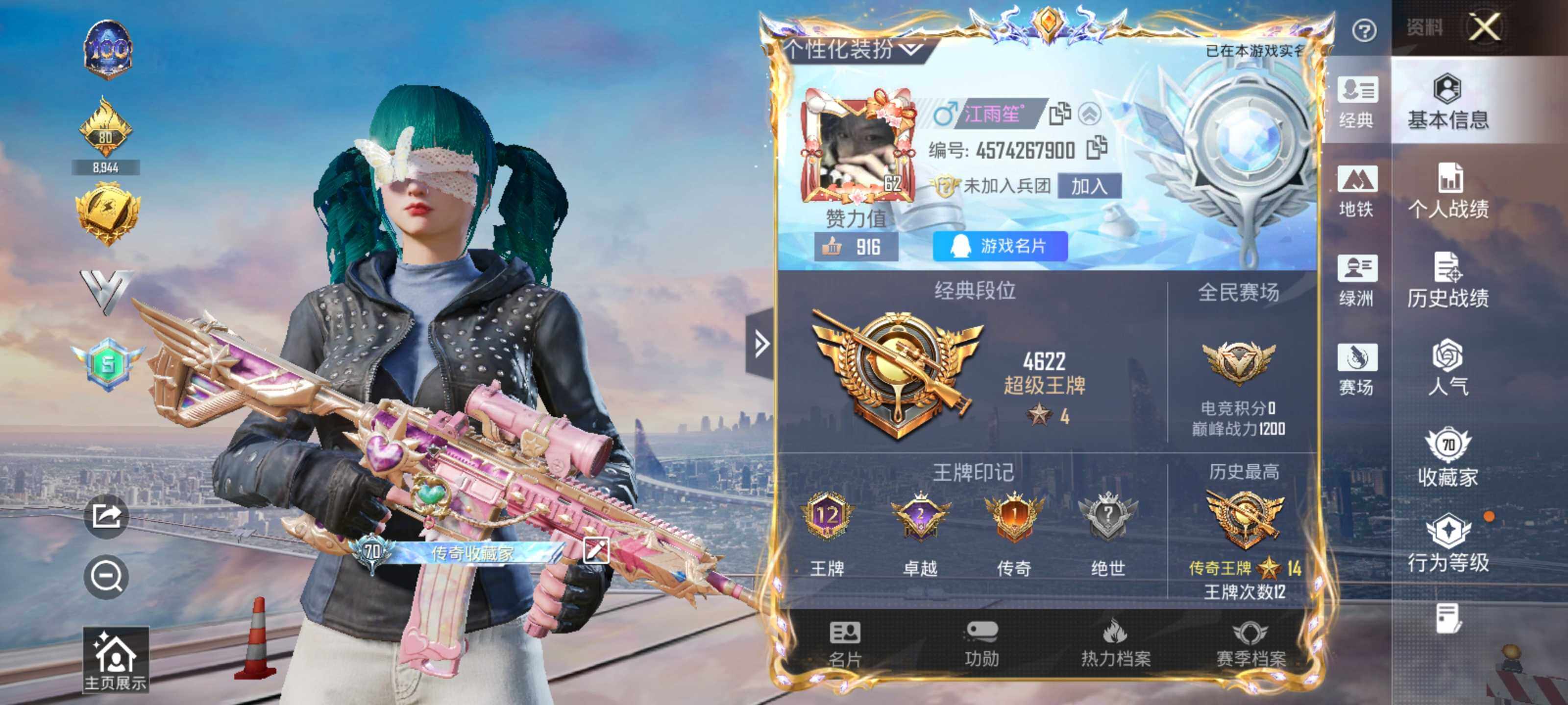 - 苹果微信 不可二次 当前段位超级王牌13星 历史最高段位无敌战神 热力值101627 等级72 套装163 王牌次数12 点券3 外观套装21 枪械皮肤22 热门紫装12 载具3 飞行器4 稀有0 头盔3 背包7