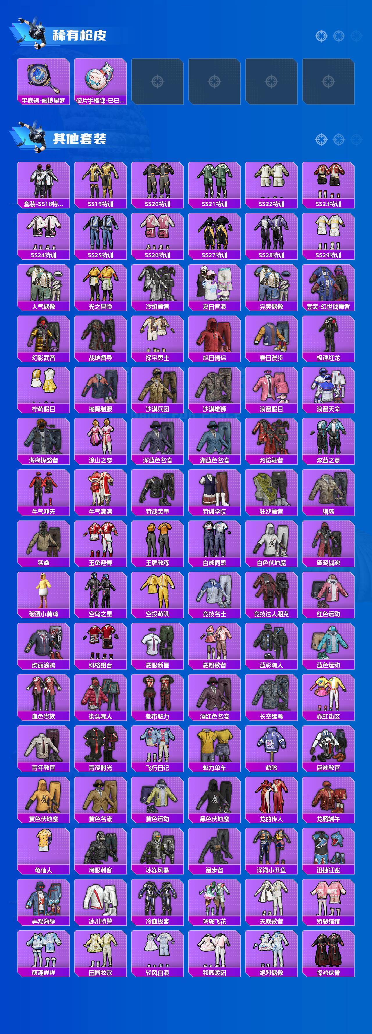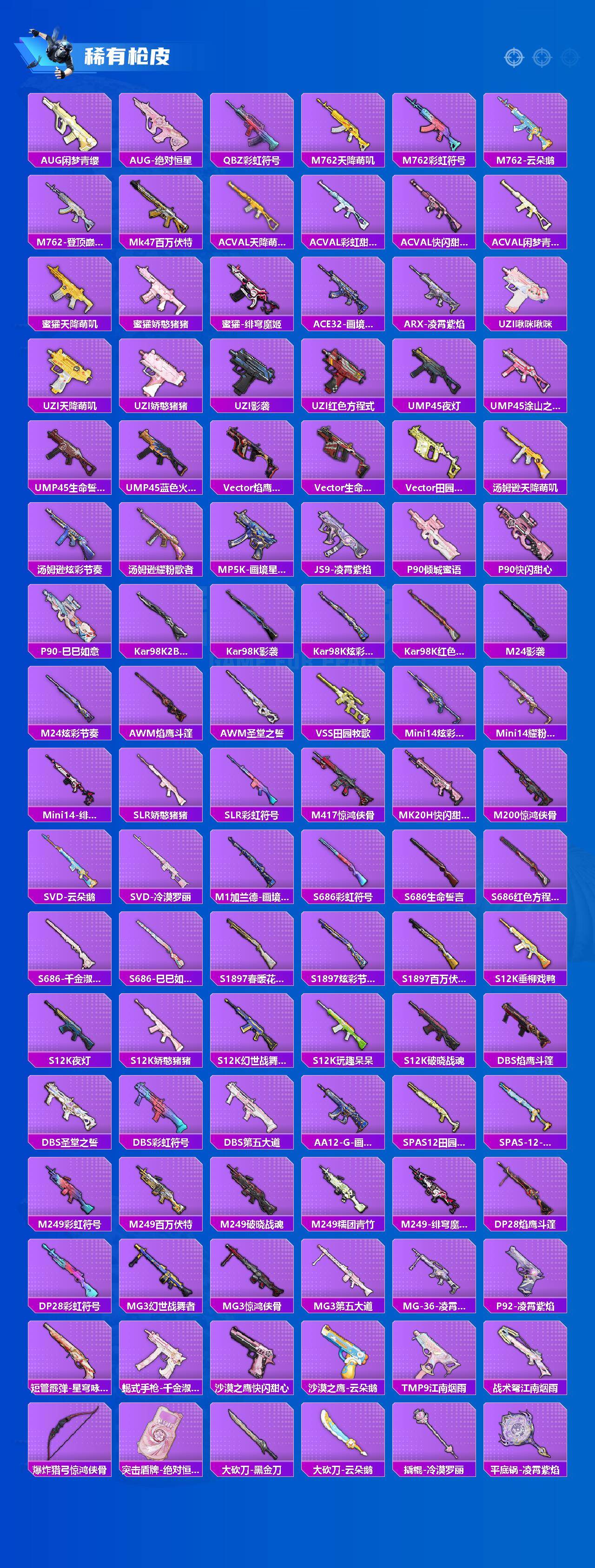 【稀有枪皮】:AUG-冰晶雪宝,AKM-彩虹符号,AKM-影袭,AKM-江南烟雨,AKM-百万伏特,AKM-破晓战魂,AKM-虎虎生威,AKM-霓虹街区,AKM-龙的传人,M16A4-幻世战舞者,M16A4-红色方程式,M16A4-蓝色火焰,SCAR-L-炫彩节奏,SCAR-L-玉兔迎春,SCAR-L-红色方程式,SCAR-L-冷漠罗丽,M416-糯团青竹,M416-红色方程式,M416-