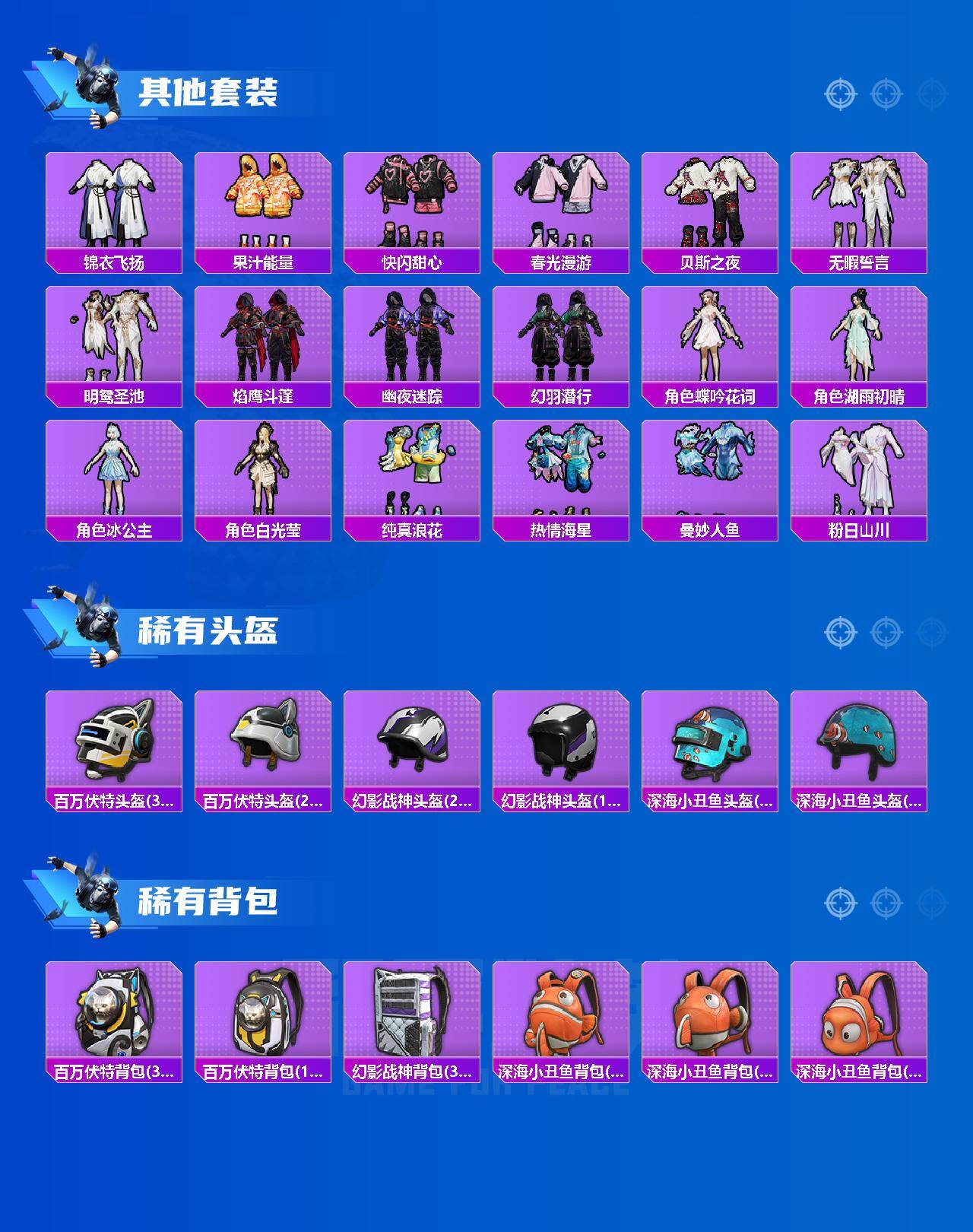 套装-都市猎人,套装-深海小丑鱼,套装-幻影战神,套装-数码大师,角色-圣堂之誓,套装-金丰海韵,套装-鹰眼刺客,套装-迅捷狂鲨