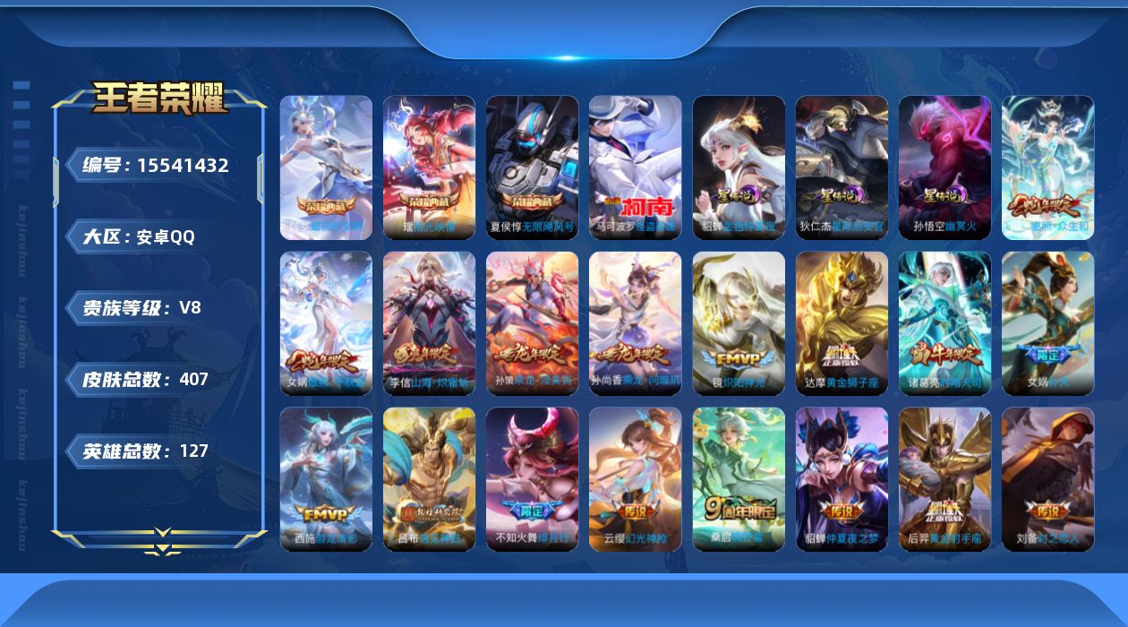 - PX_2093921-实名: 可修改 贵族等级: V5 英雄数: 77 皮肤数: 46 传说皮: 云鹰飞将 限定皮: 逐霄战戟,愿照·山河定