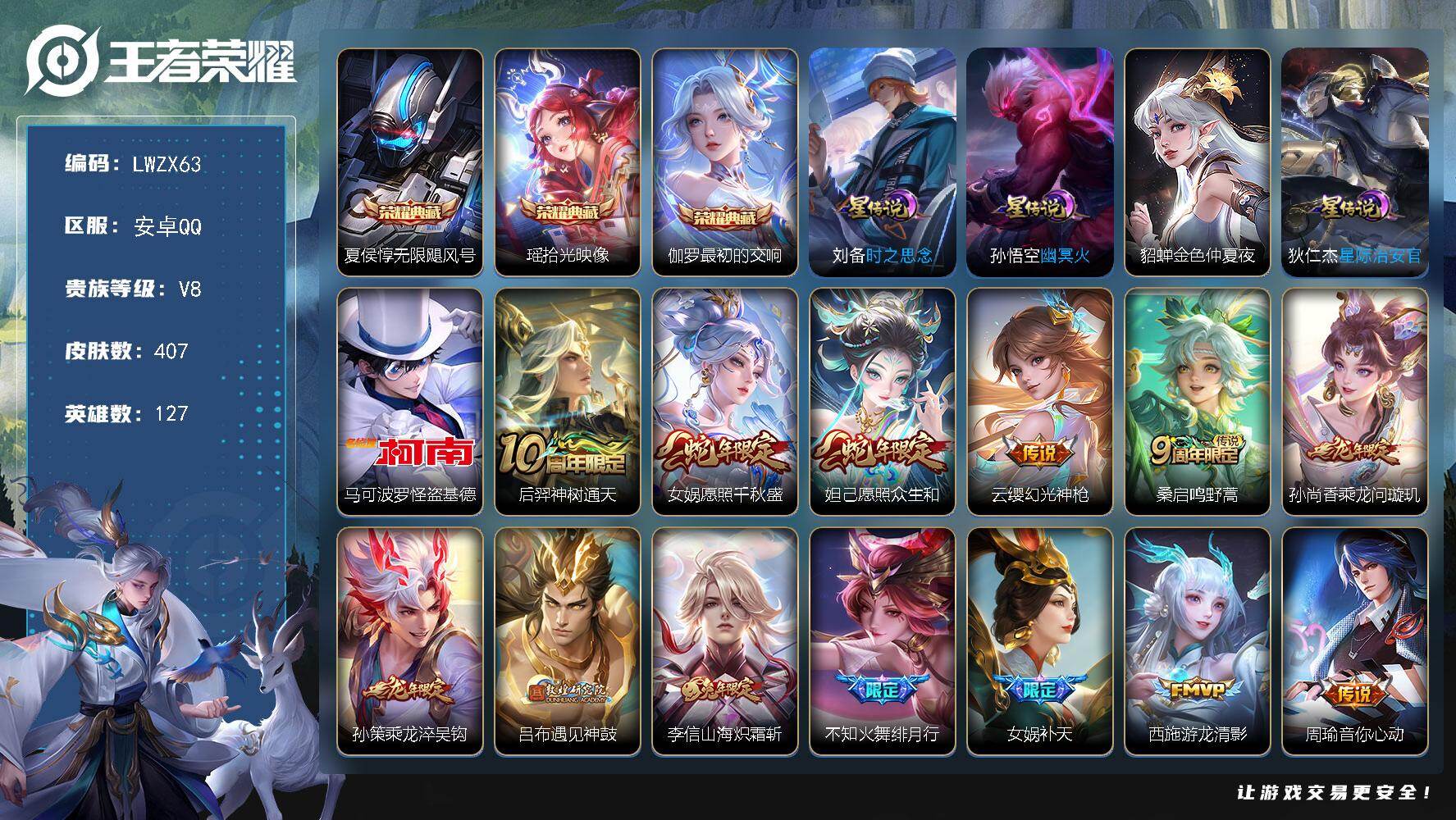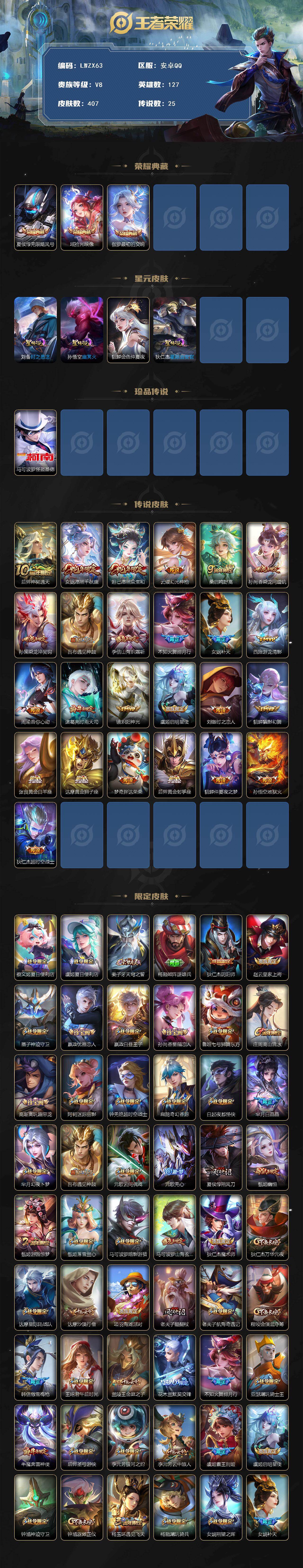 [15541432]可二次【特价出售/店主推荐】安卓Q-V8-最强王者段位-127英雄-407皮肤-3典藏皮肤-1珍品传说-25传说-126史诗-4星元