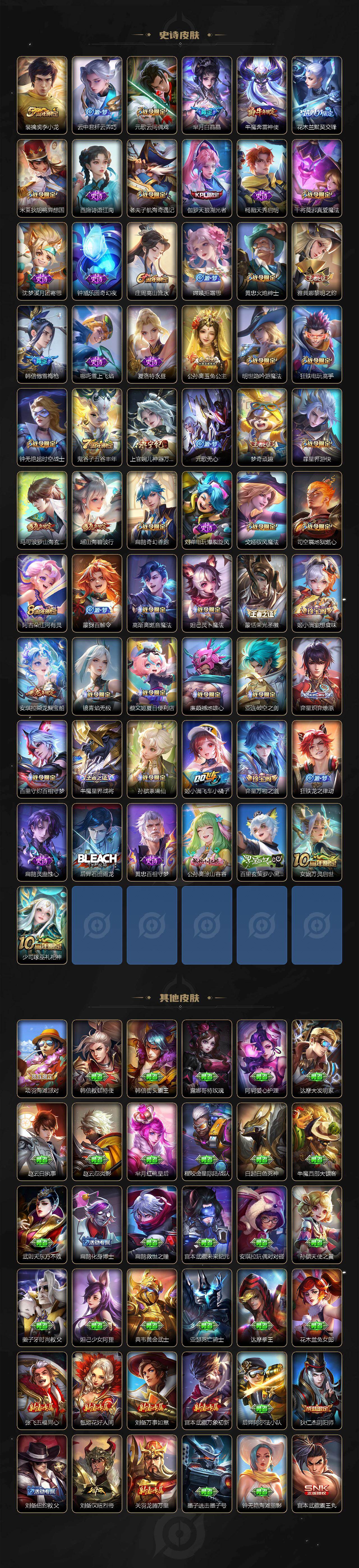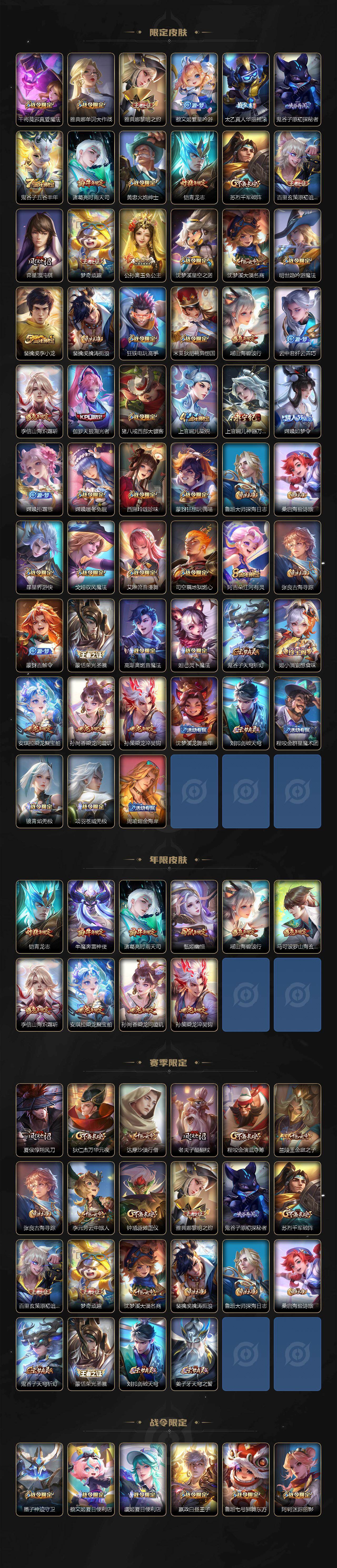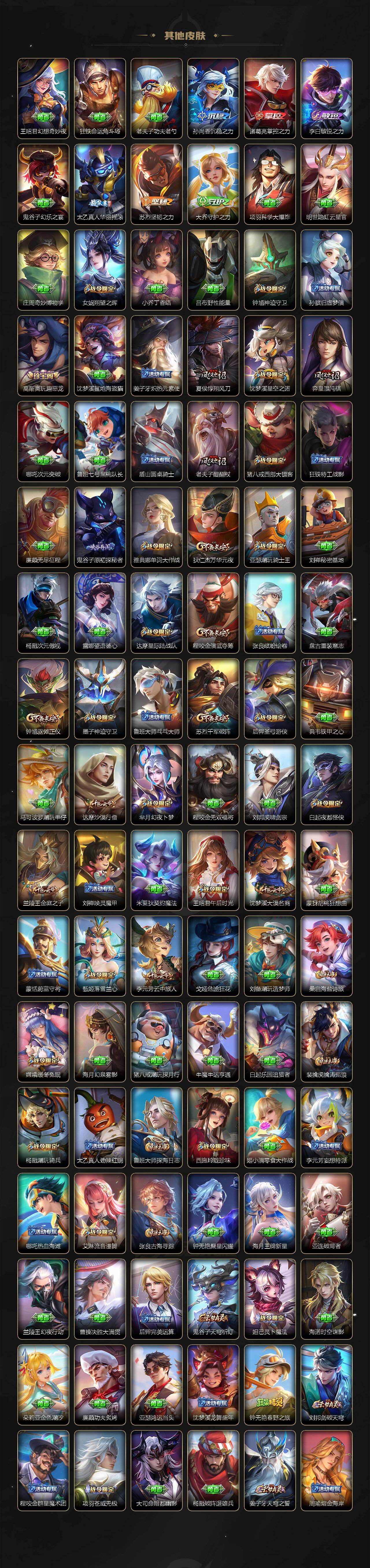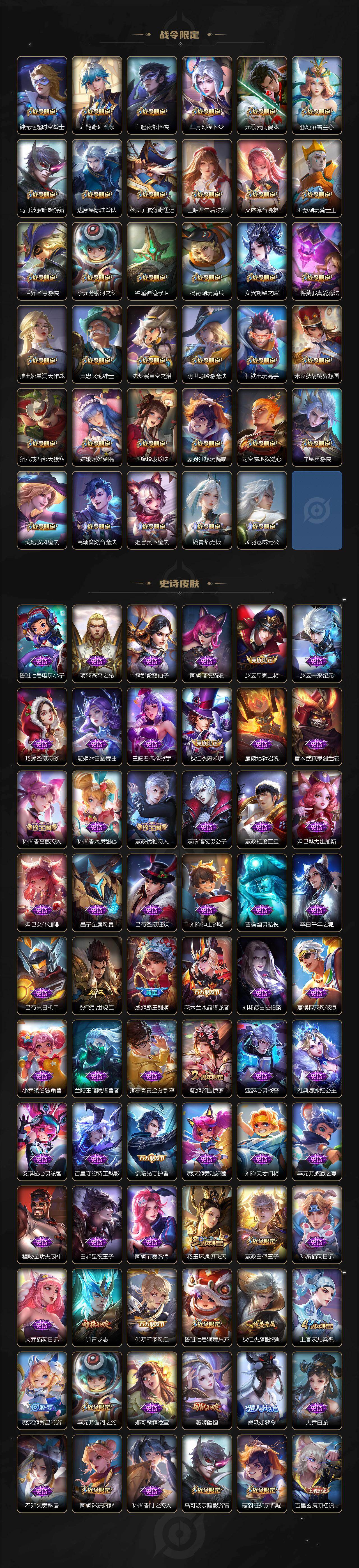 【限定皮肤】:蔡文姬夏日便利店,虞姬夏日便利店,姜子牙天穹之誓,杨戬破阵退雄兵,狄仁杰阴阳师,赵云皇家上将,墨子神迹守卫,嬴政优雅恋人,嬴政白昼王子,孙尚香蔷薇恋人,鲁班七号狮舞东方,庄周高山流水,高渐离玩趣恶龙,阿轲迷踪丽影,钟无艳超时空战士,扁鹊奇幻香踪,白起夜都怪侠,芈月白晶晶,芈月幻夜卜梦,吕布遇见神鼓,元歌云间偶戏,元歌无心,夏侯惇朔风刀,甄姬幽恒,甄姬游园惊梦,甄姬落雪兰心,马可波罗暗影游猎,马可波罗山海玄木吟,狄仁杰魔术师,狄仁杰万华元夜,达摩星际陆战队,达摩沙漠行僧,项羽海滩派对,老夫子醍醐杖,老夫子航海奇遇记,程咬金演武夺筹,韩信傲雪梅枪,王昭君午后时光,兰陵王金庭之子,花木兰默契交锋,不知火舞绯月行,亚瑟潮玩骑士王,牛魔奔雷神使,后羿圣弓游侠,李元芳银河之约,李元芳云中旅人,虞姬霸王别姬,虞姬启明星使,钟馗神迹守卫,钟馗驱傩正仪,杨玉环遇见飞天,杨戬潮玩骑兵,女娲朔望之晖,女娲补天,干将莫邪真爱魔法,雅典娜单词大作战,雅典娜黎明之约,蔡文姬繁星吟游,太乙真人华丽摇滚,鬼谷子原初探秘者,鬼谷子五谷丰年,诸葛亮时雨天司,黄忠火炮绅士,铠青龙志,苏烈千军破阵,百里玄策原初追逐者,弈星混沌棋,梦奇顽趣,公孙离玉兔公主,沈梦溪星空之诺,沈梦溪大漠名商,明世隐吟游魔法,裴擒虎李小龙,裴擒虎擒涛扼浪,狂铁电玩高手,米莱狄胡桃异想国,瑶山海碧波行,云中君纤云弄巧,李信山海炽霜斩,伽罗天狼溯光者,猪八戒西部大镖客,上官婉儿梁祝,上官婉儿神器万象笔,嫦娥如梦令,嫦娥拒霜思,嫦娥暖冬兔眠,西施玲