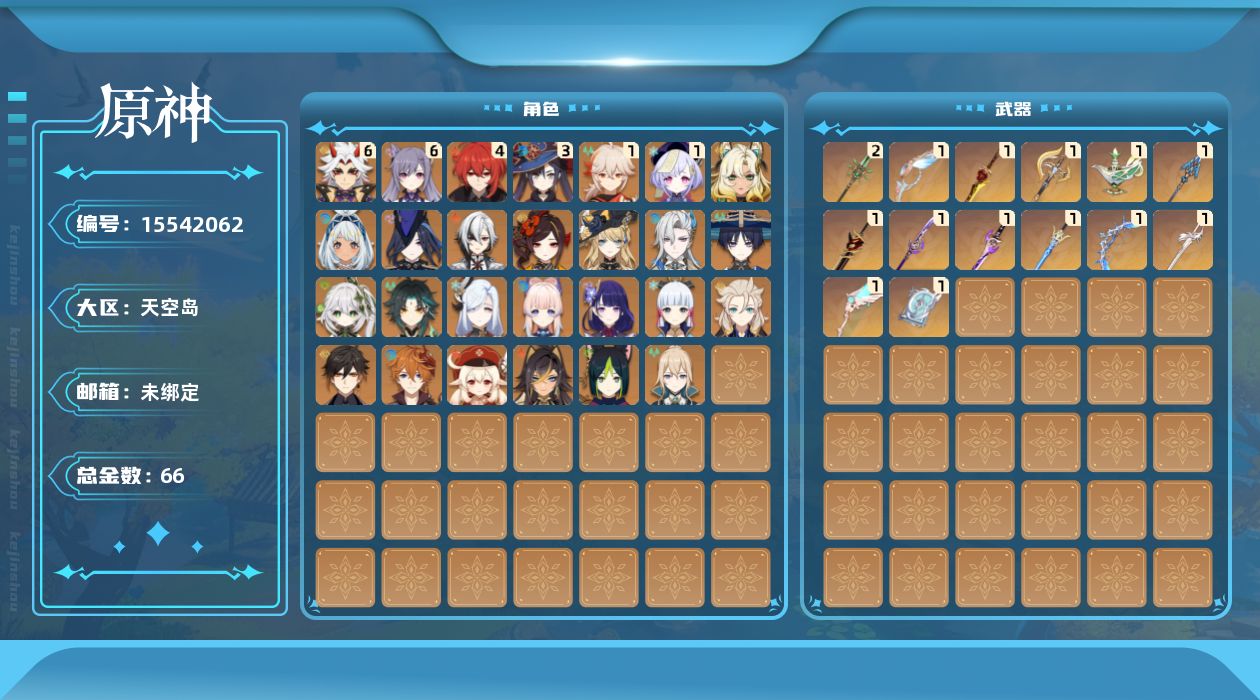 0命克洛琳德,0命阿蕾奇诺,0命千织,0命娜维娅,0命那维莱特,0命迪希雅,0命流浪者,0命纳西妲,0命提纳里,0命申鹤,满命荒泷一斗,0命雷电将军,1命枫原万叶,0命神里绫华,0命钟离,0命魈,0命可莉,0命达达利亚,0命阿贝多,0命珊瑚宫心海,满命刻晴,1命七七,0命琴,3命莫娜,4命迪卢克,0命希诺宁,0命玛拉妮,0命菲林斯,精1白雨心弦,精1有乐御簾切,精1裁断,精1千夜浮梦,精1息灾,精1赤角石溃杵,精1冬极白星,精1薙草之稻光,精1雾切之回光,精1苍古自由之誓,精1四风原典,精2和璞鸢,精1天空之翼,精1风鹰剑